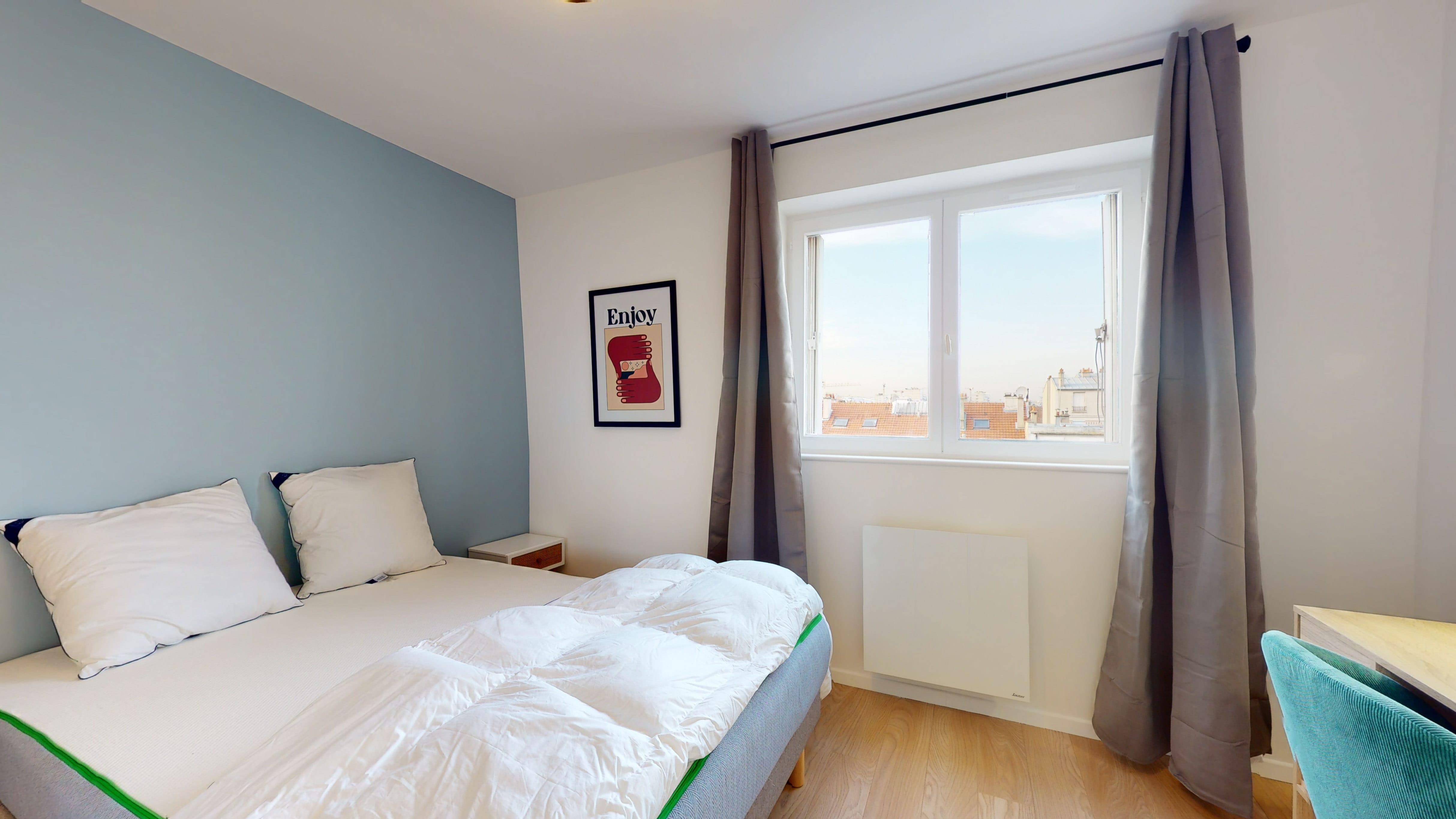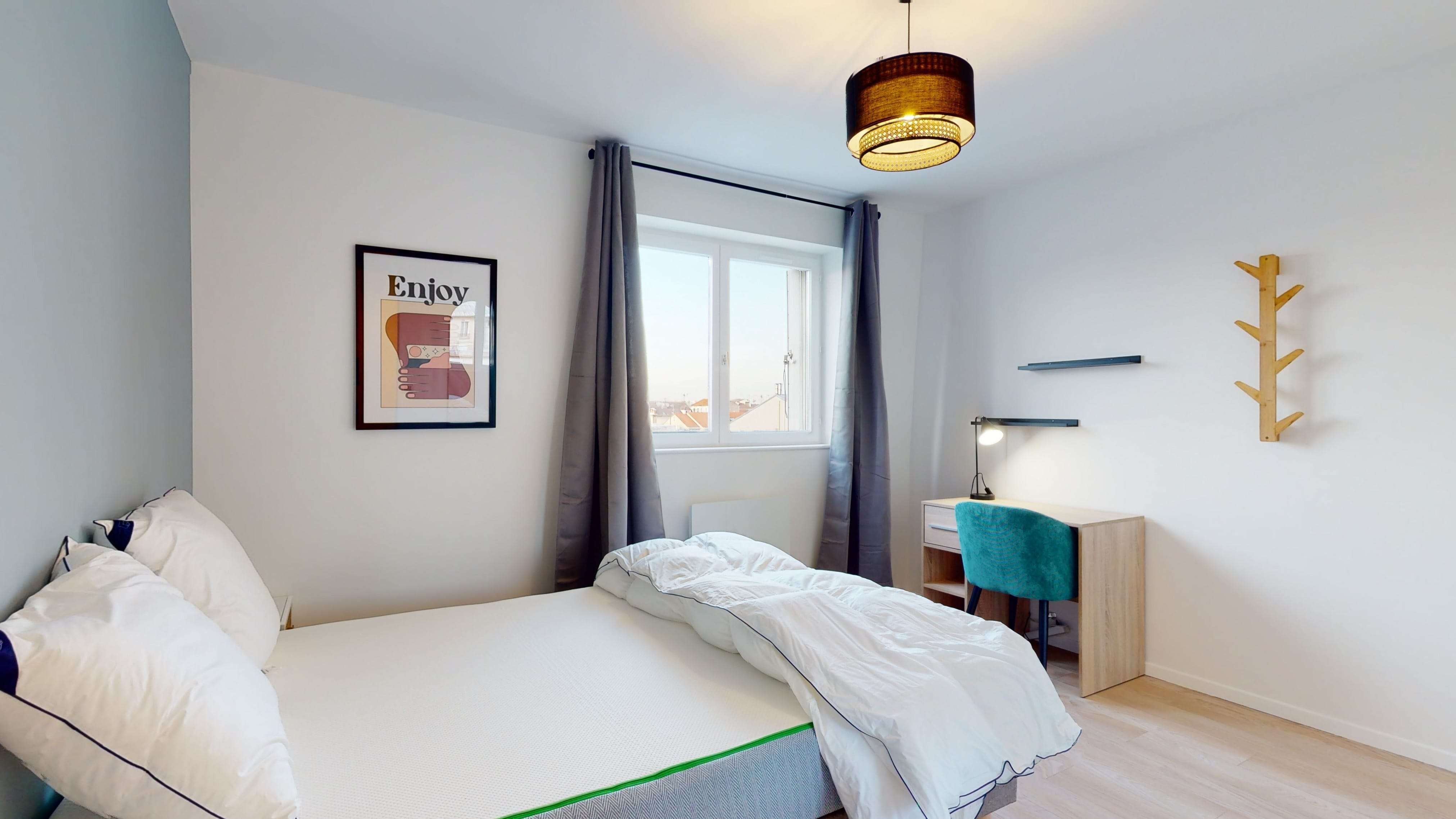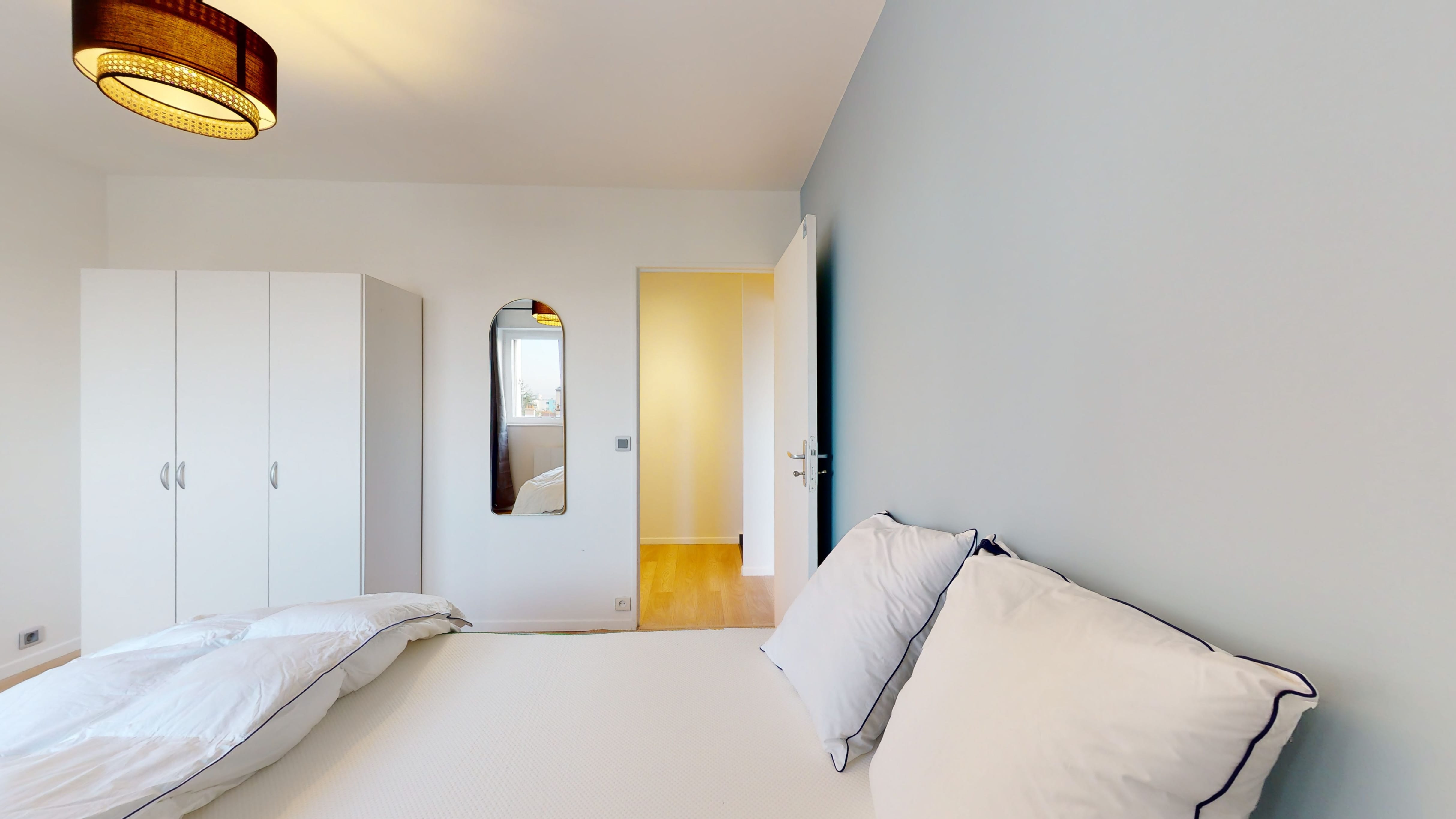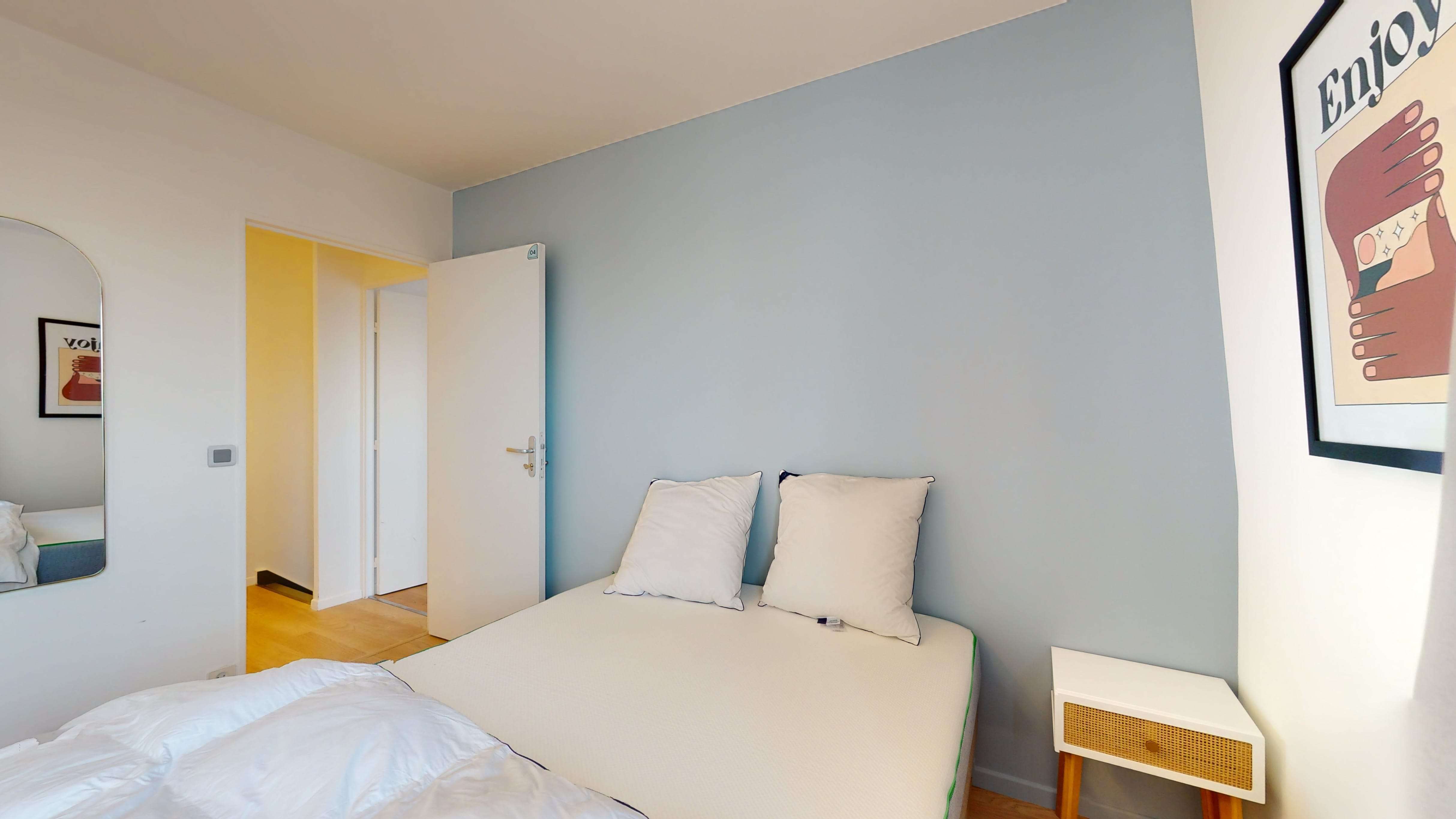 La chambre que nous proposons, Room 2, est faite juste pour toi. Elle a un lit double confortable pour bien dormir, une armoire pour ranger toutes tes affaires, un bureau et une chaise pour travailler ou étudier. Tu partageras une salle de bain avec douche et toilettes avec d'autres locataires.