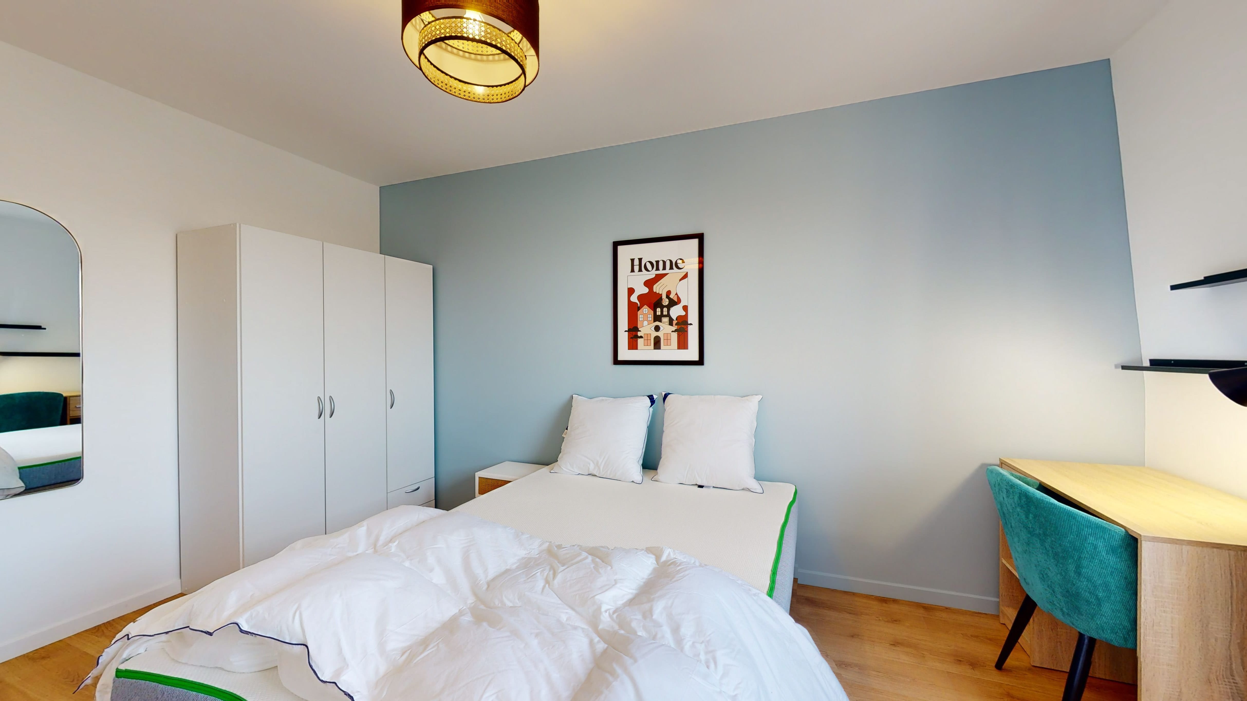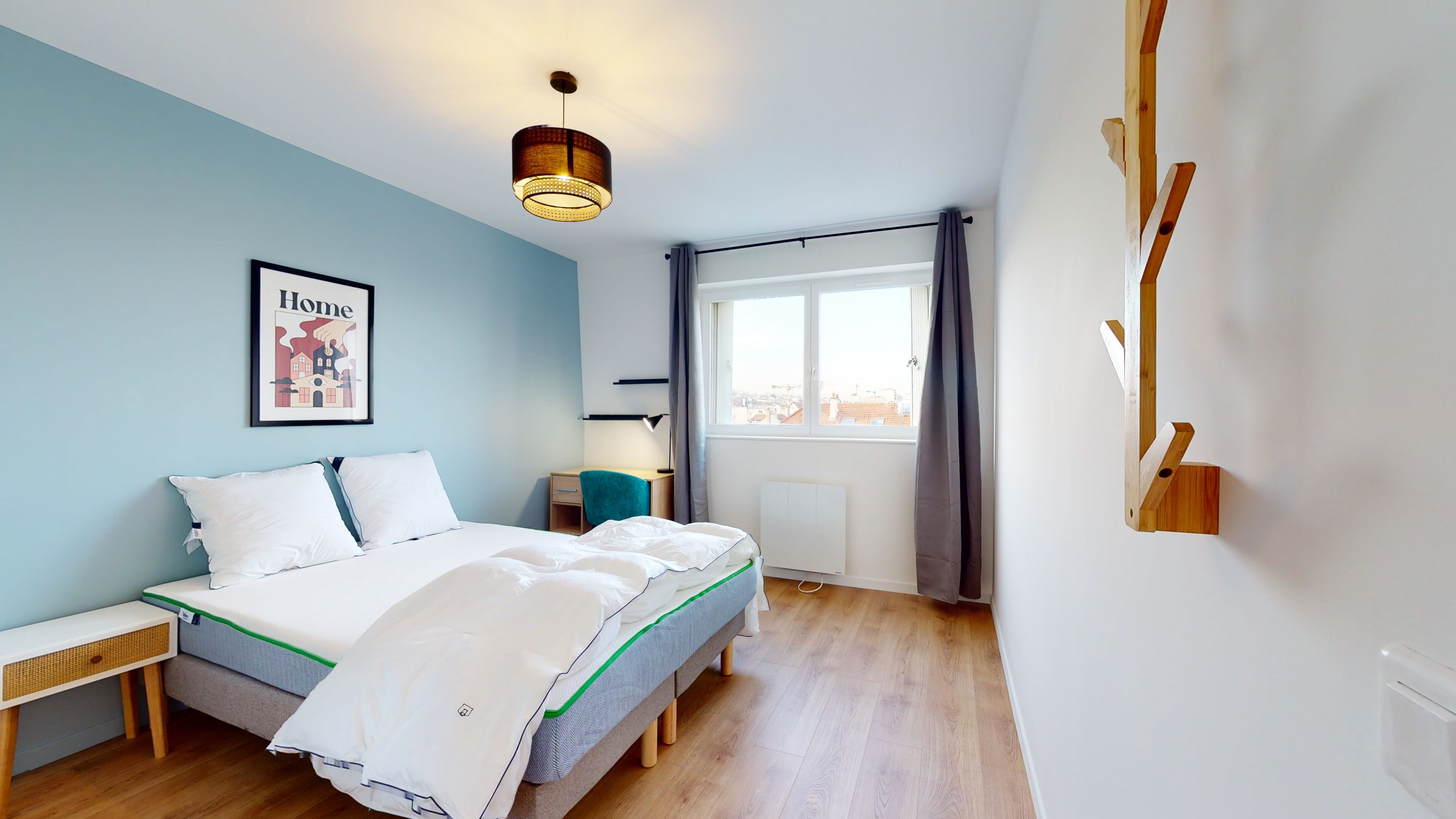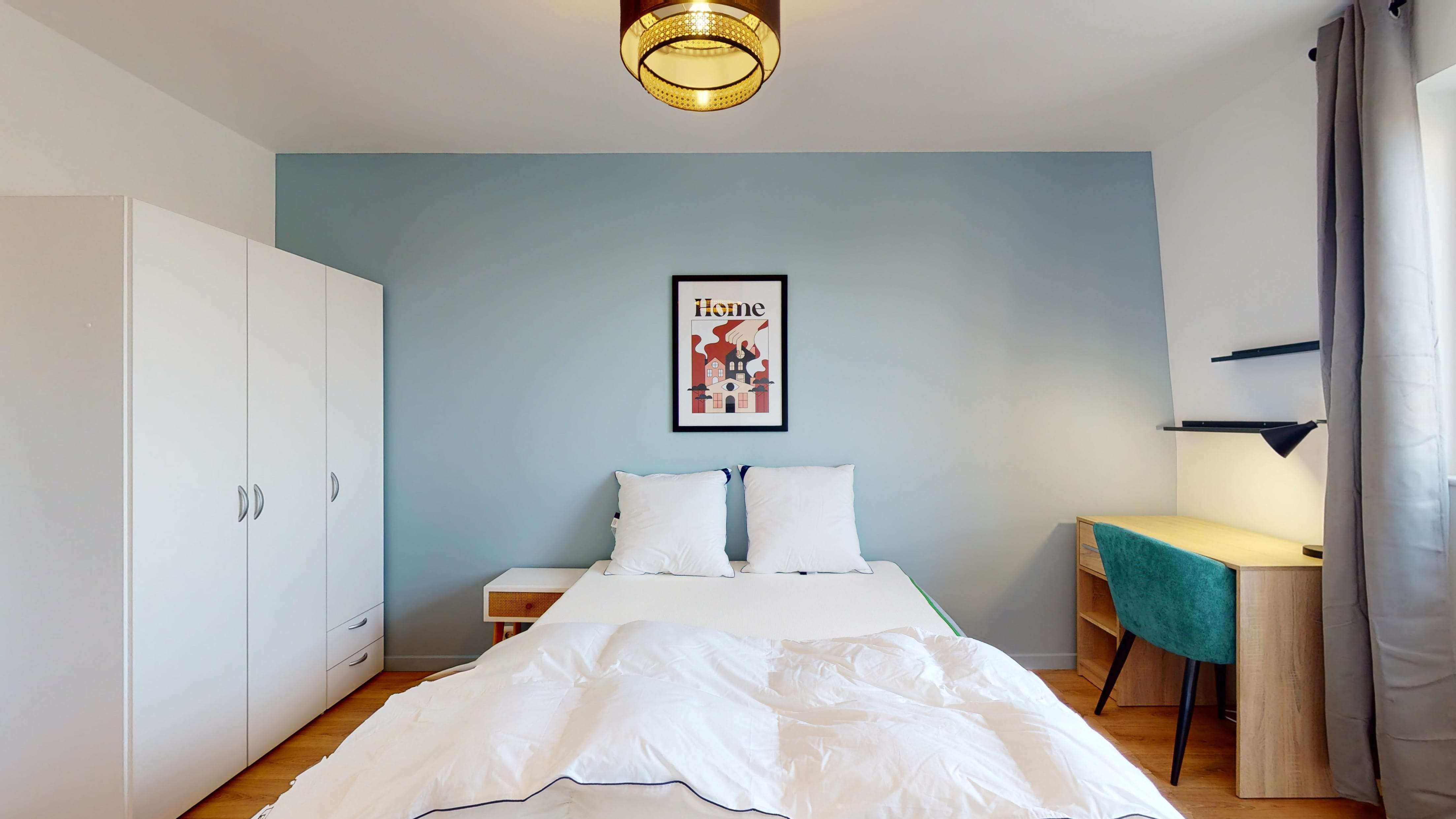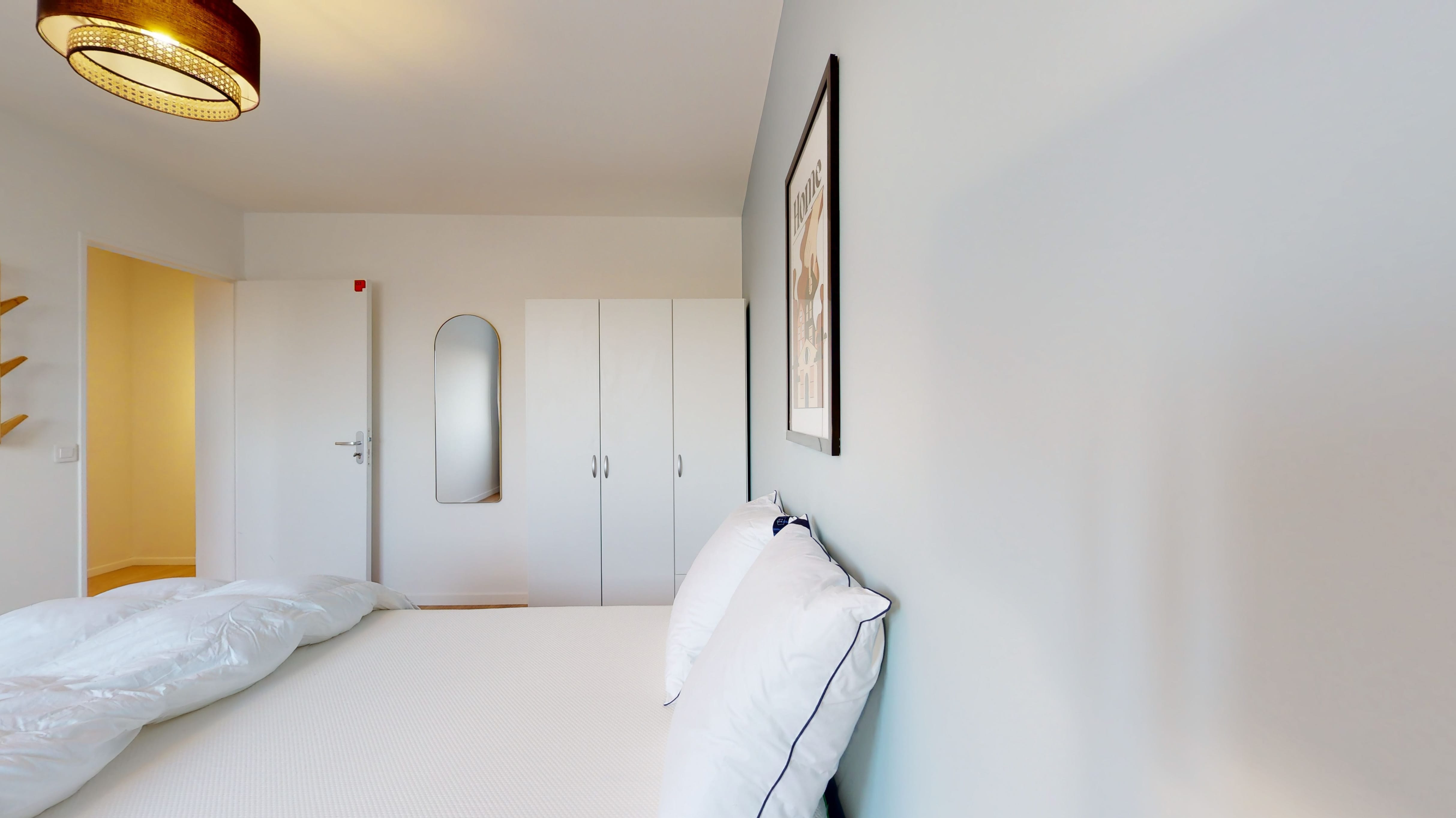 La chambre que nous proposons, Room 3, est spécialement conçue pour une personne. Avec ses 12 m², elle offre un lit double confortable, une armoire pour ranger toutes tes affaires, une chaise et un bureau pour travailler ou étudier. Tu partageras une salle de bain moderne avec douche et toilettes avec d'autres locataires de l'appartement.