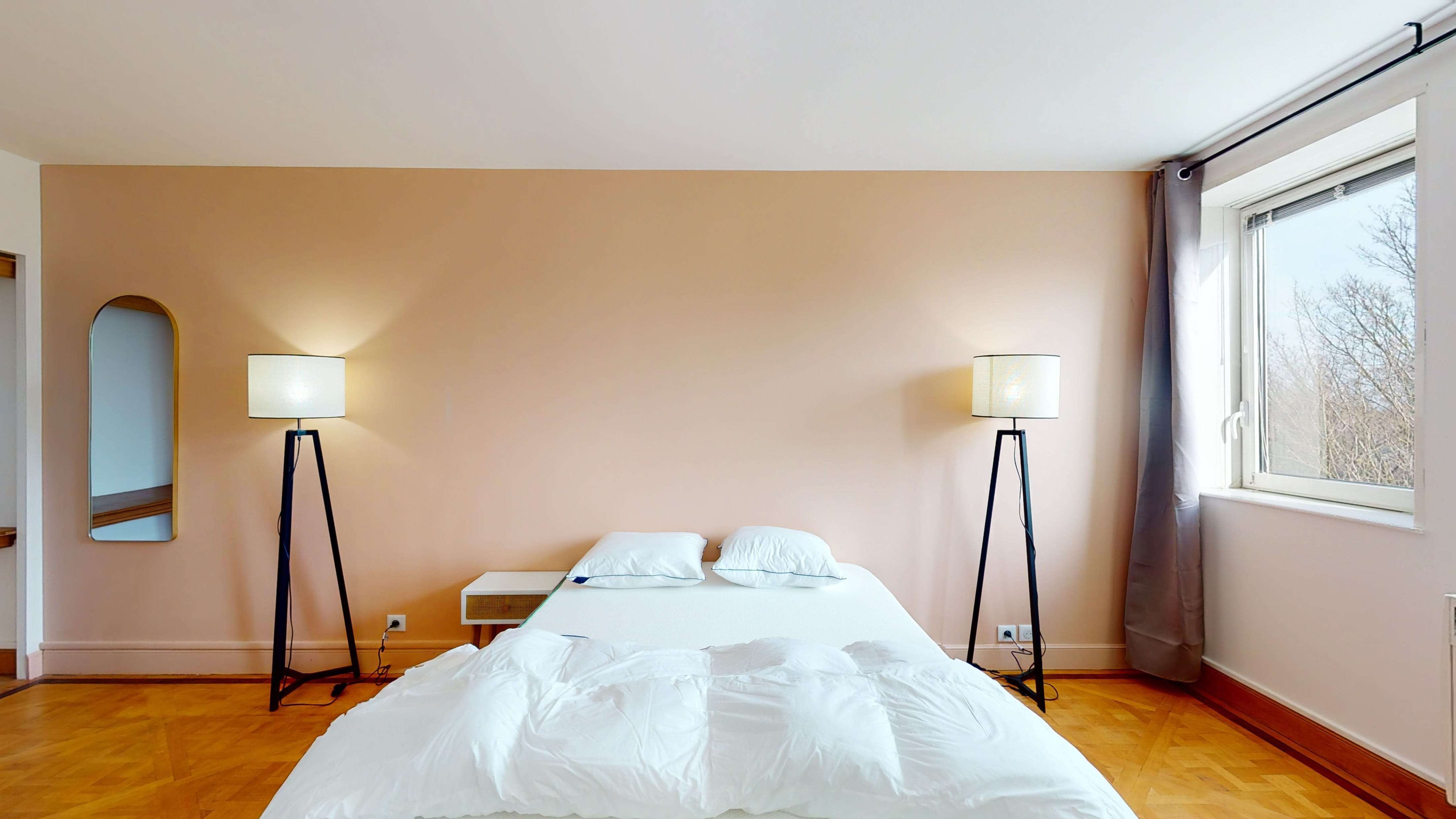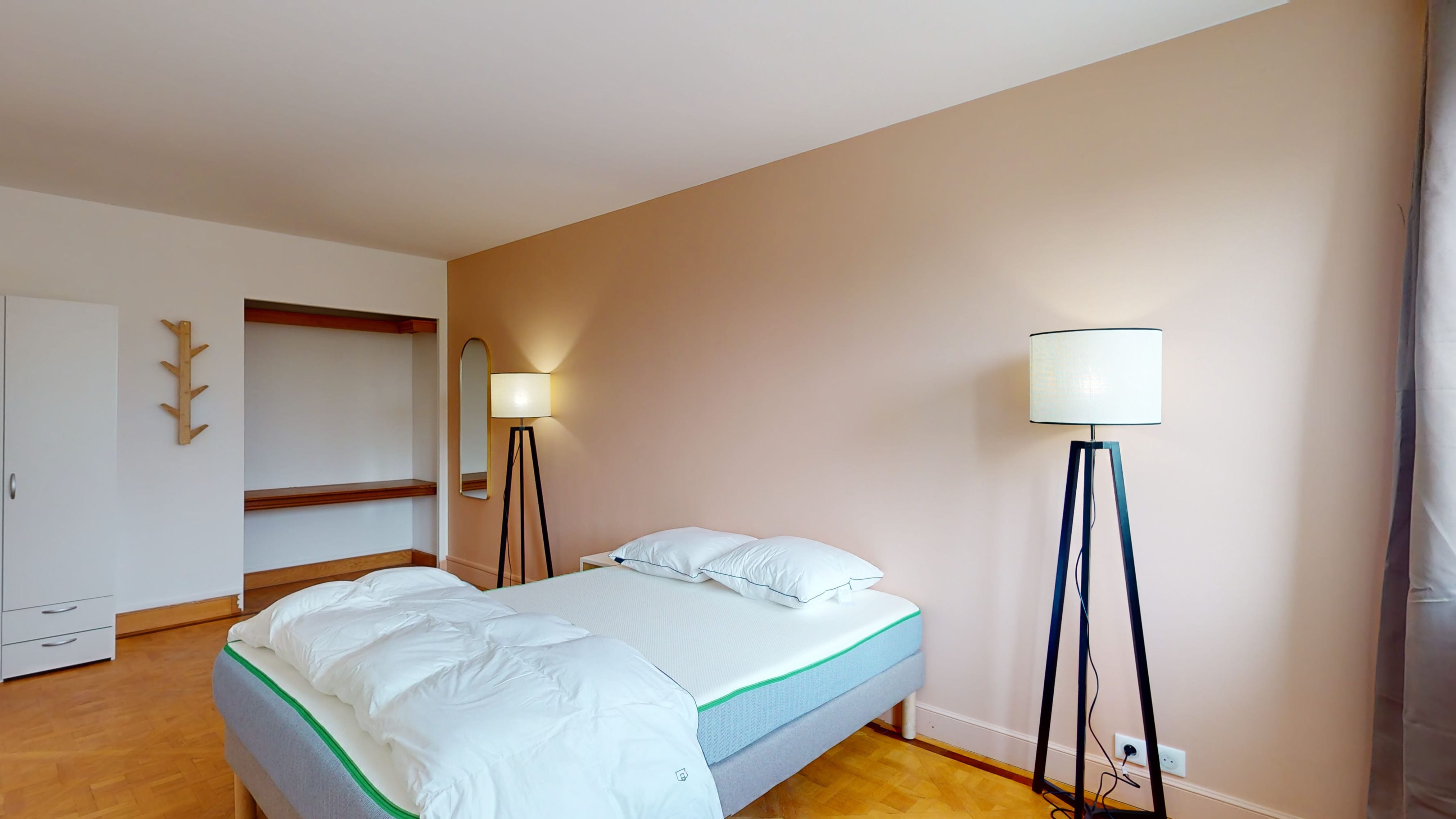 Votre future chambre, Room 6, est conçue pour votre bien-être personnel. Sur ses 18 m², elle offre un lit double confortable, une armoire pour vos affaires, une chaise et un bureau pour étudier ou travailler. Vous partagerez une salle de bain propre et moderne avec d'autres locataires.