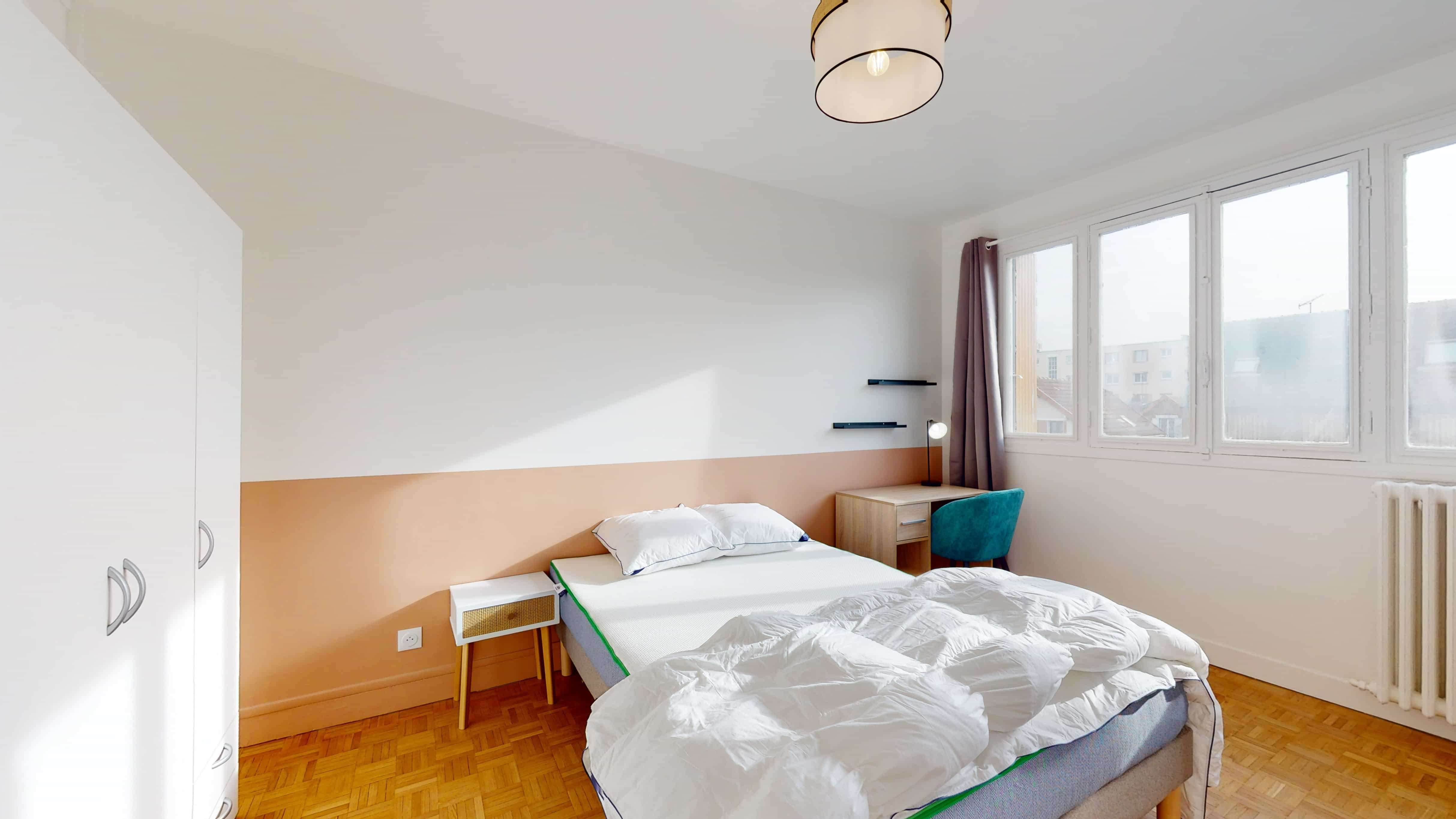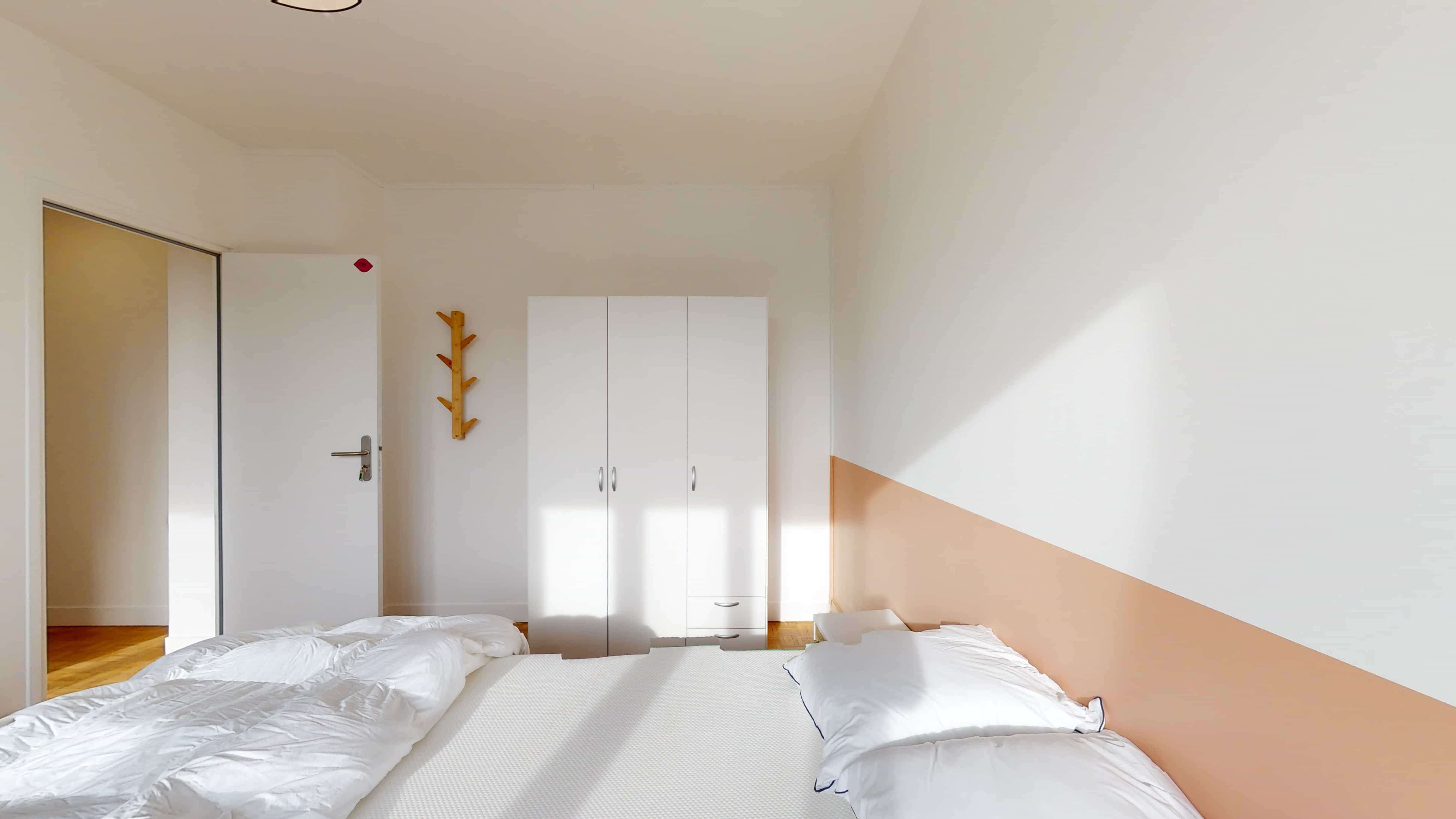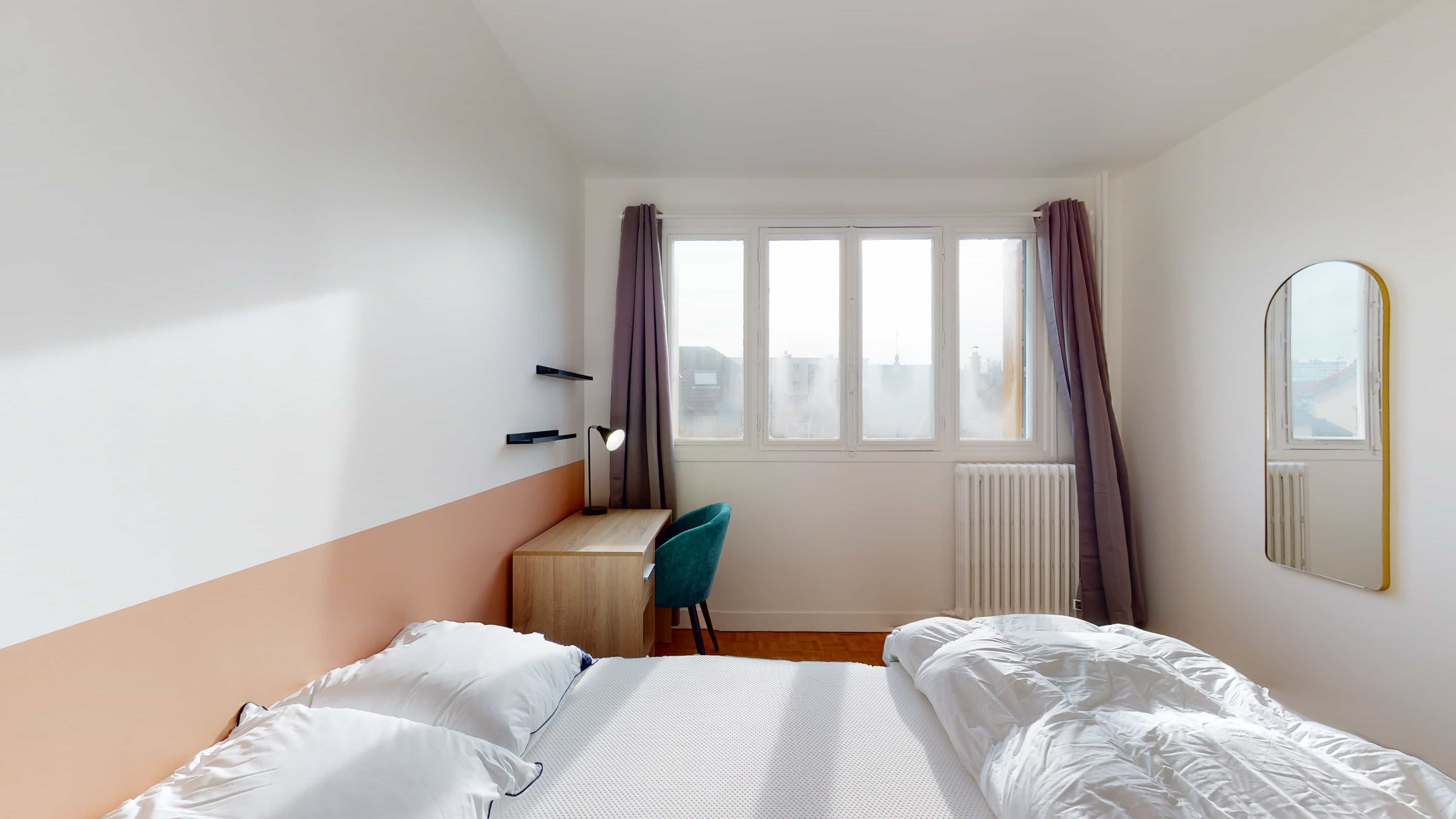 Room 6 est juste pour vous ! Cette chambre de 13 m² est faite pour une personne. Elle a un lit double confortable, une armoire pour toutes vos affaires, un bureau et une chaise pour travailler ou étudier. Vous partagerez une salle de bain, qui a une douche et des toilettes, avec d'autres locataires.