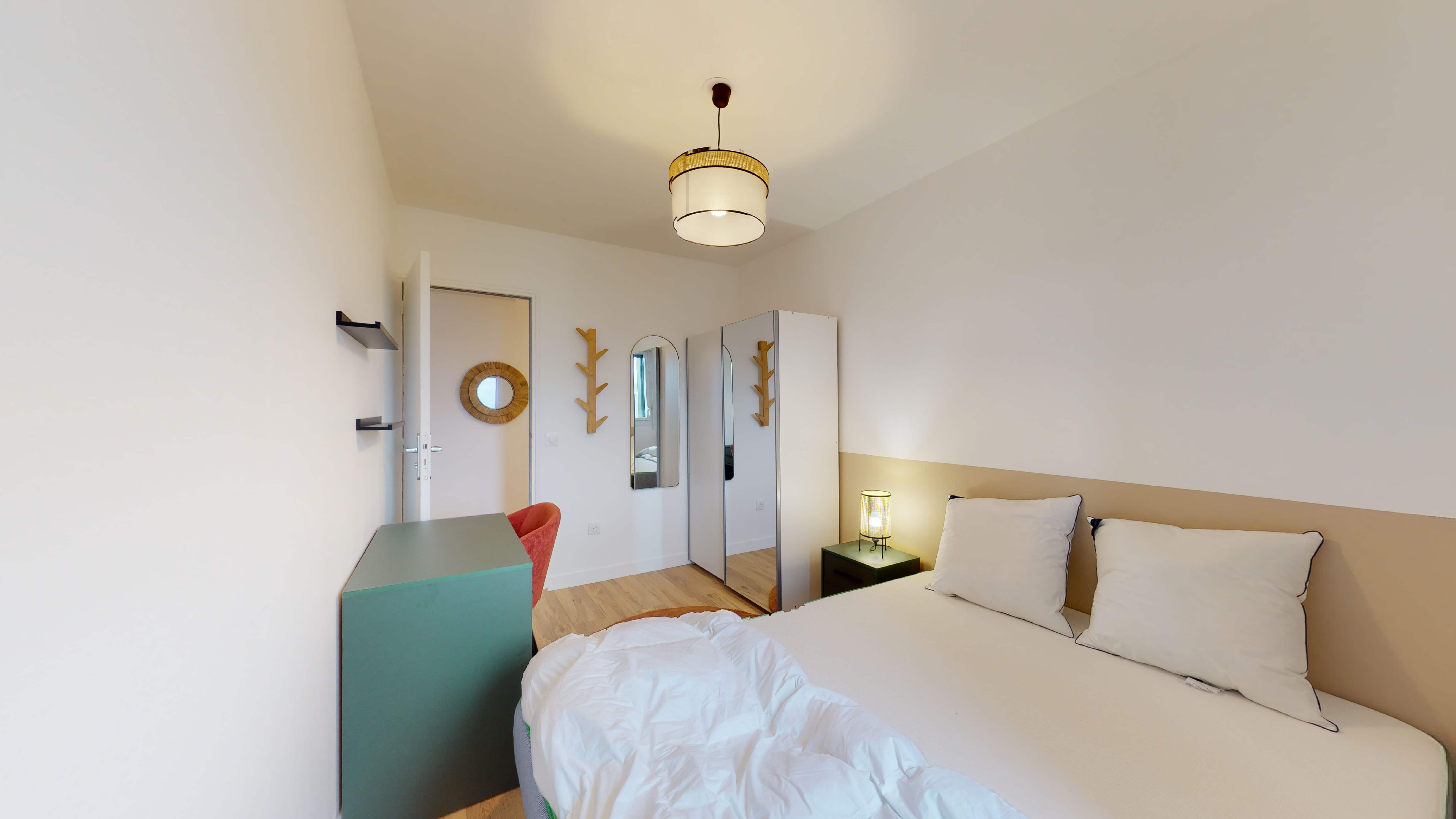 La chambre Room 4, destinée à une seule personne, est un espace confortable de 9 m². Elle est meublée d'un lit double avec une literie premium pour bien dormir, d'une armoire où ranger vos affaires, et d'un bureau pour étudier ou travailler. Vous partagerez une salle de bain moderne avec d'autres locataires, mais ne vous inquiétez pas, il y a aussi un WC séparé pour éviter les embouteillages le matin !