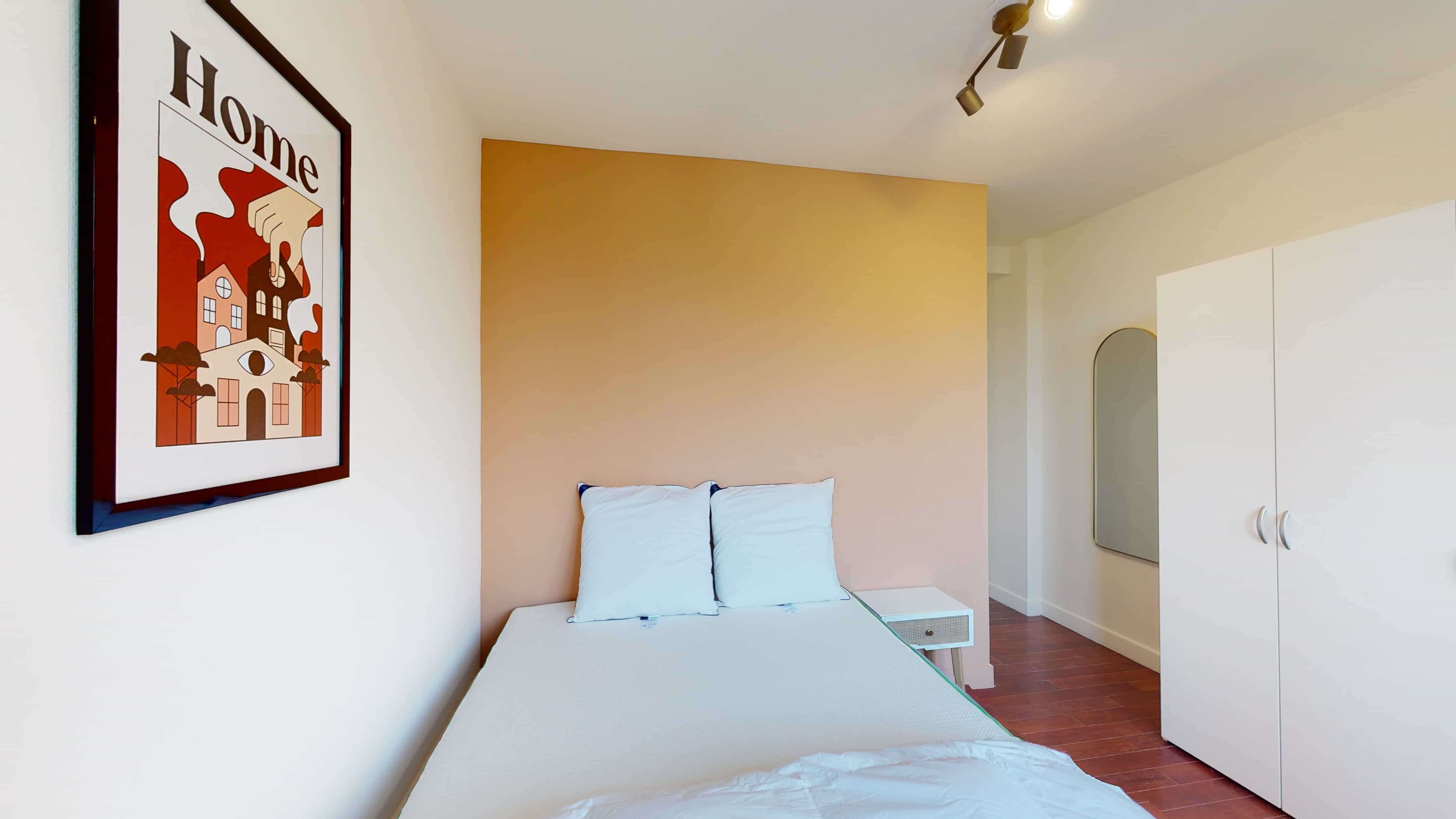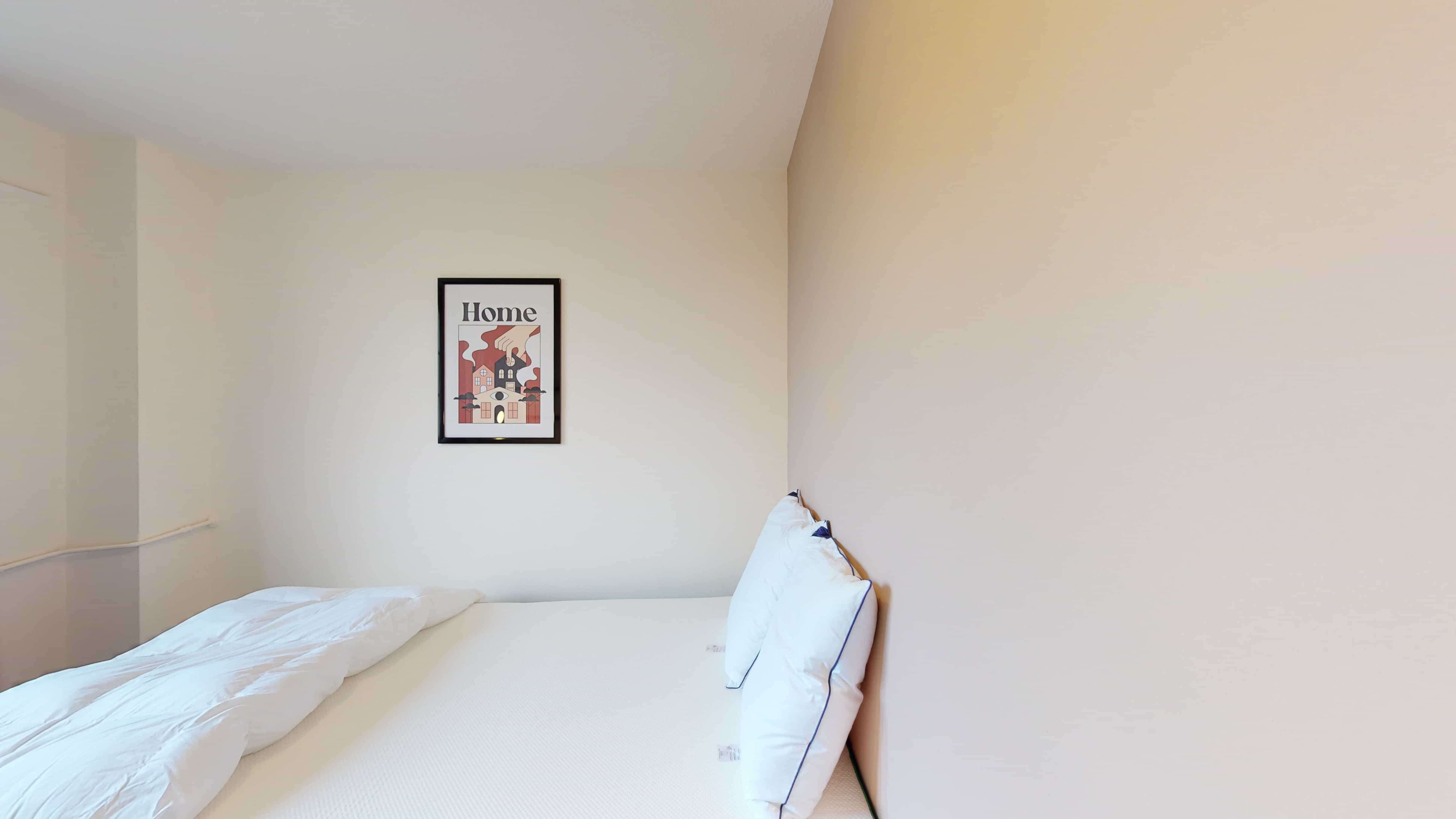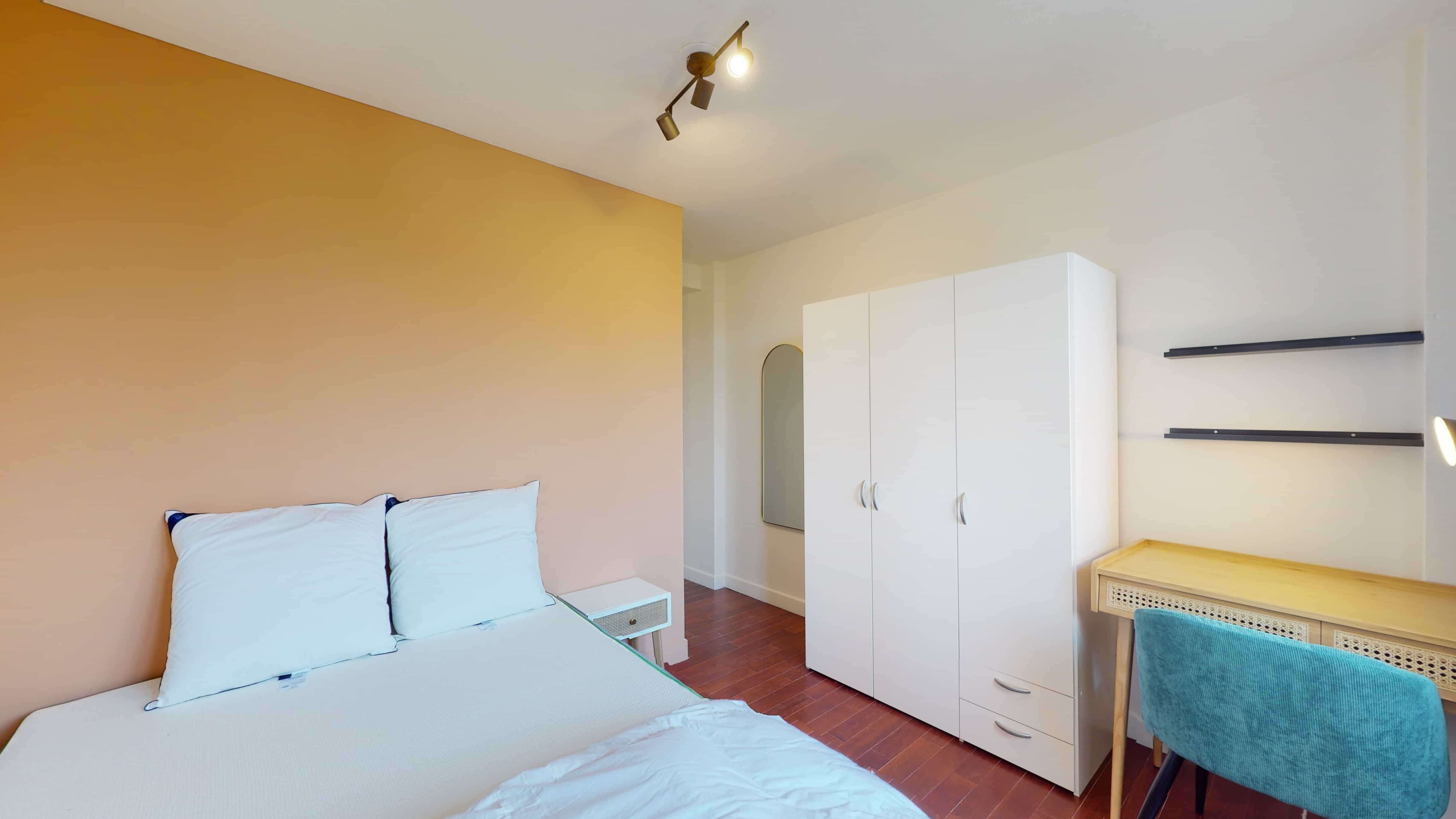 La chambre "Room 3" est spécialement conçue pour être votre petit coin personnel. Elle dispose d'un lit double confortable avec de la literie de qualité, une armoire pour vos vêtements, un bureau et une chaise pour travailler ou étudier tranquillement. Elle partage une salle de bains moderne avec douche et toilettes.