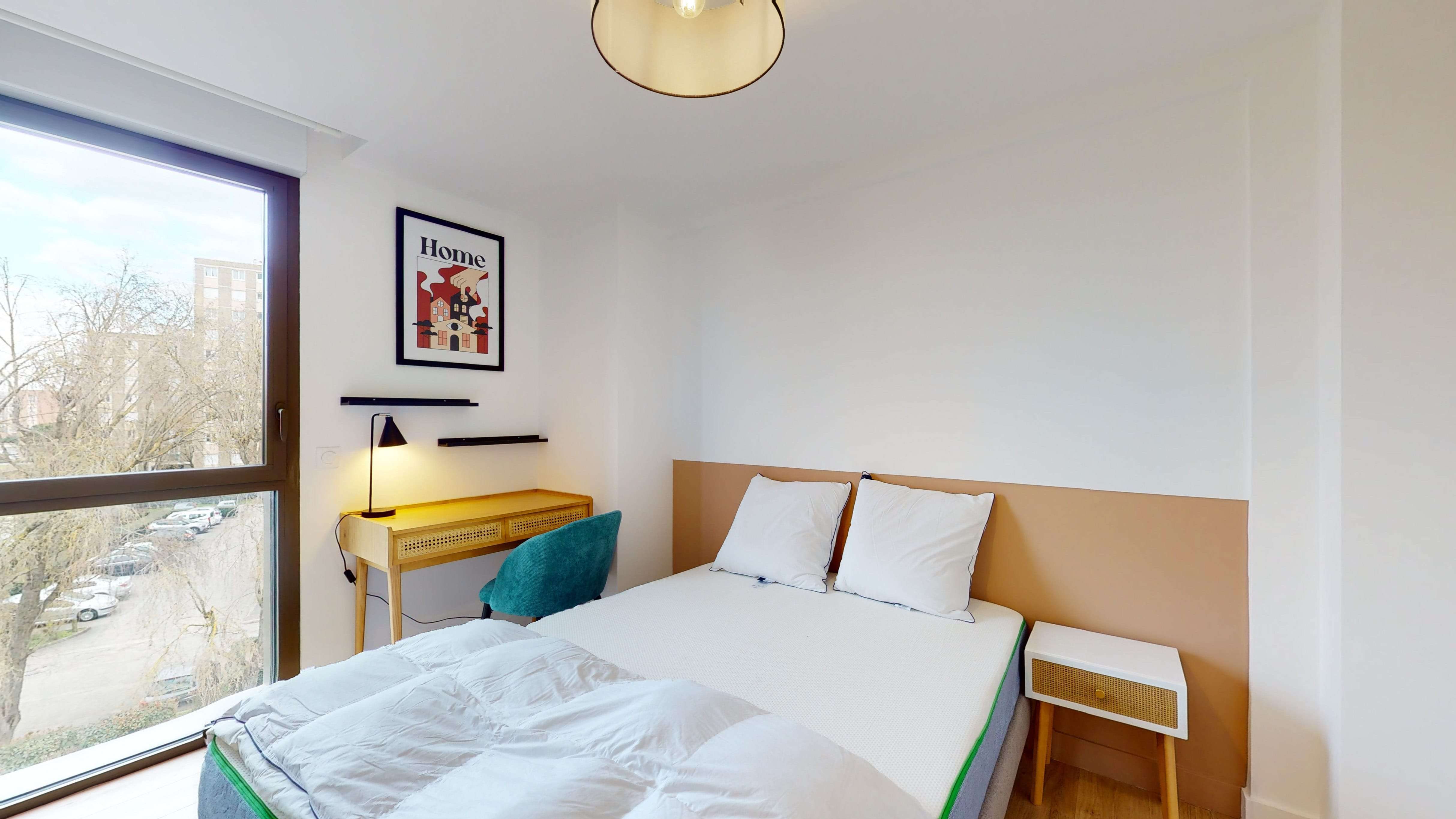 Room 2 est faite rien que pour vous! Elle a tout ce qu'il faut pour être bien : un grand lit douillet, une armoire pour vos vêtements, une chaise et un bureau pour travailler ou étudier. Vous partagerez une salle de bain avec douche et toilettes avec d'autres locataires.