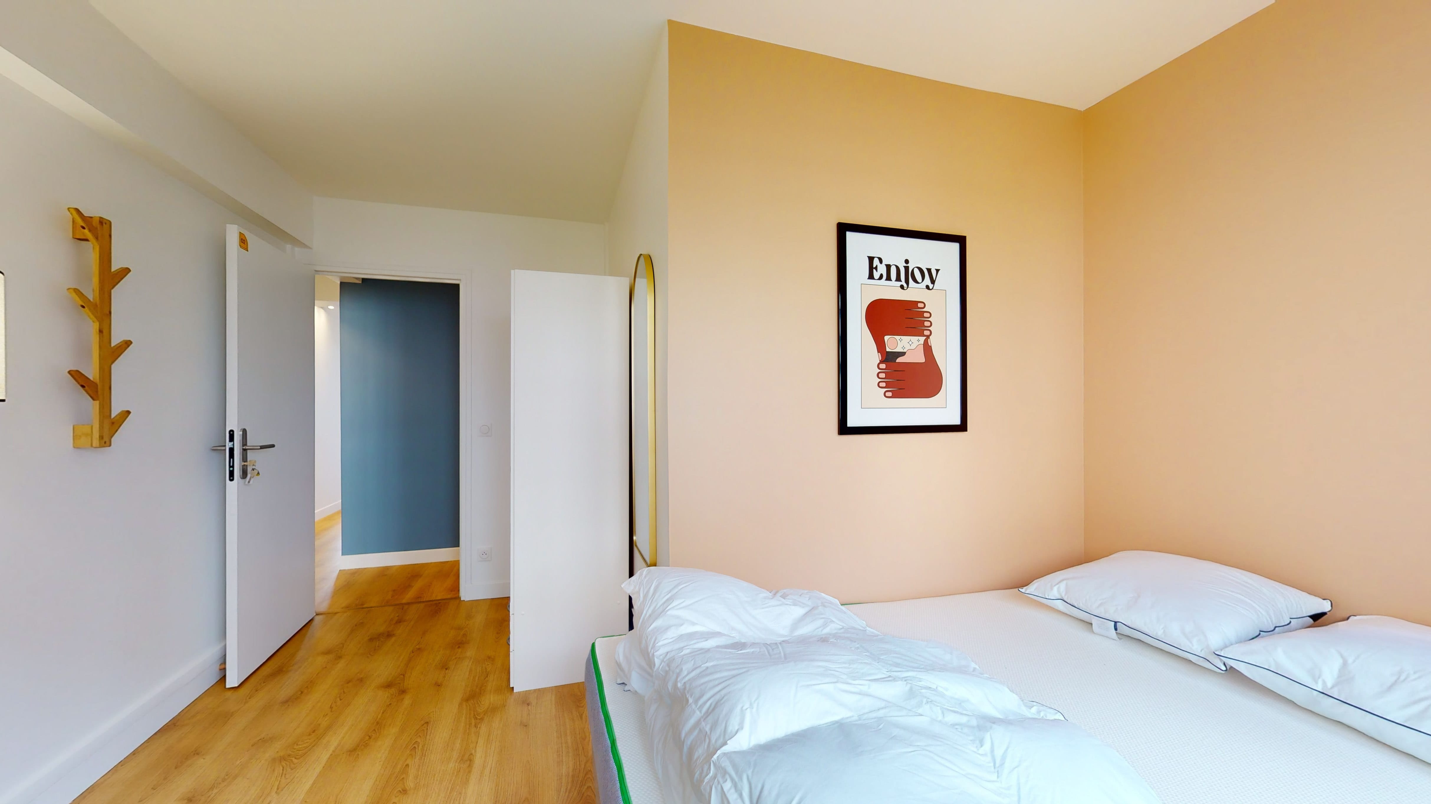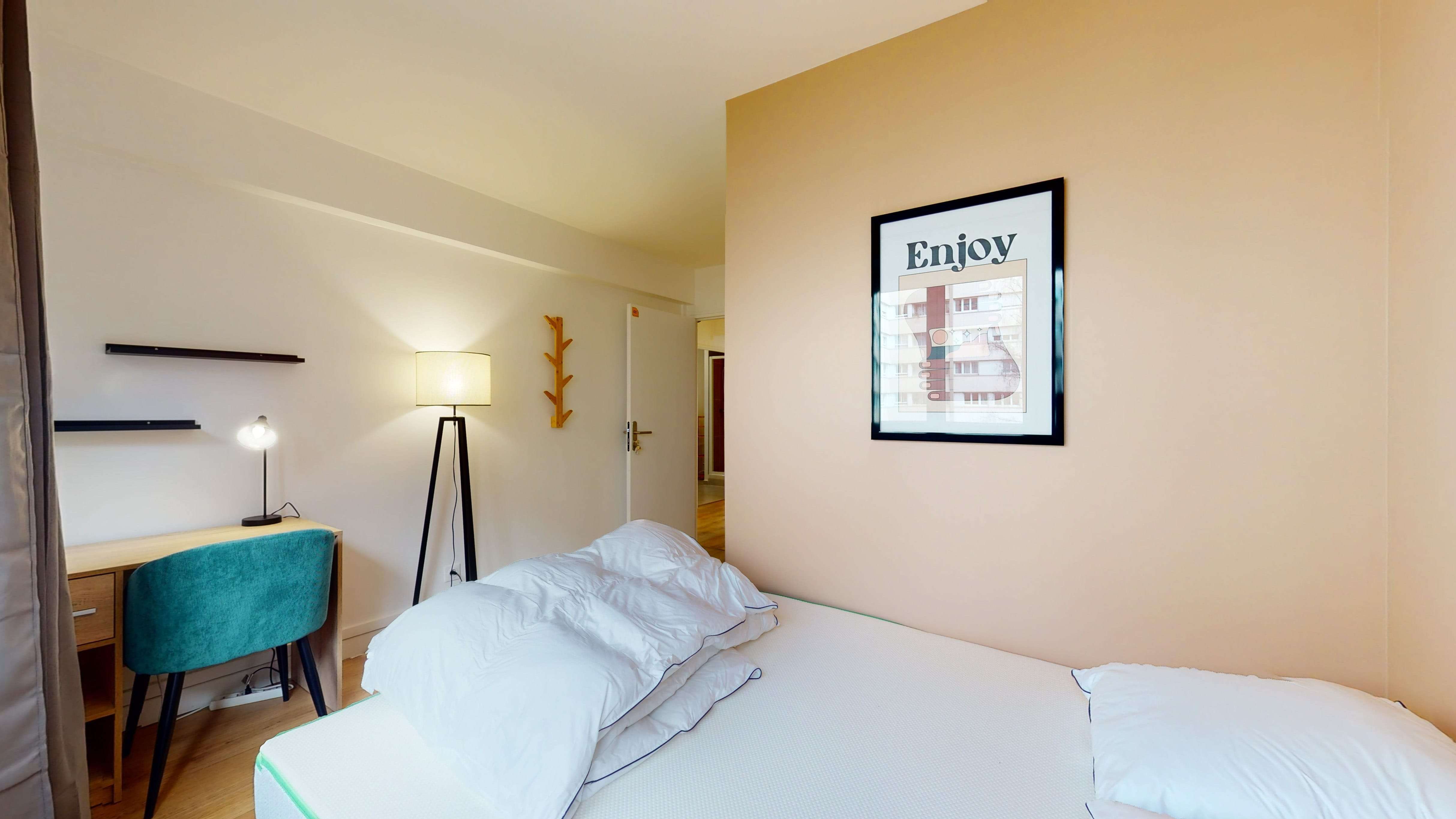 La chambre "Room 2", conçue pour une seule personne, est un espace cosy de 10 m². Elle comprend un lit double confortable pour bien dormir, une armoire pour ranger vos affaires, ainsi qu'une chaise et un bureau parfaits pour étudier ou travailler. La chambre partage une salle de bain avec douche et WC avec d'autres locataires.