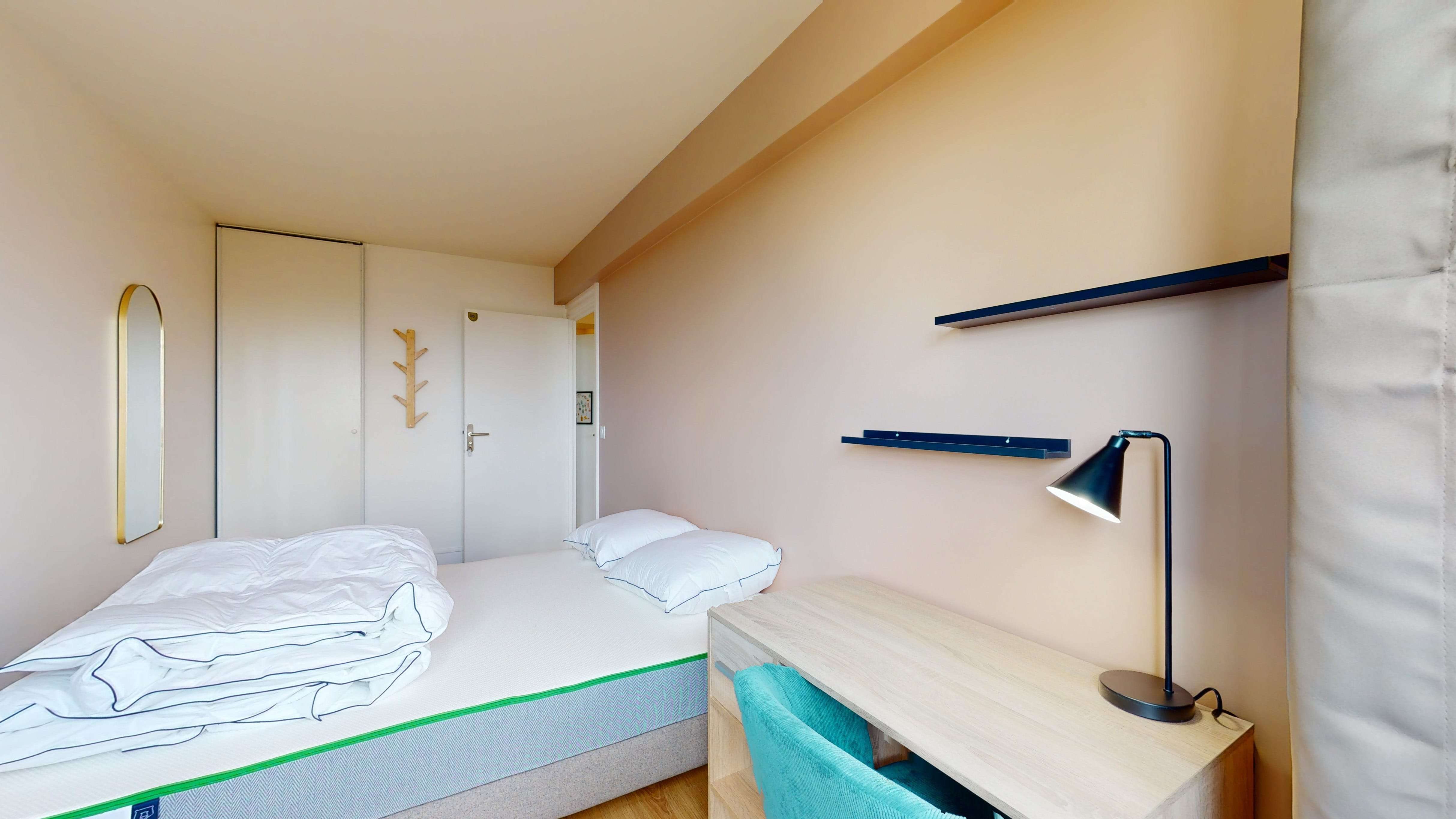 La "Room 5" est spécialement conçue pour une personne. Elle offre un confortable lit double, une armoire pour ranger toutes vos affaires, ainsi qu'un bureau et une chaise pour étudier ou travailler tranquillement. Elle mesure 12 m² et partage une salle de bain avec d'autres locataires.