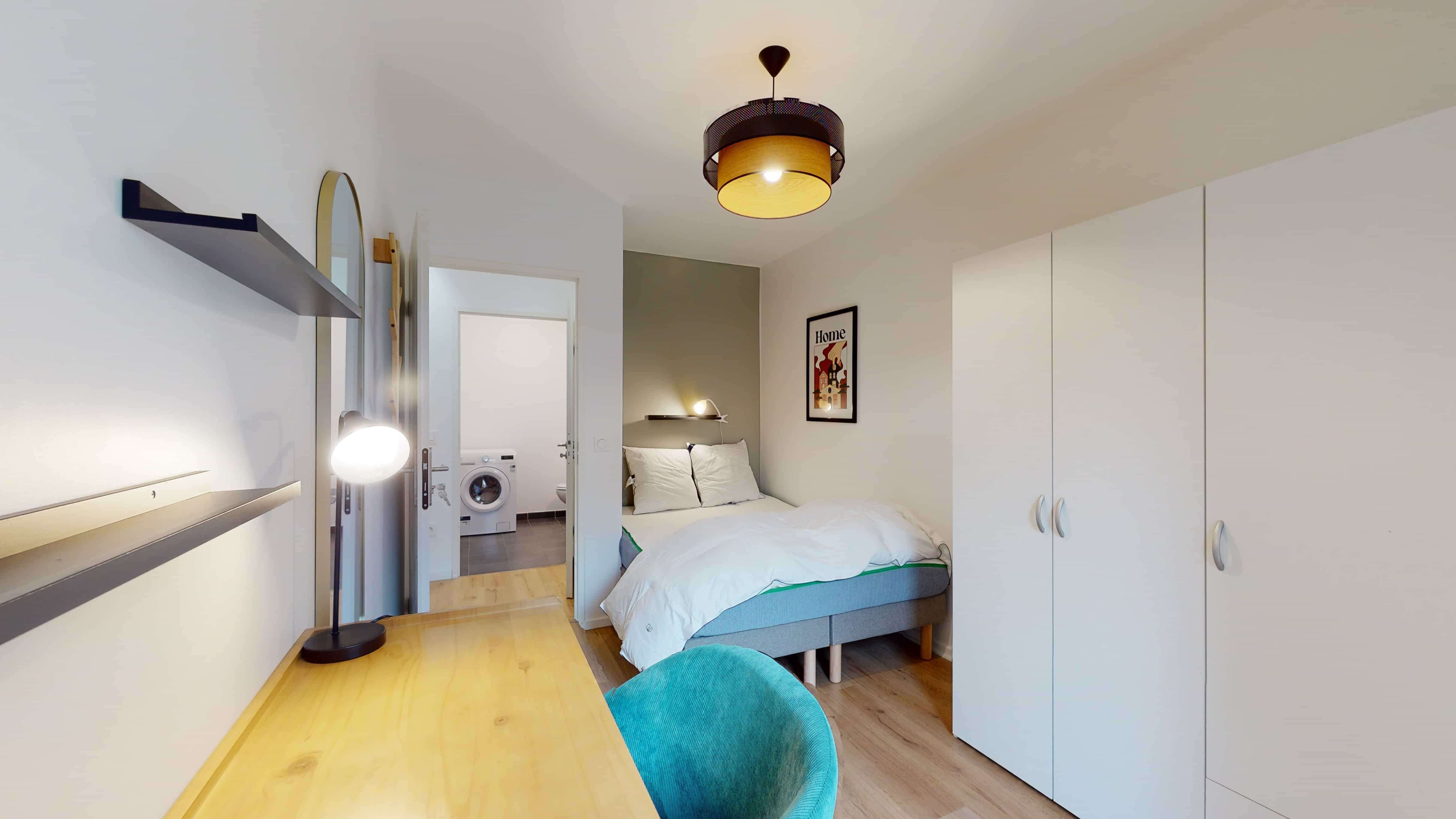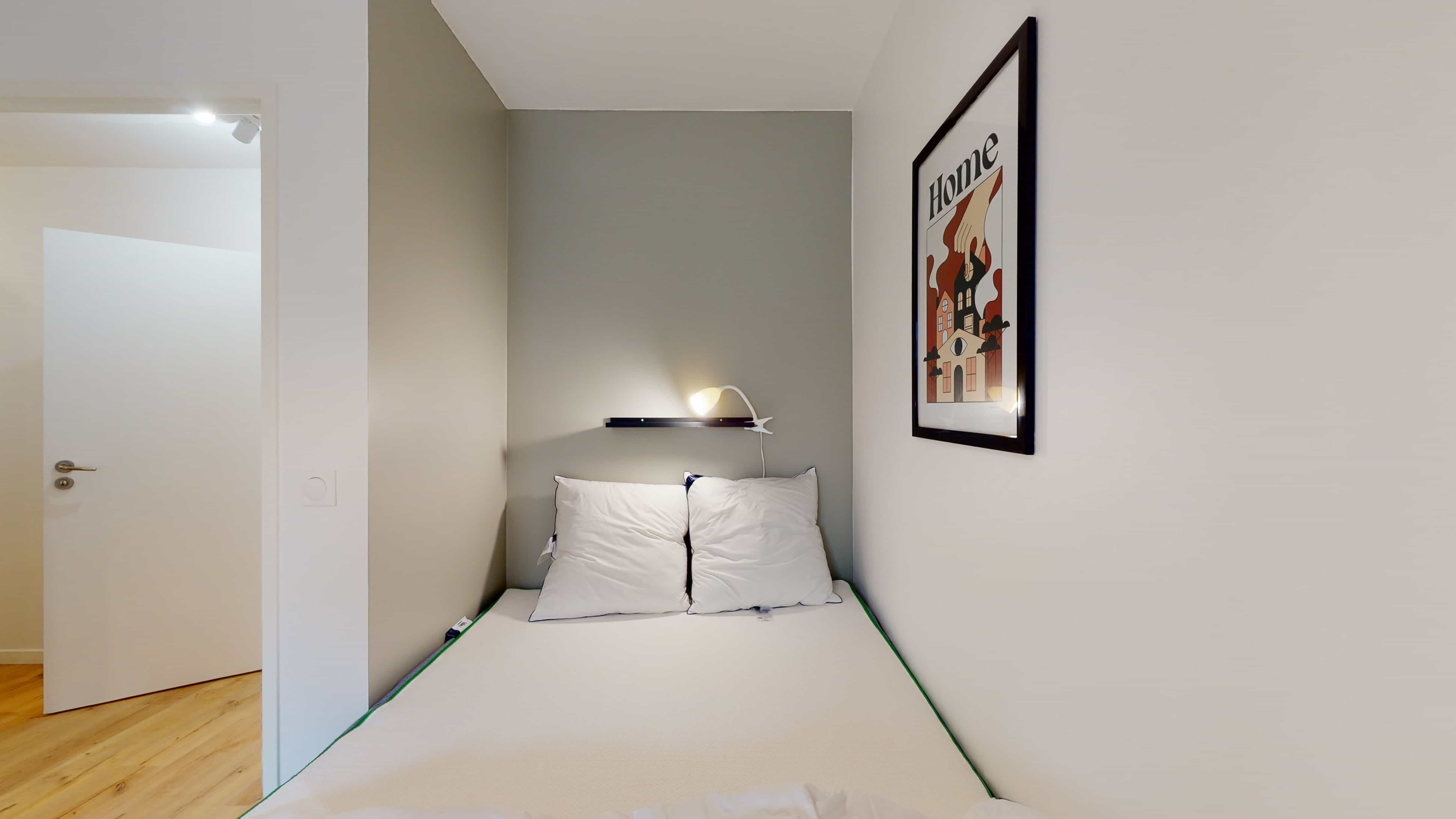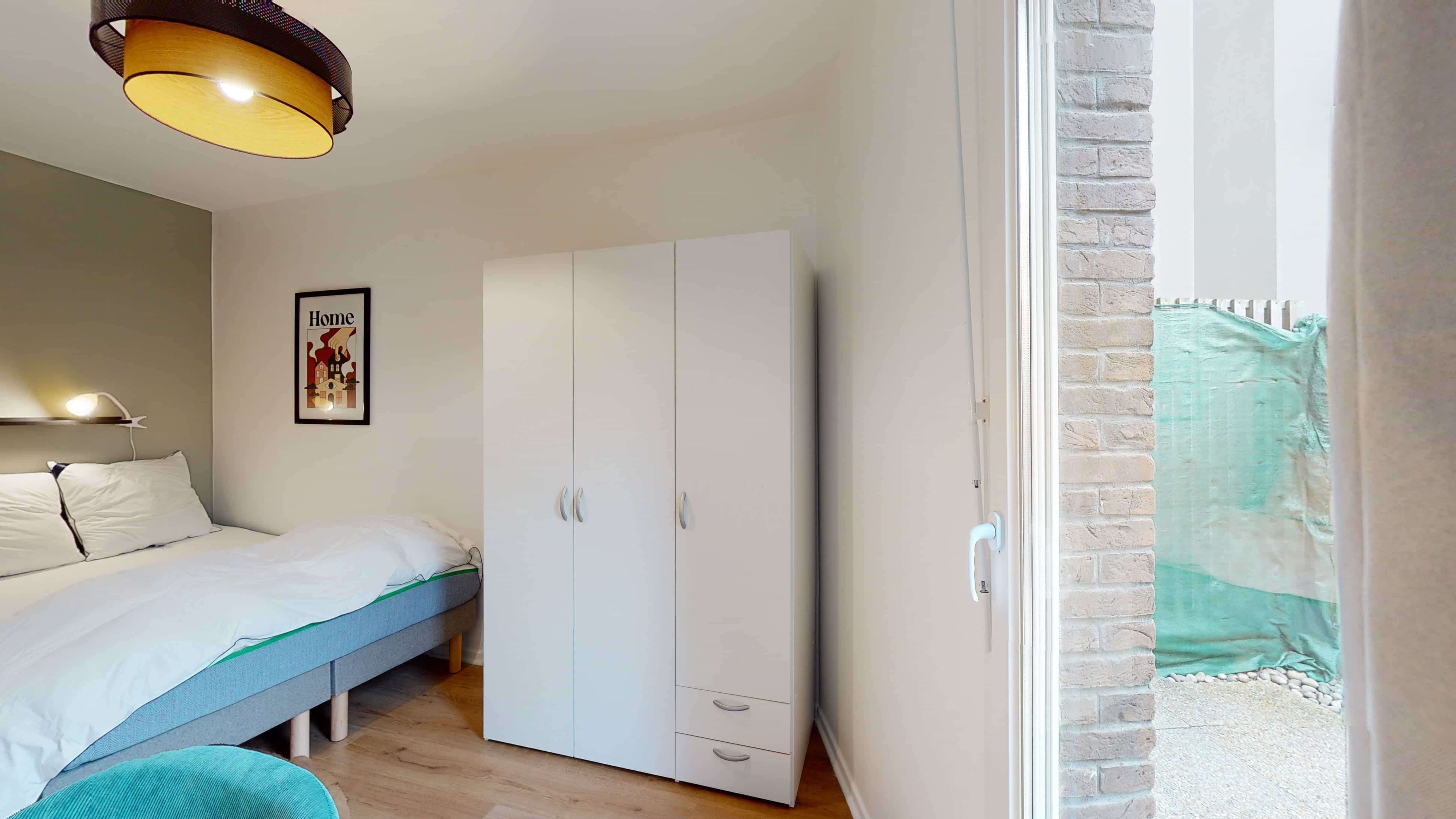 Room 3 est spécialement conçue pour une personne. Avec ses 9 m², elle dispose d'un lit double confortable, d'une armoire où ranger vos affaires, d'une chaise et d'un bureau pour étudier ou travailler. La chambre partage une salle de bain moderne avec douche et toilettes avec les autres locataires. En plus, vous aurez votre propre balcon pour profiter de l'air frais ou boire un café en toute tranquillité.