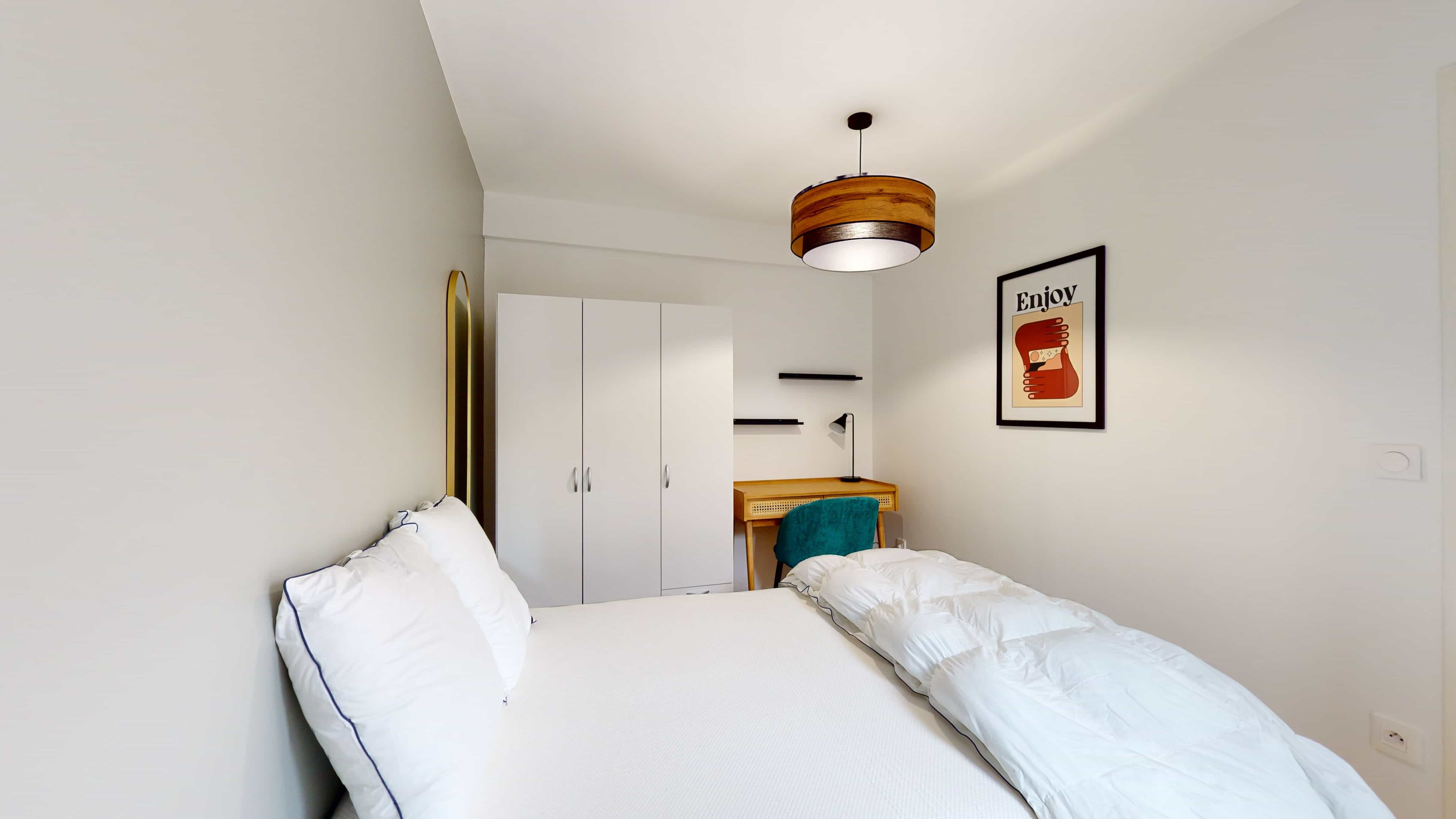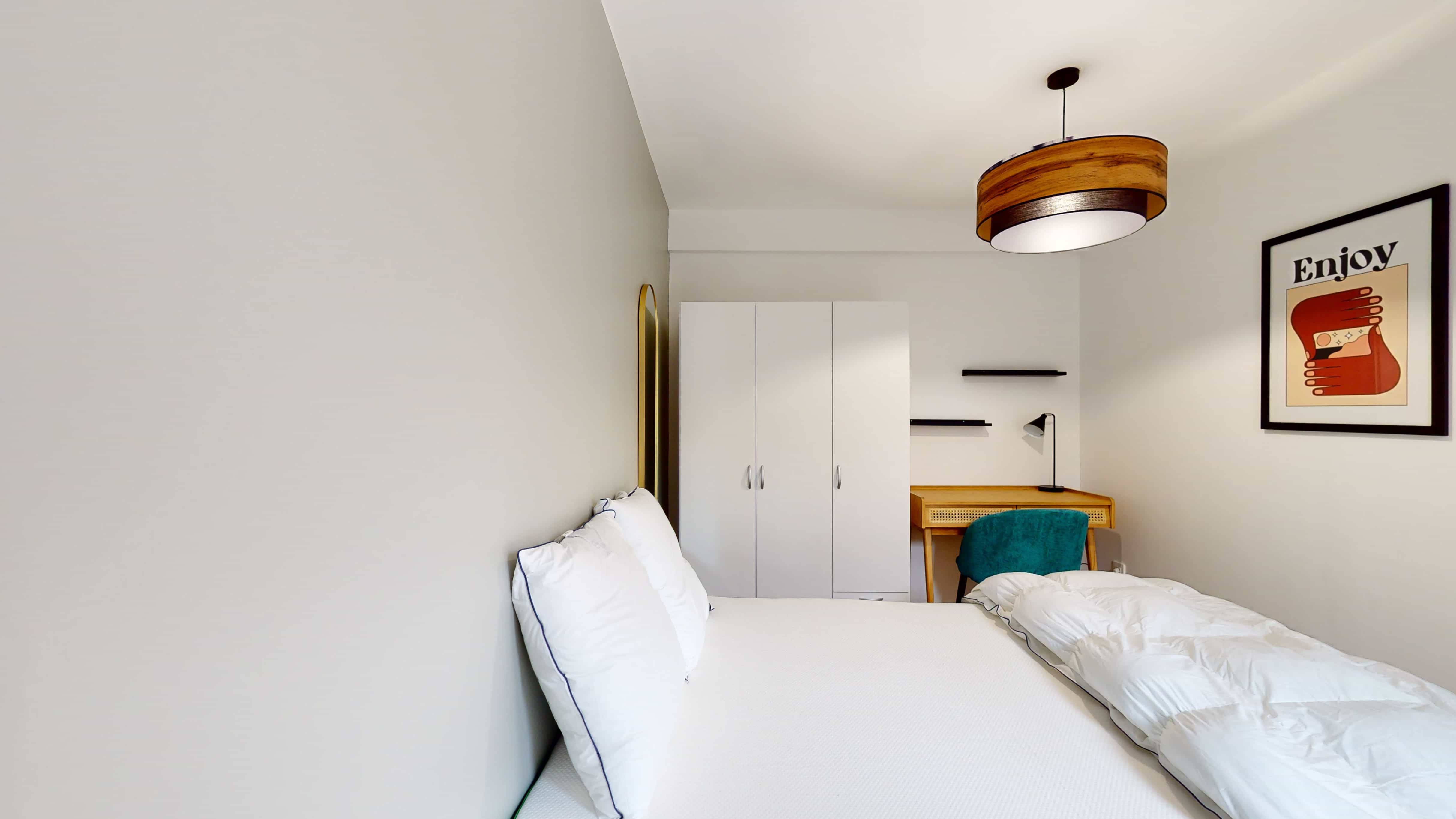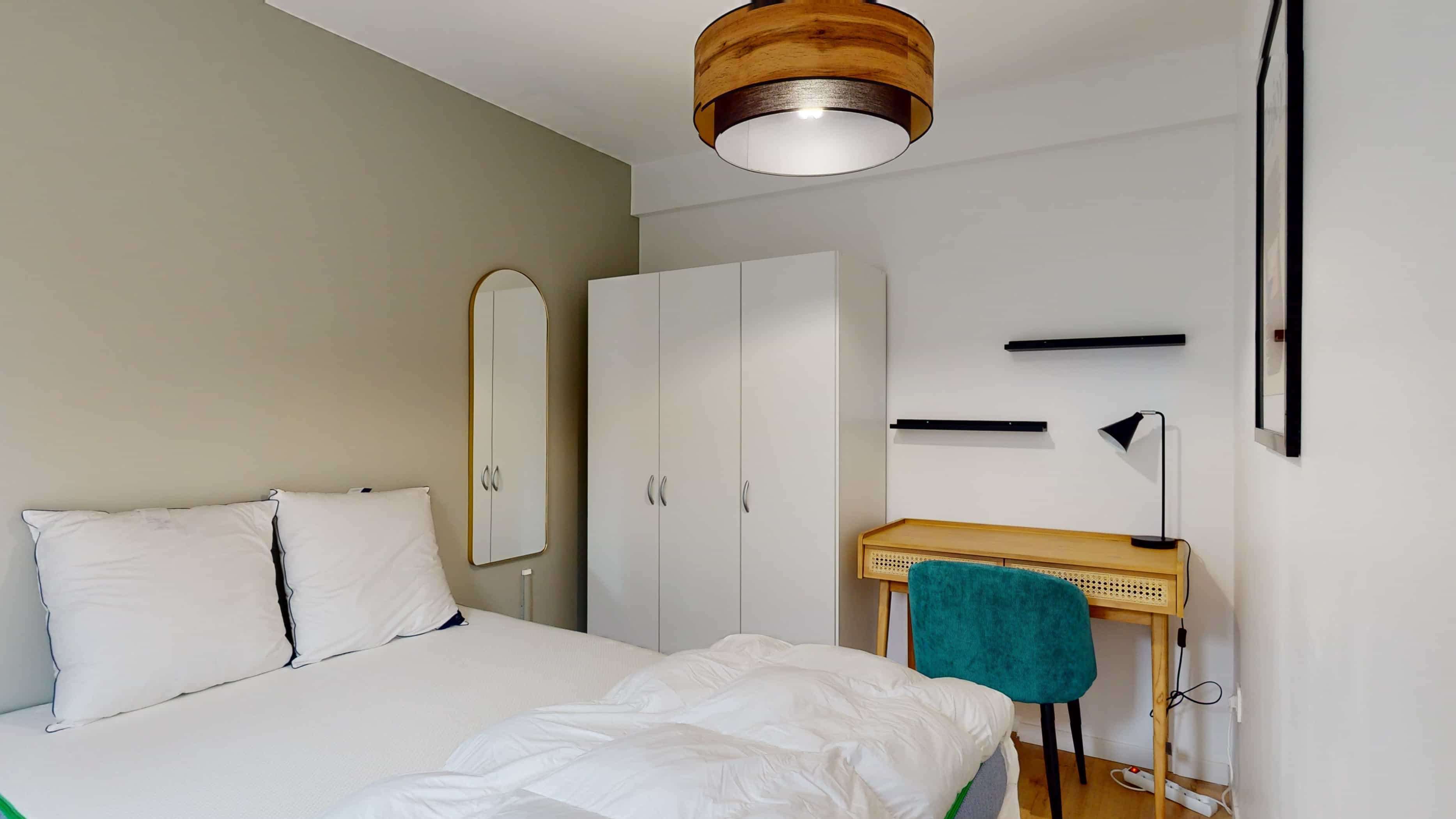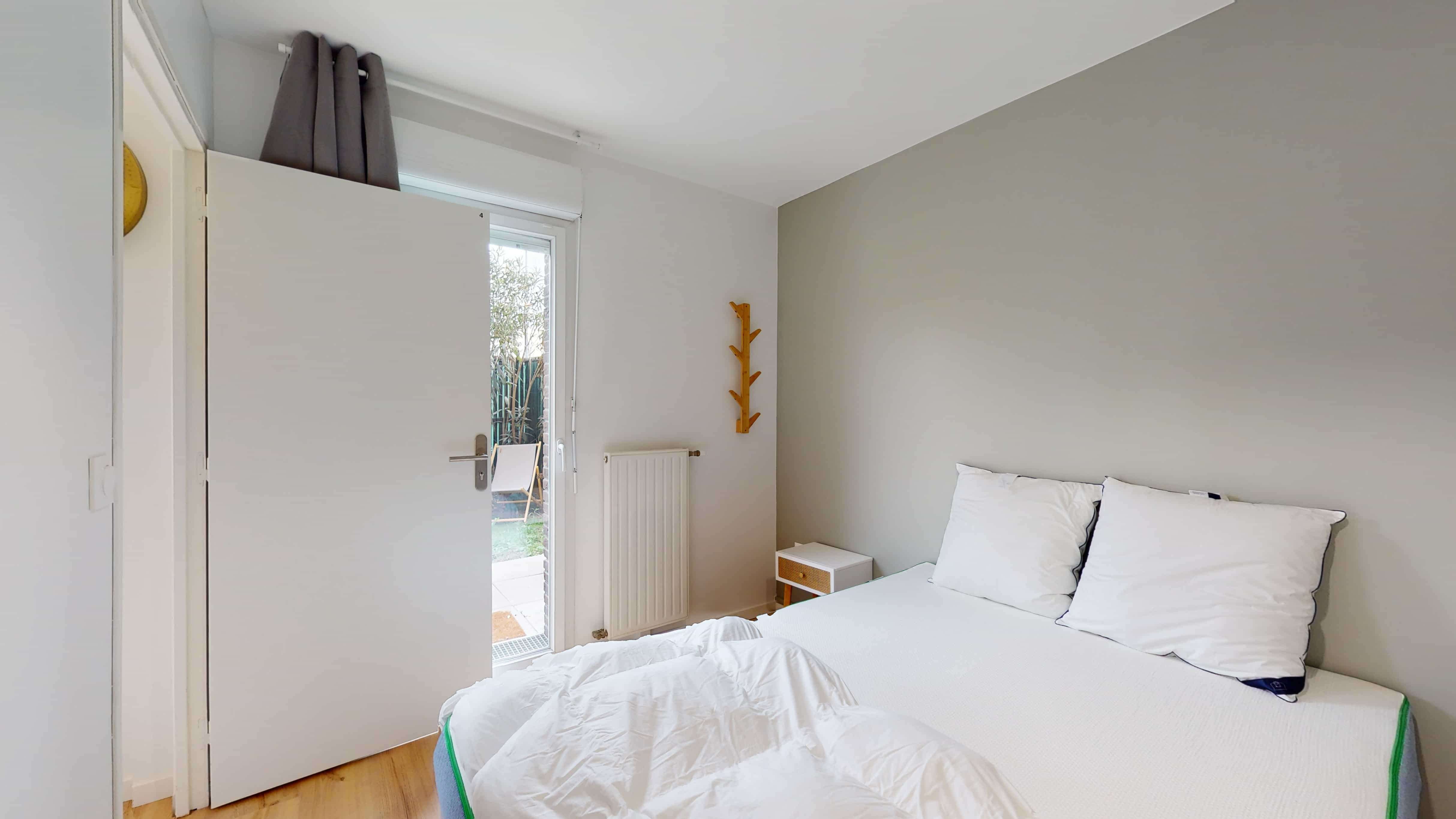 Votre future chambre, Room 4, est parfaite pour une personne. Elle comprend un lit double confortable, une armoire pour vos vêtements, une chaise et un bureau pour travailler ou étudier dans les meilleures conditions. Vous aurez aussi accès à un balcon privé et partagerez une salle de bain équipée d'une douche et des toilettes avec les autres locataires. La chambre mesure 9m², ce qui vous offre un espace cosy et fonctionnel.