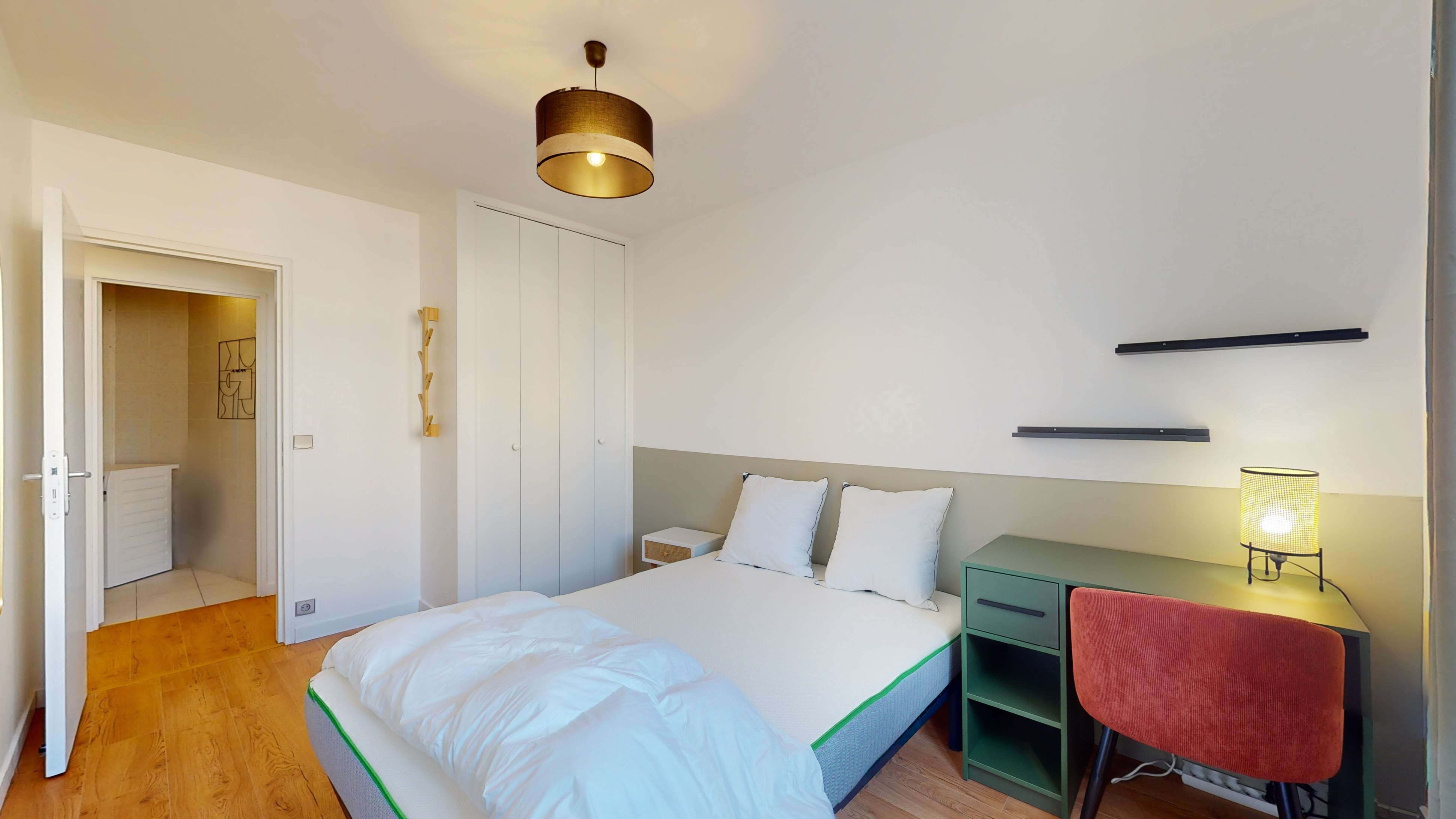 La chambre Room 1 est conçue pour accueillir confortablement une personne. Elle est bien meublée avec un lit double et des draps de qualité, une armoire pour vos affaires, une chaise, un bureau pour travailler et des étagères pour vos livres ou décorations. Cette chambre partage une salle de bain moderne avec d'autres locataires.