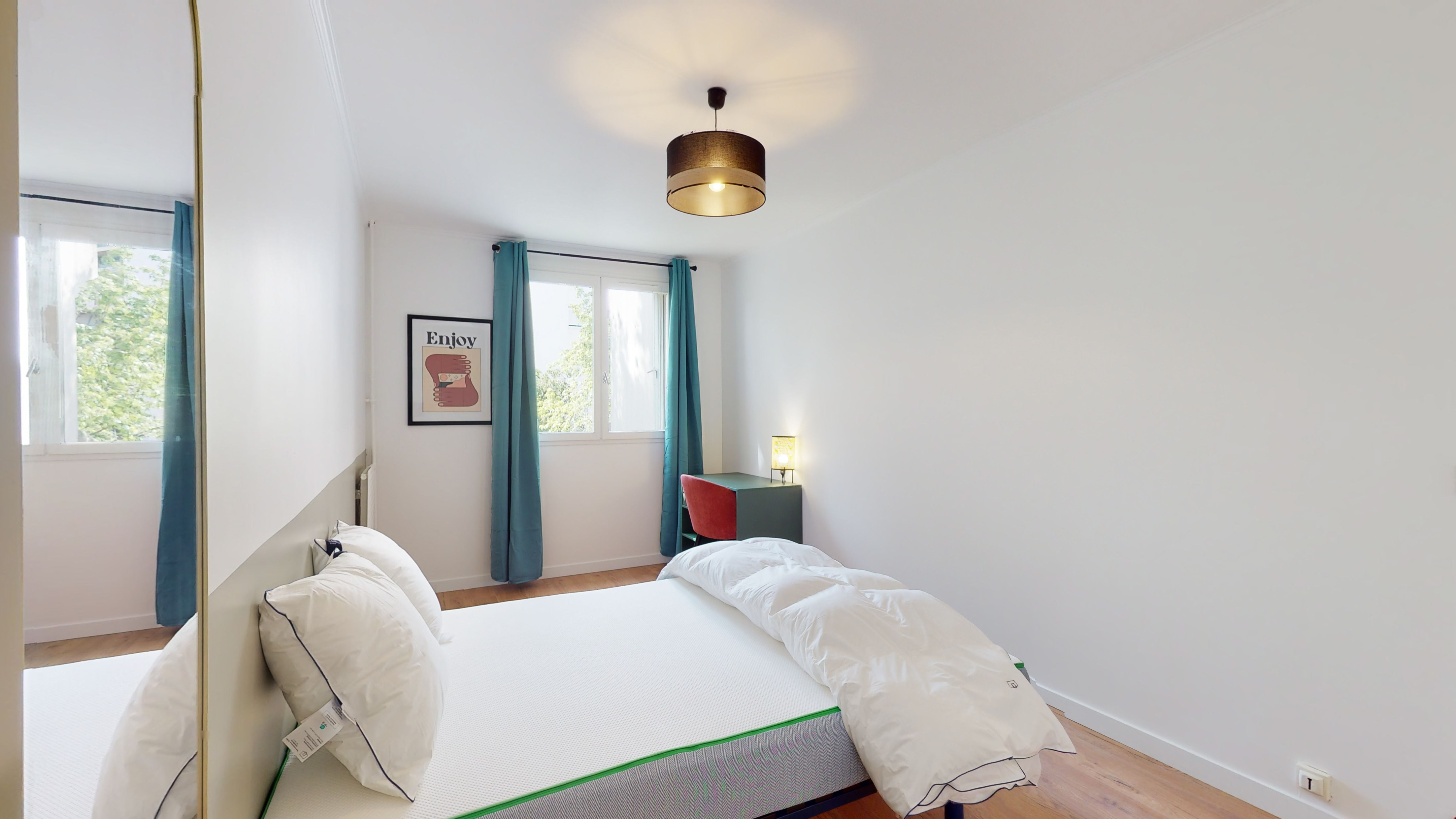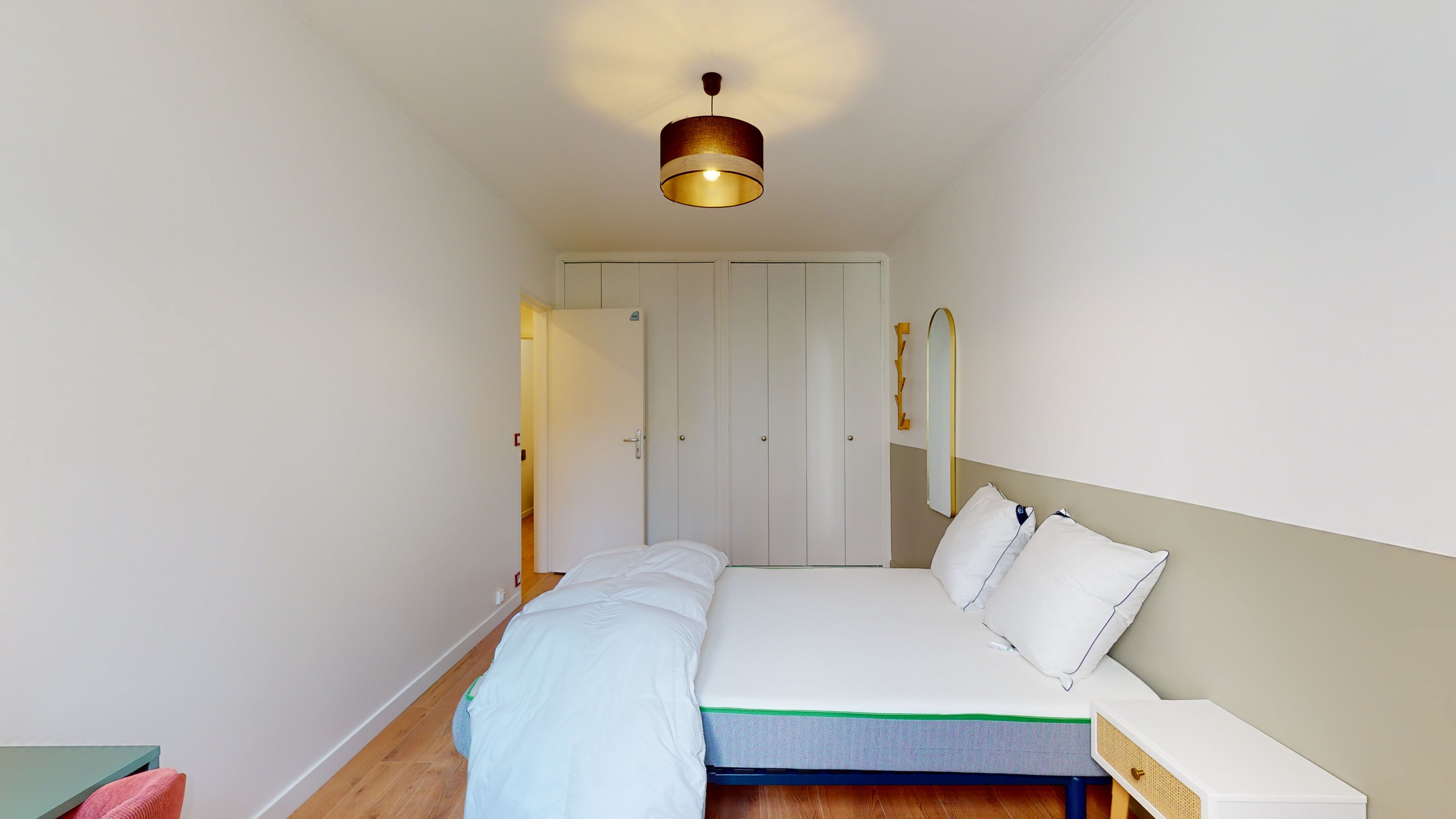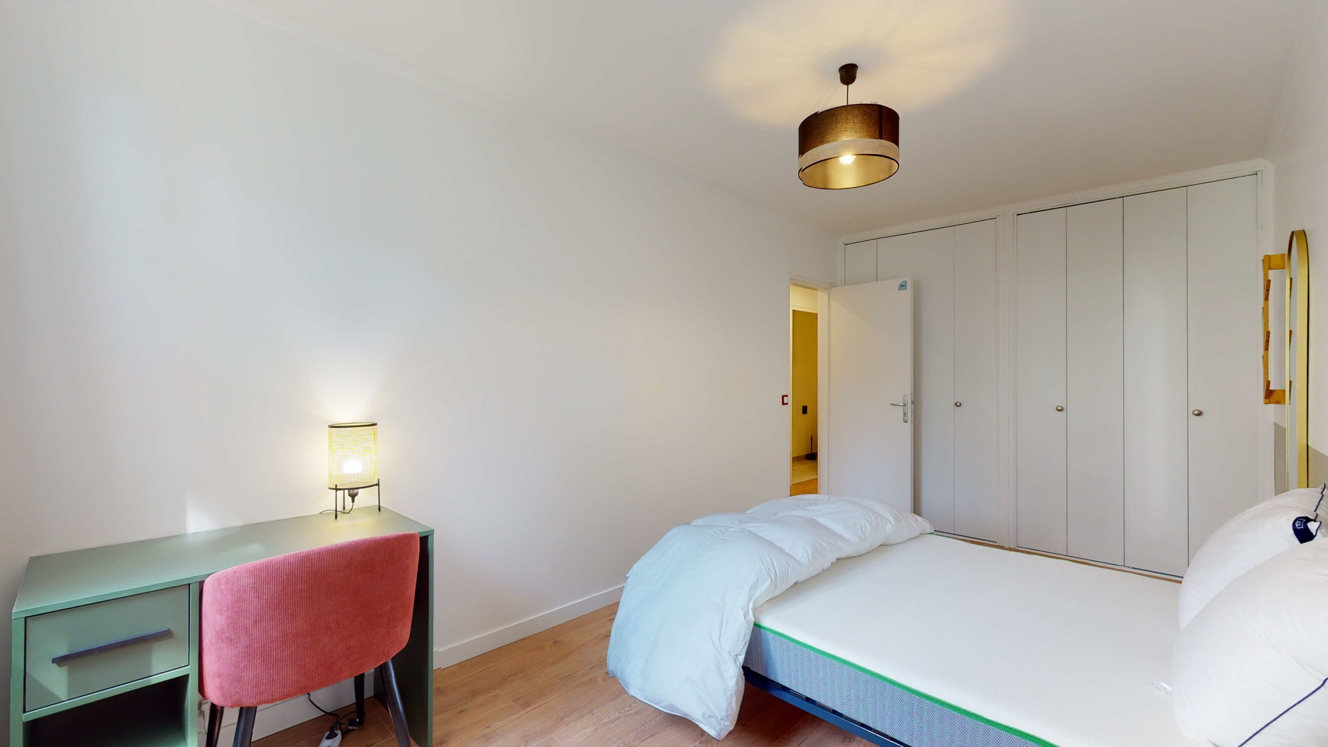 La chambre Room 4 est votre espace personnel de 13 m², conçu pour une personne, avec un lit douillet double et une armoire pour ranger toutes vos affaires. Un bureau et une chaise sont là pour travailler ou étudier dans le calme. La chambre partage une salle de bain bien équipée avec d'autres locataires.