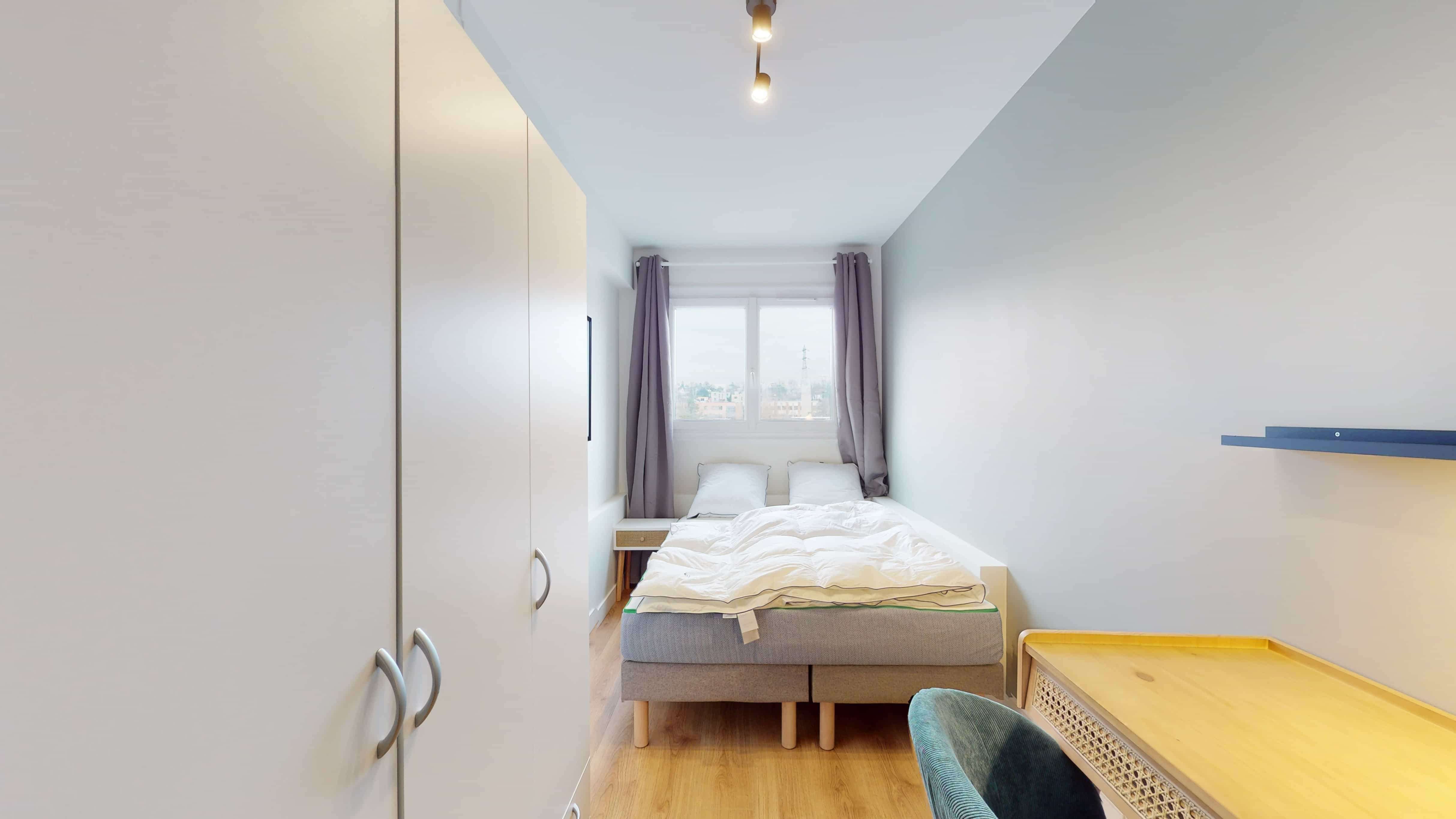 La chambre que nous vous proposons, Room 1, est conçue pour une personne. Avec ses 12 m², elle offre un lit double confortable avec une literie de qualité pour bien dormir, une grande armoire pour ranger toutes vos affaires, ainsi qu'un bureau et une chaise, idéals pour étudier ou travailler. Cette chambre partage une salle de bain propre et moderne avec une douche et des toilettes.