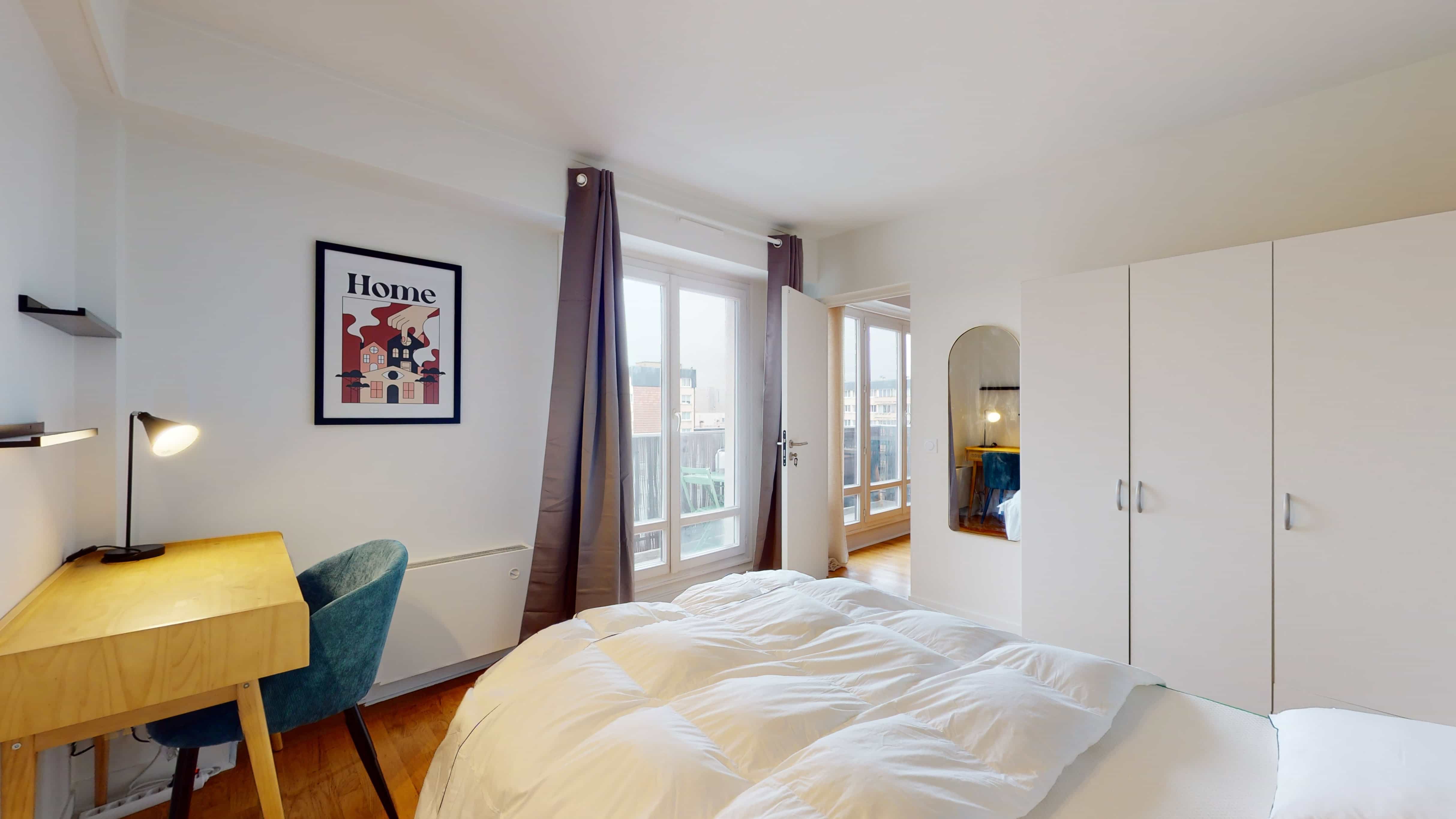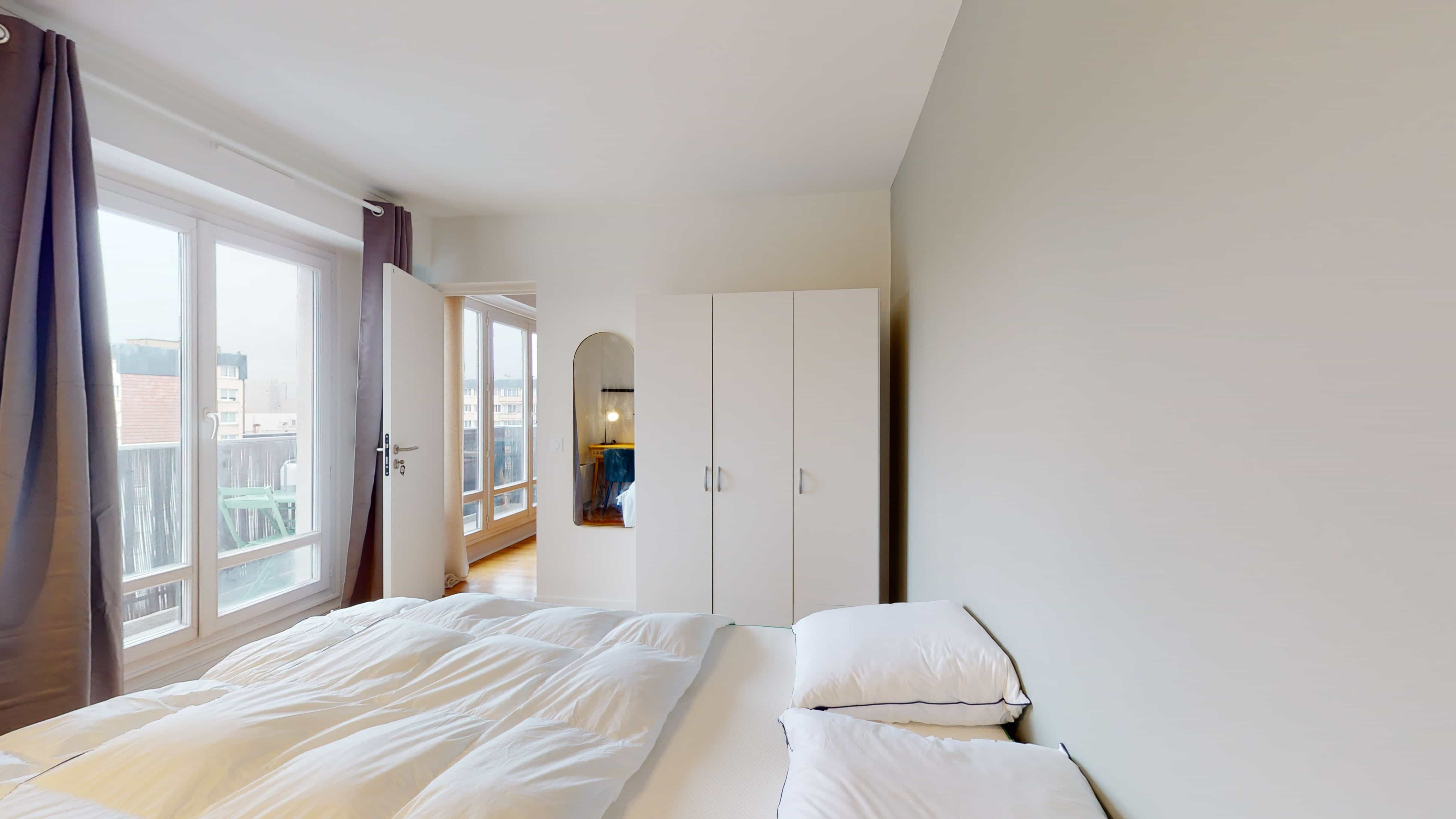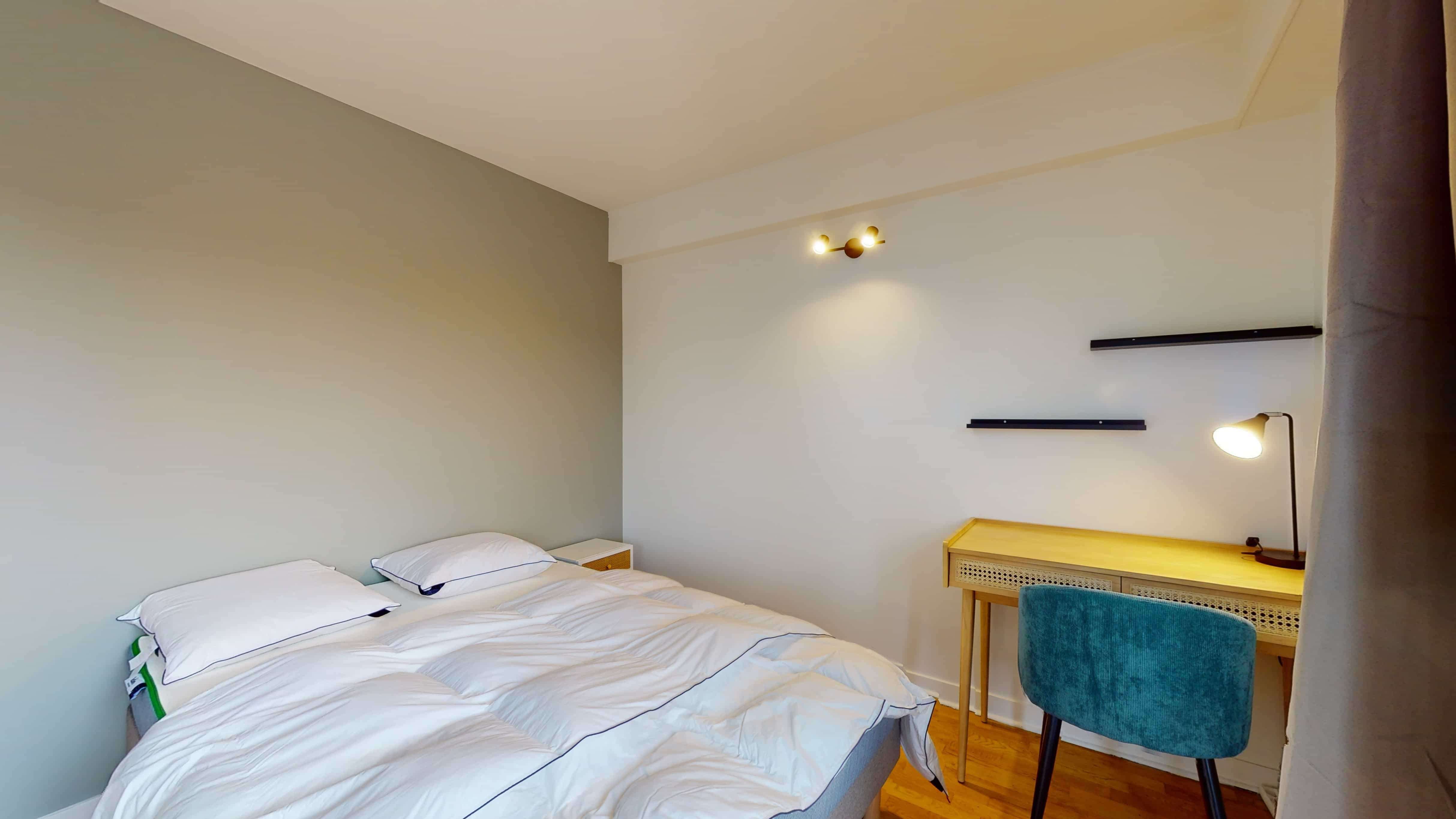 Room 2 est votre espace privé de 11m², juste pour vous. Elle a un grand lit douillet, une armoire pour vos vêtements, une chaise et un bureau pour travailler ou étudier. Et puis, il y a aussi un balcon pour profiter de l'extérieur. La salle de bain est à partager, mais elle est propre et moderne.