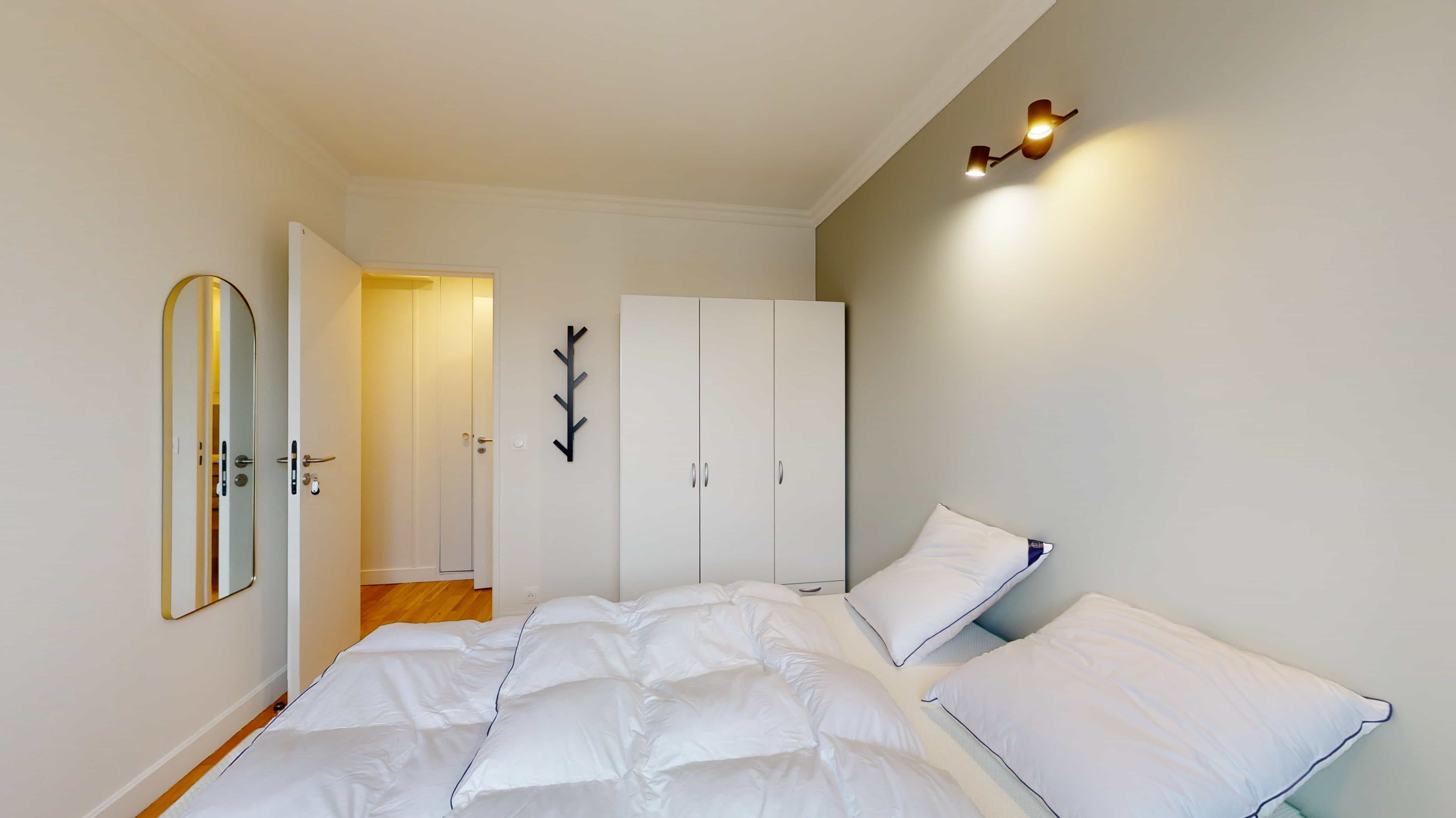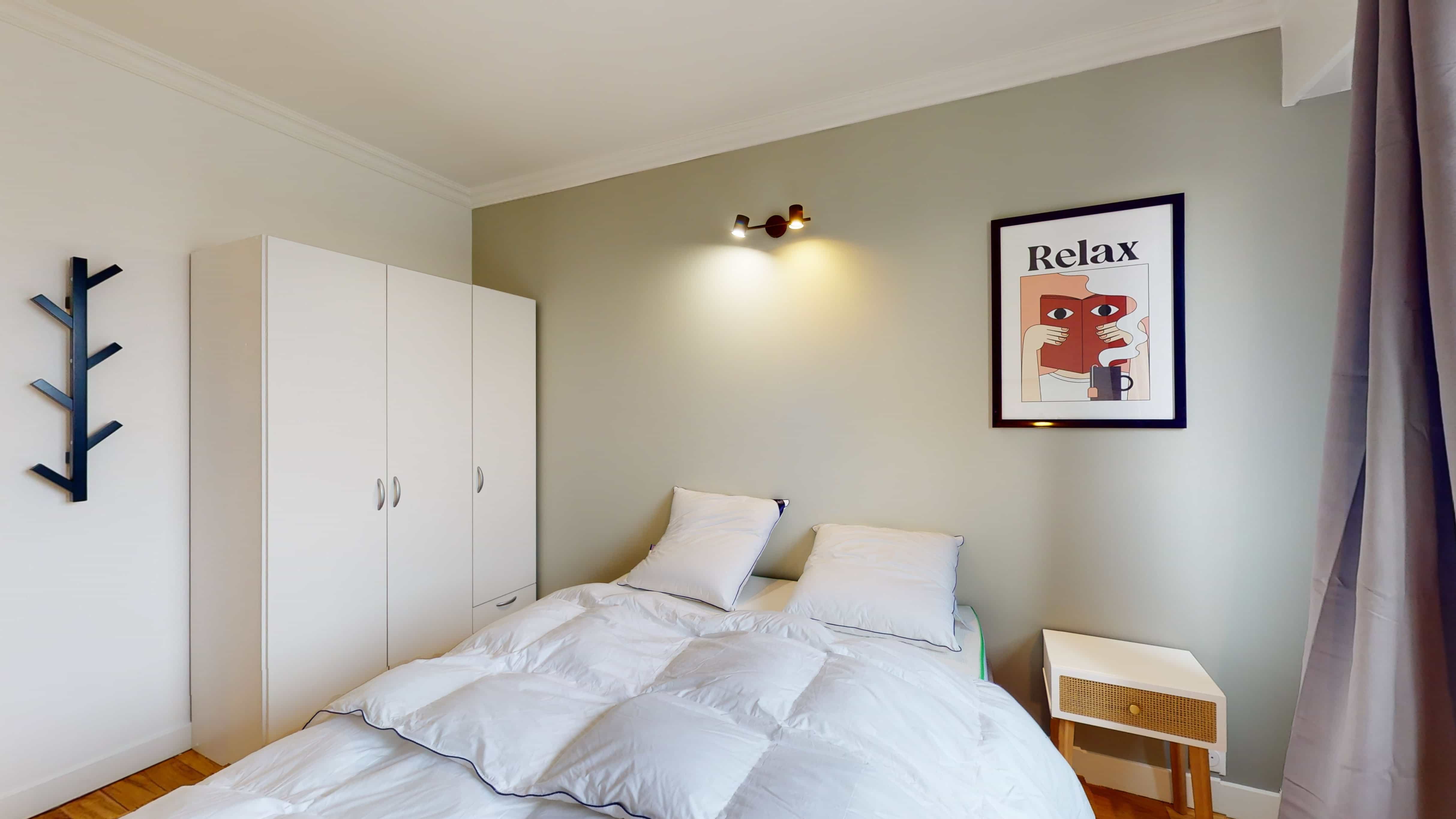 La chambre disponible, Room 5, est un cocon douillet de 11 m² conçu pour une personne. Elle est meublée avec soin : un lit double confortable avec de la literie de qualité, une armoire pour vos vêtements, une chaise et un bureau pour travailler ou étudier tranquillement. La salle de bain est à partager avec quelques colocataires, mais elle est propre et moderne.