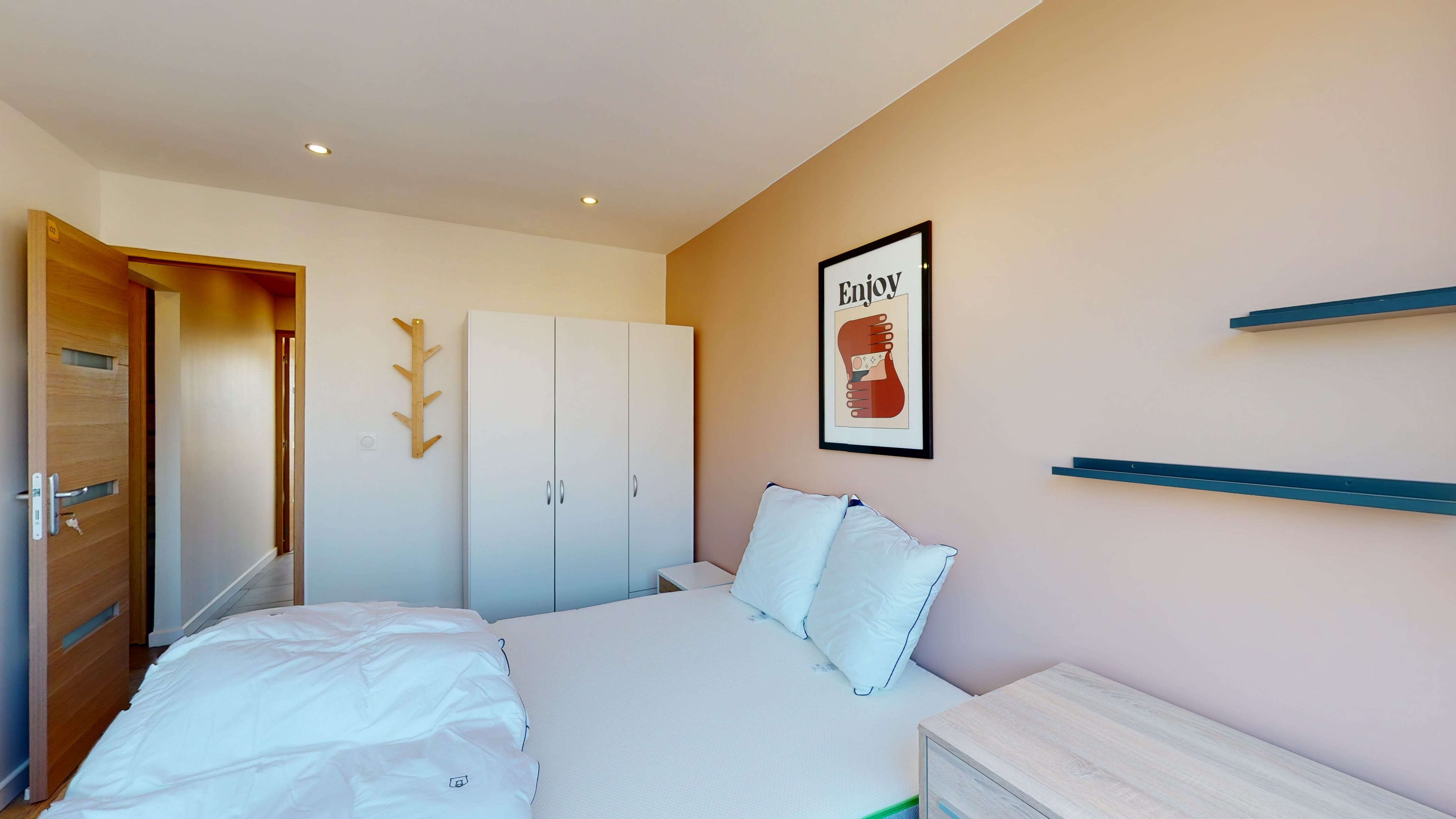 Room 2, d'une superficie de 10 m², est pensée pour votre confort personnel. Elle dispose d'un lit double douillet, d'une armoire où ranger vos affaires, d'une chaise et d'un bureau pour étudier ou travailler. Vous partagerez une salle de bain moderne avec douche et toilettes avec les autres locataires.