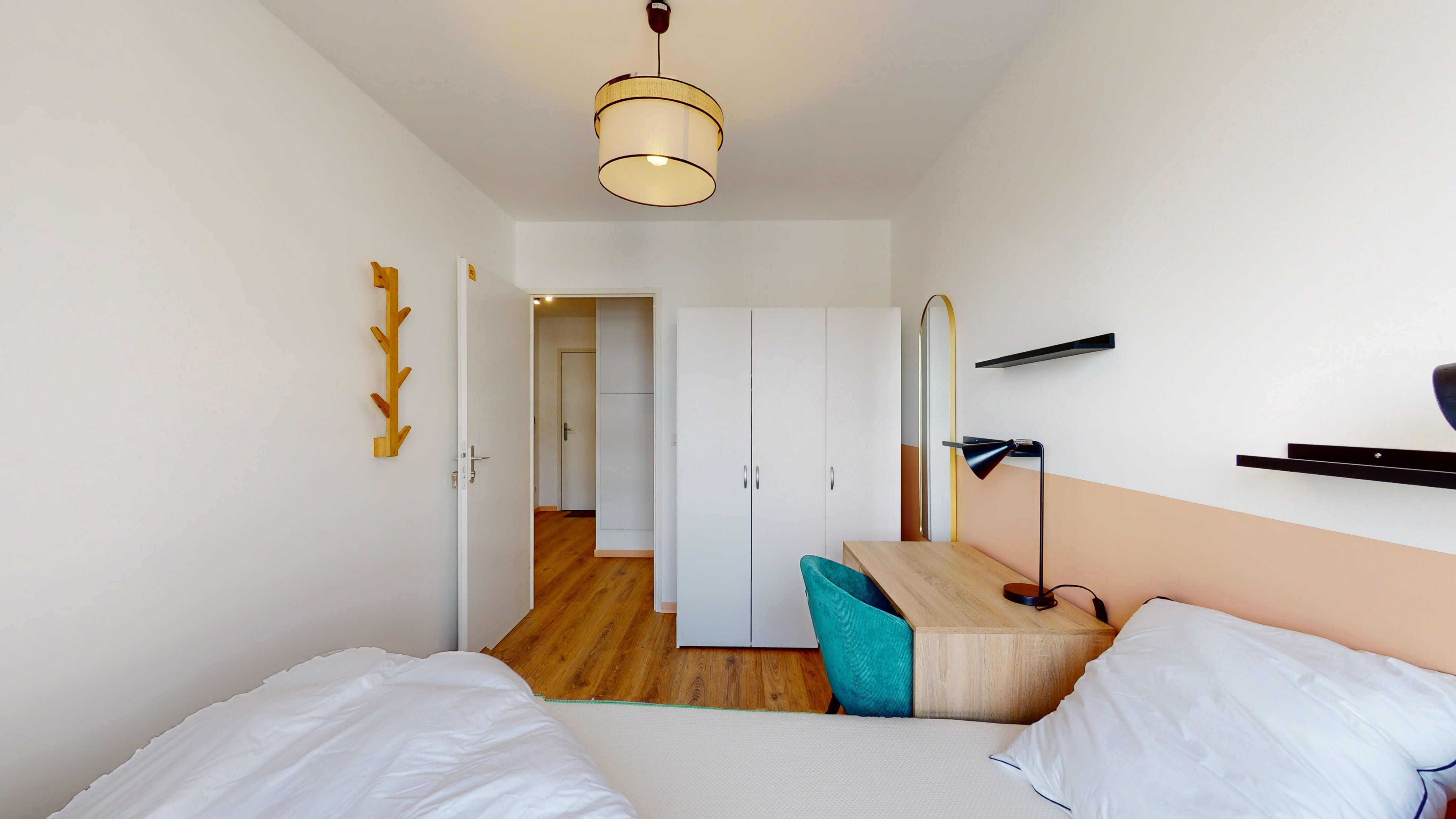 La chambre Room 2 est un petit cocon de 9 m² juste pour vous ! Avec un lit double douillet, une armoire pour ranger vos affaires, une chaise et un bureau pour étudier ou travailler, elle a tout ce qu'il faut. Et pas de soucis pour la file d'attente le matin, vous partagerez une salle de bain équipée d'une douche et de toilettes avec d'autres locataires.