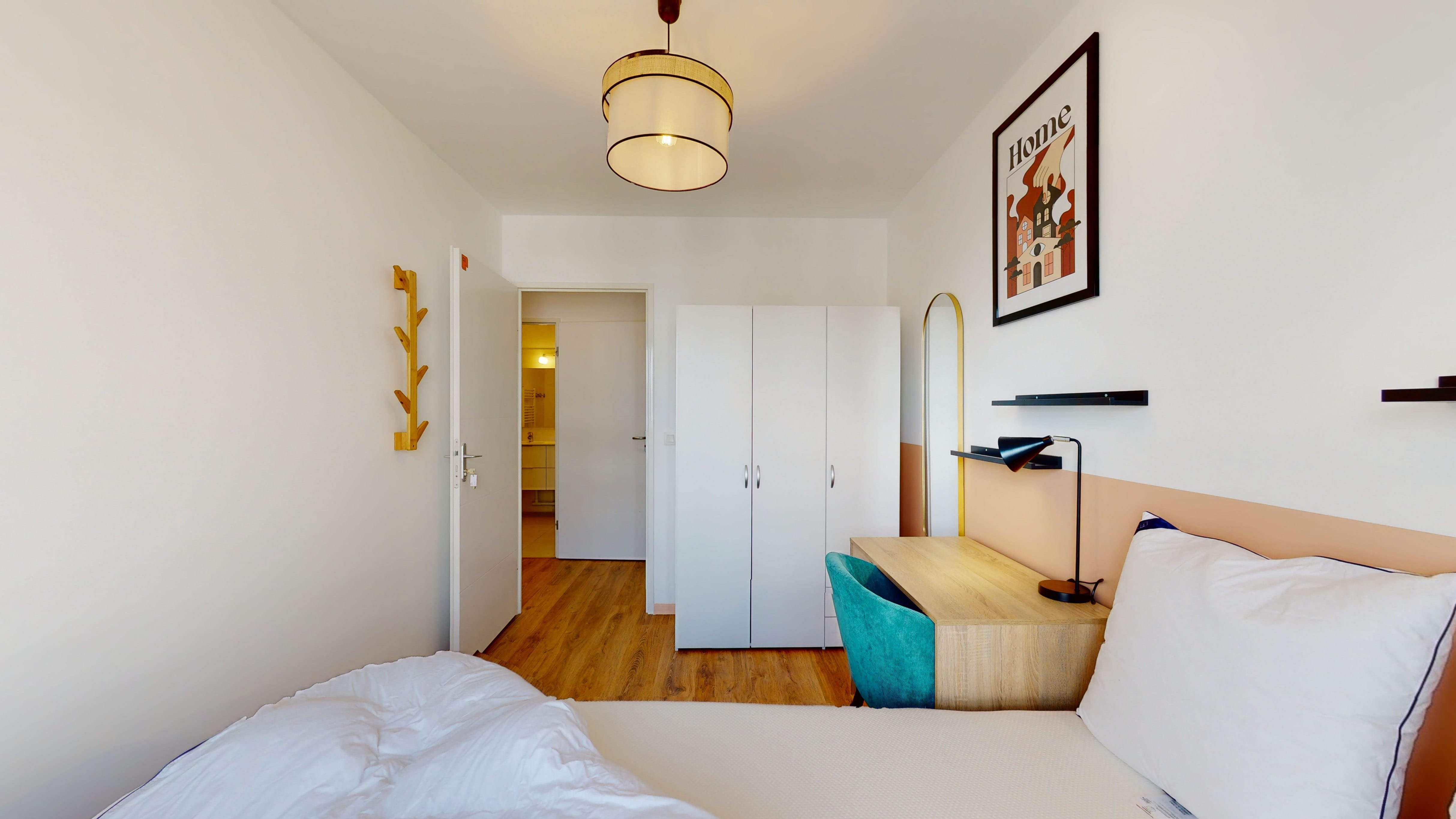 La chambre "Room 3" est un espace rien que pour vous. Elle a un grand lit douillet, une armoire pour vos vêtements, une chaise et un bureau pour travailler ou étudier tranquillement. Vous aurez aussi une salle de bain partagée, propre et pratique.