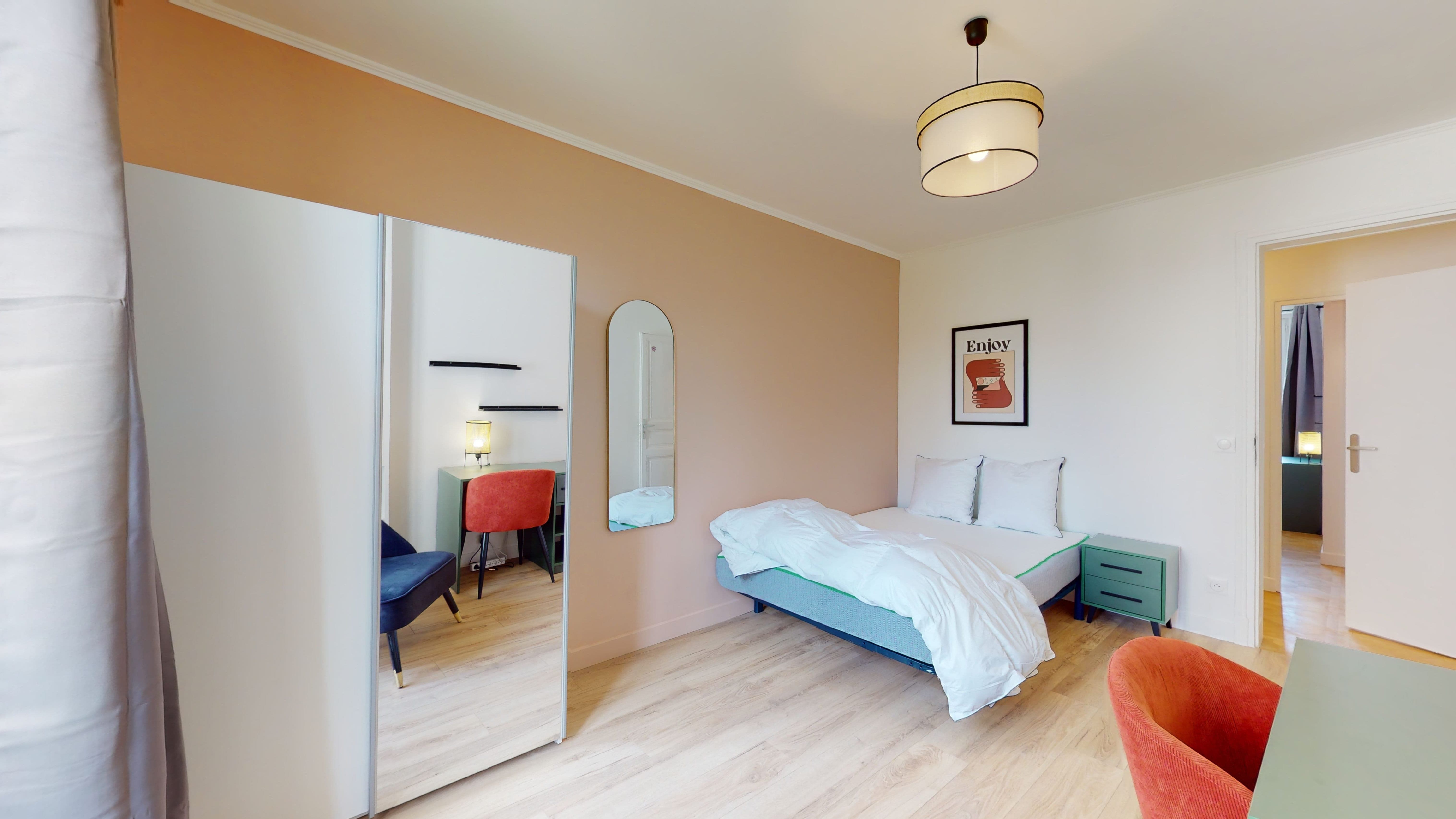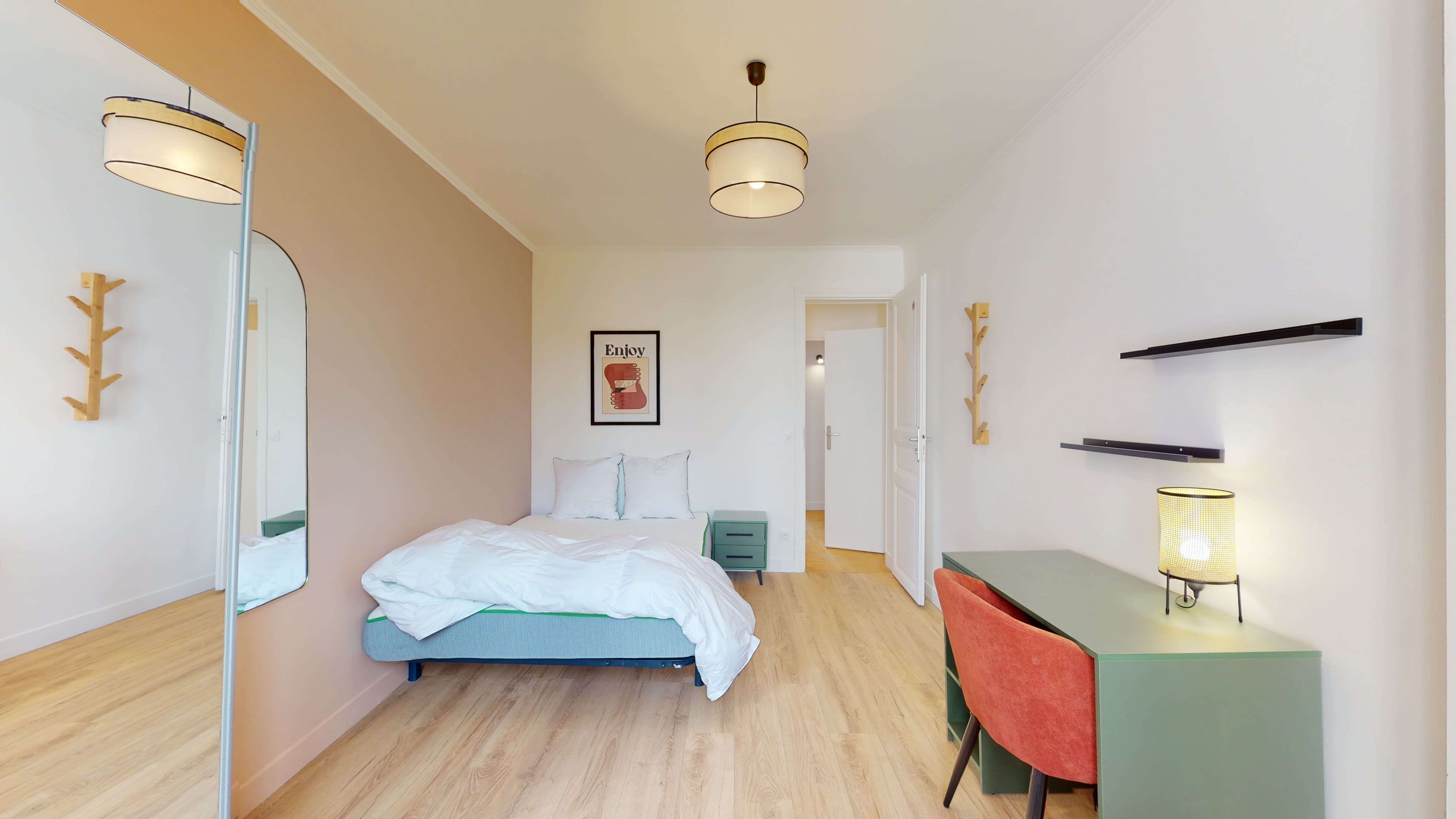 La chambre que nous proposons est spécialement conçue pour une personne. Avec ses 13 m², elle offre un lit double confortable, une armoire pour vos vêtements, ainsi qu'un bureau et une chaise pour travailler ou étudier. La chambre bénéficie également d'une connexion Internet haut débit. Elle partage une salle de bain moderne avec d'autres locataires.