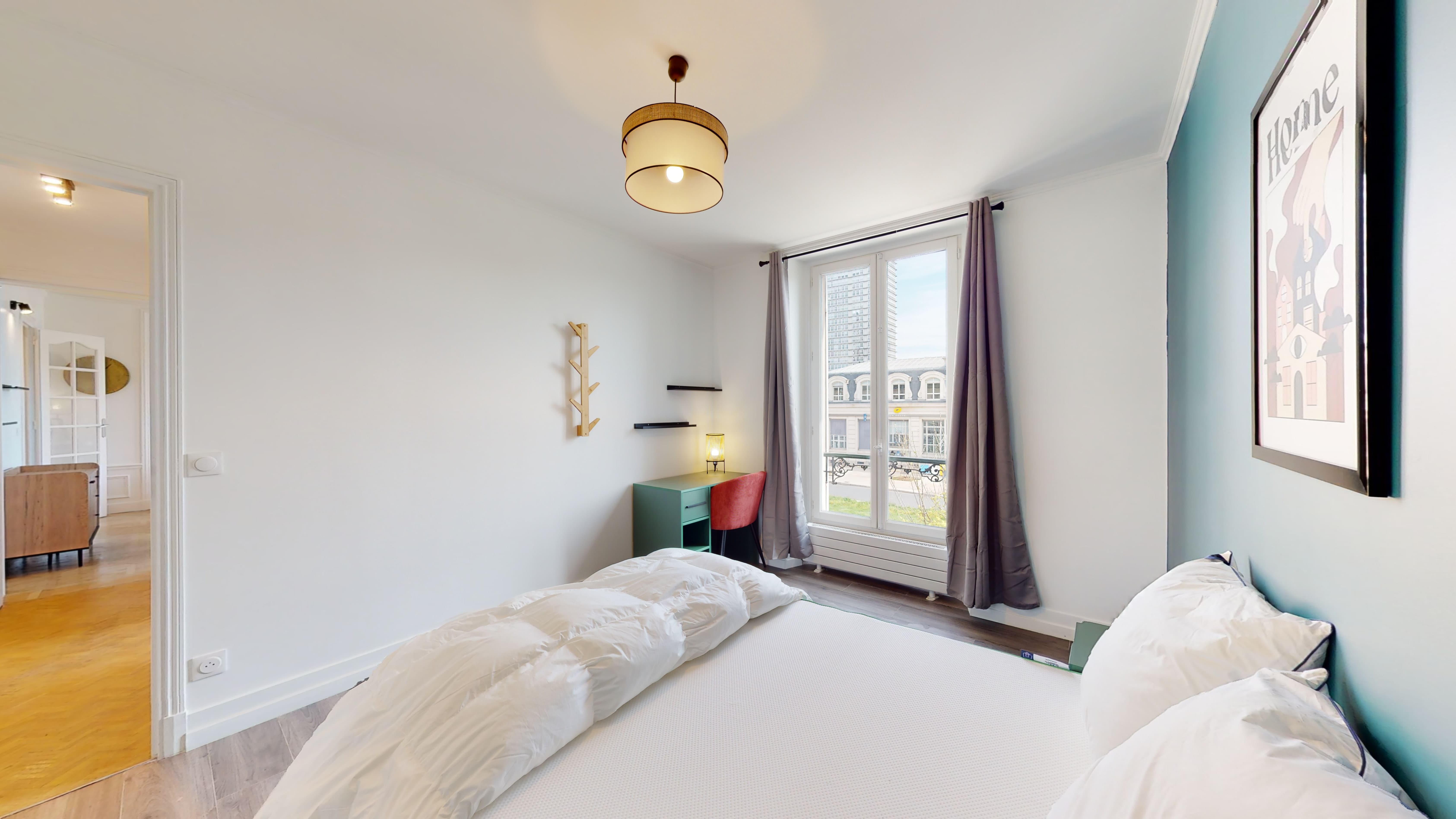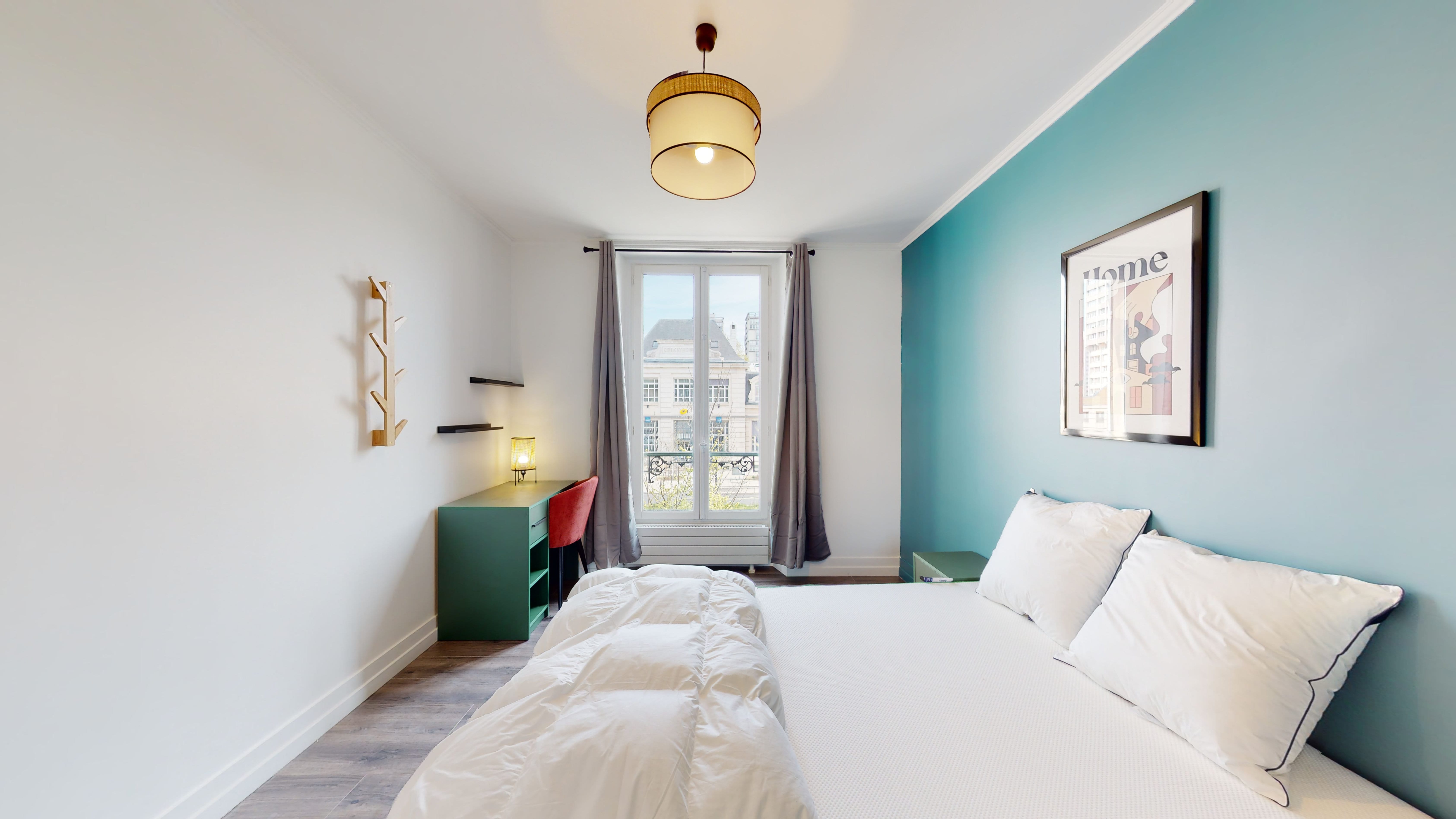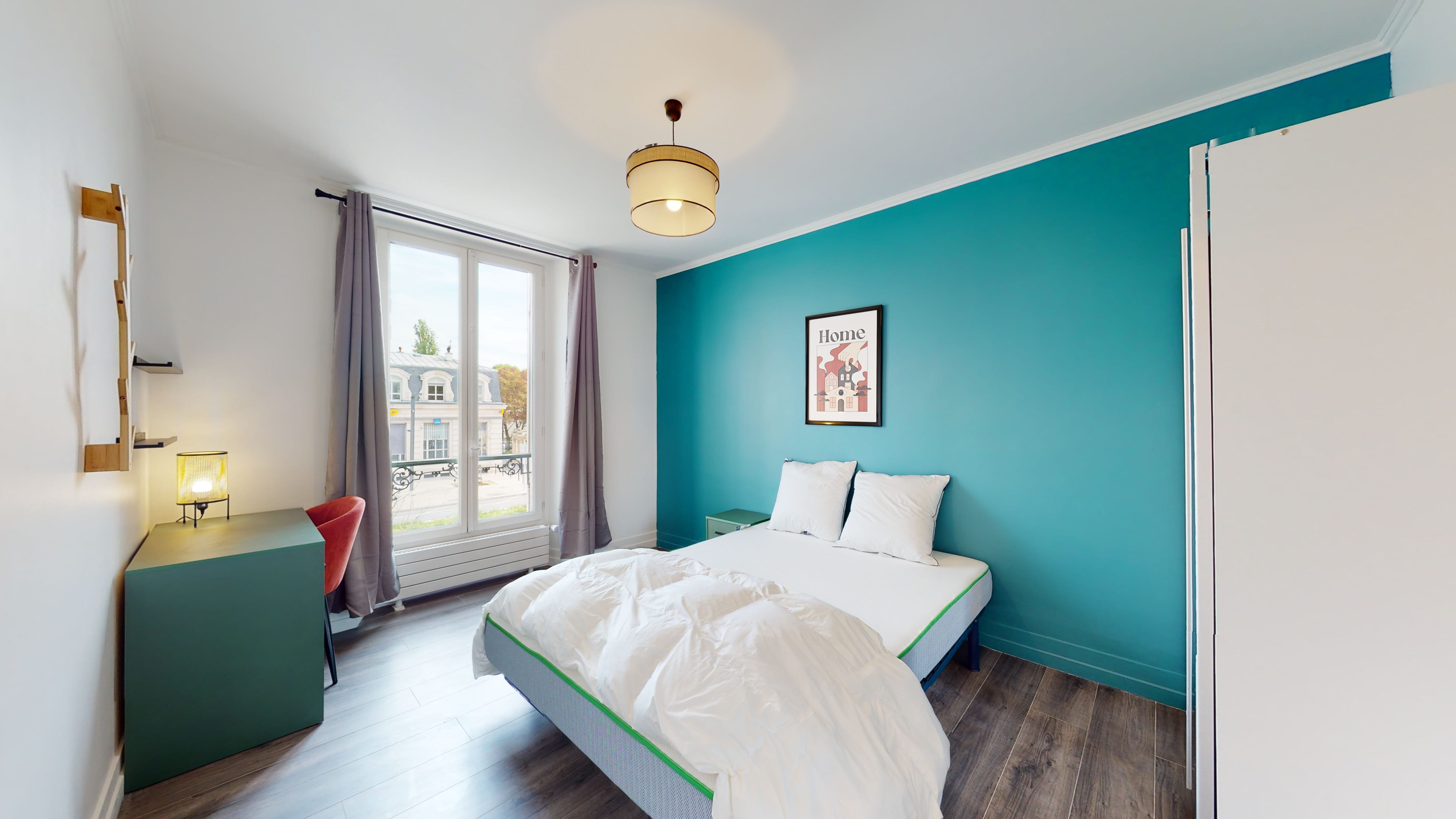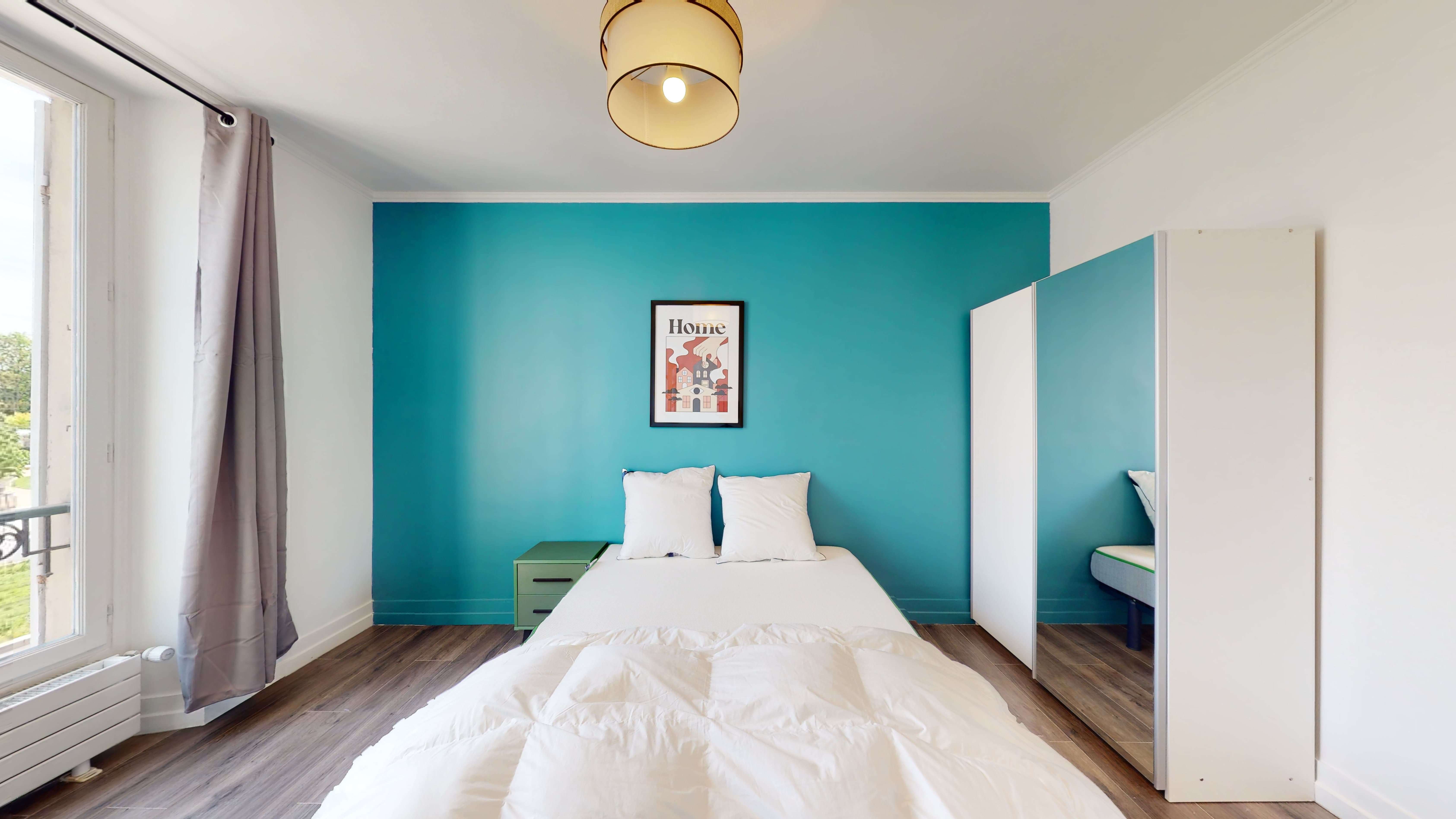 La chambre disponible, nommée "Room 3", est parfaite pour une personne. Elle mesure 12m² et dispose d'un lit double confortable, d'une armoire spacieuse pour vos affaires, ainsi que d'un bureau et d'une chaise pour travailler au calme. La chambre partage une salle de bain bien équipée avec ses colocataires. Vous y trouverez tout le nécessaire : connexion internet haute vitesse, literie de qualité et détails pratiques comme une poubelle et des cintres.