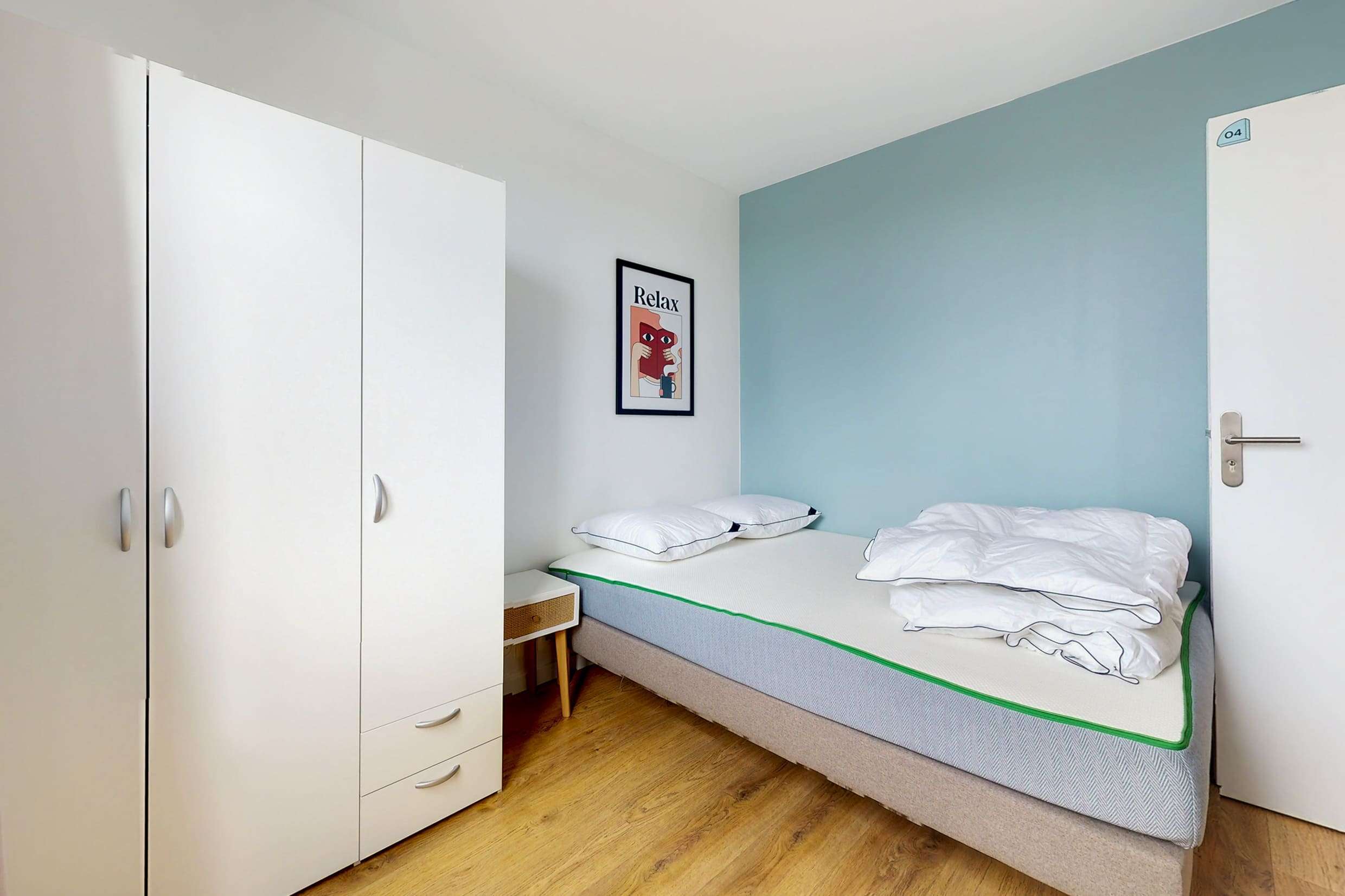 La chambre Room 4 est spécialement conçue pour une personne. Elle est meublée d'un confortable lit double, d'une armoire spacieuse pour vos affaires, d'une chaise et d'un bureau pour travailler ou étudier tranquillement. Vous partagerez une salle de bain moderne avec seulement quelques autres locataires, garantissant confort et intimité.