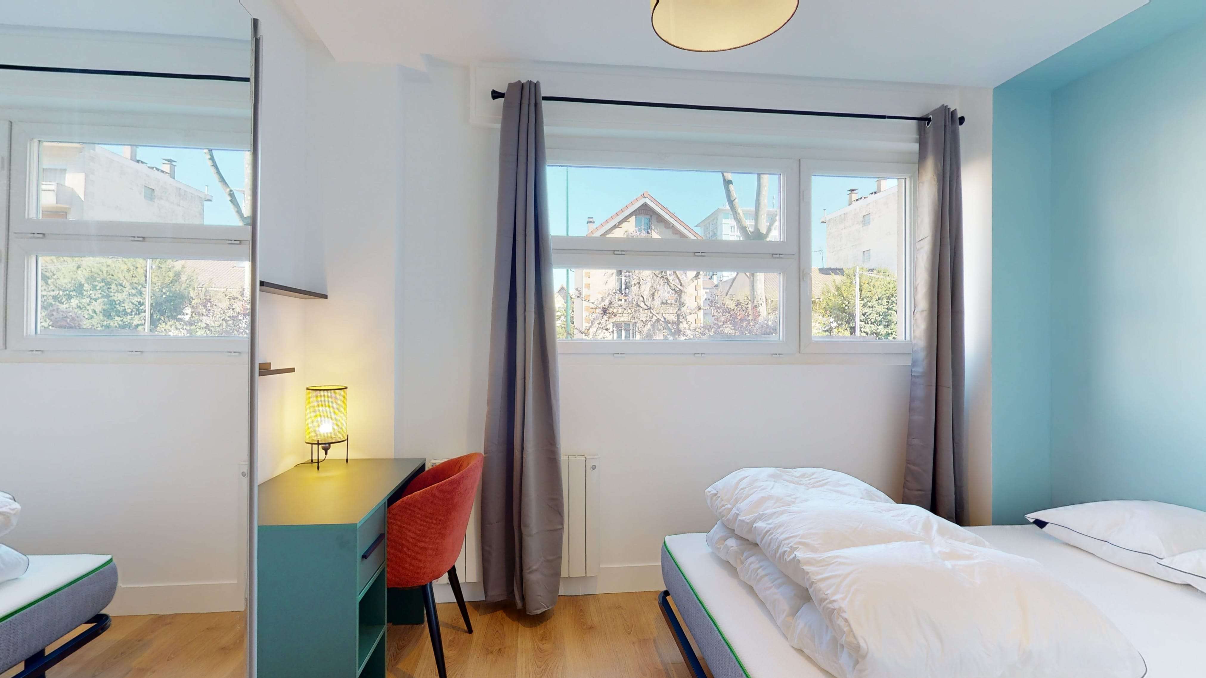 La chambre, conçue spécialement pour une personne, est un véritable petit nid douillet. Elle est meublée d'un confortable lit double, d'une armoire pour vos vêtements, ainsi que d'un bureau et d'une chaise pour travailler ou étudier en toute tranquillité. Avec ses 10 m², elle offre l'intimité dont vous avez besoin et partage une salle de bain bien équipée avec d'autres locataires.