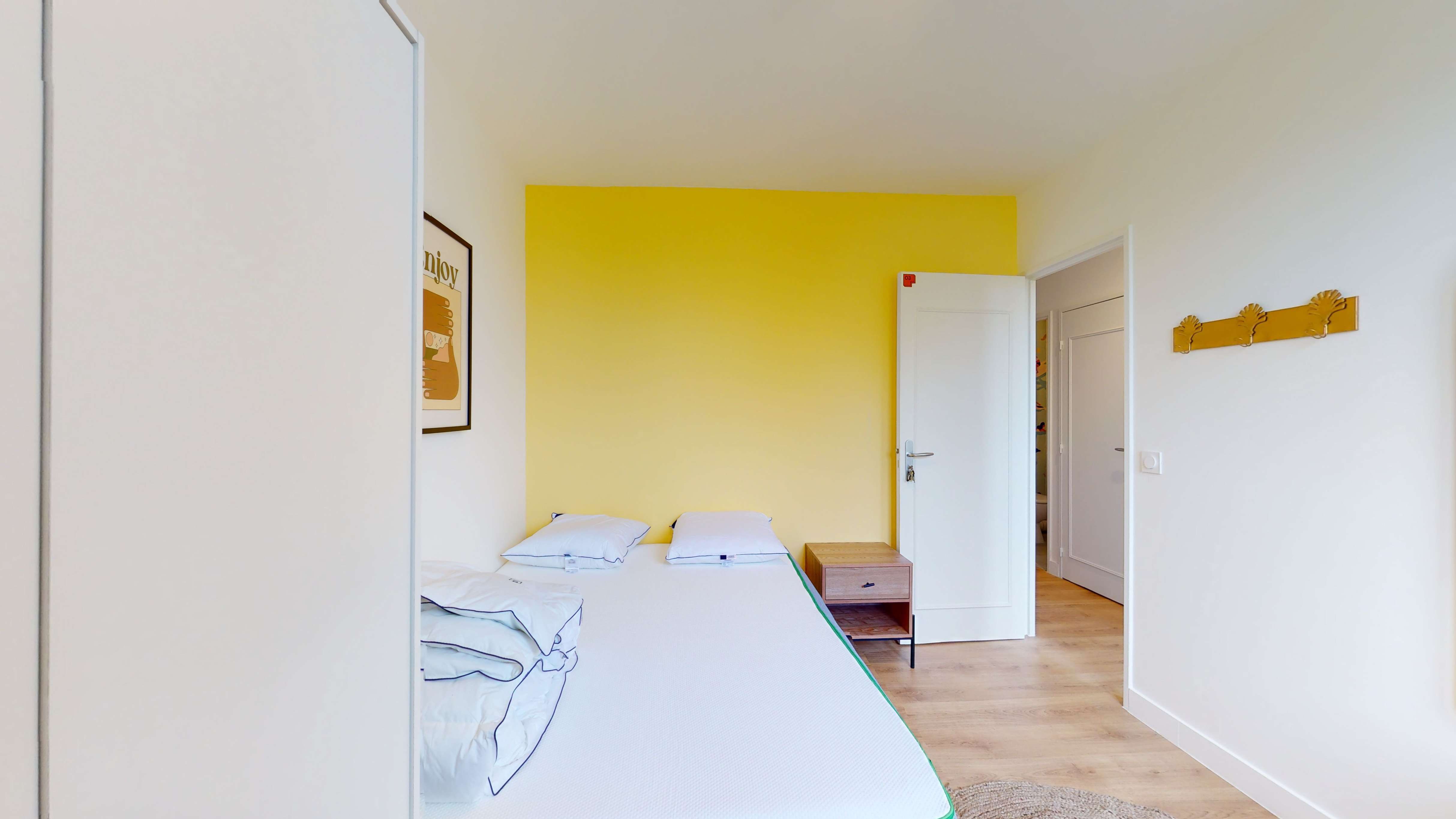 La chambre, nommée "Room 3", est conçue pour une personne avec tout le confort nécessaire : un grand lit douillet, un bureau pour étudier ou travailler, une armoire pour ranger vos affaires, et des petites touches comme une lampe de chevet et un miroir. Elle offre un cocon privé dans lequel vous vous sentirez rapidement chez vous.