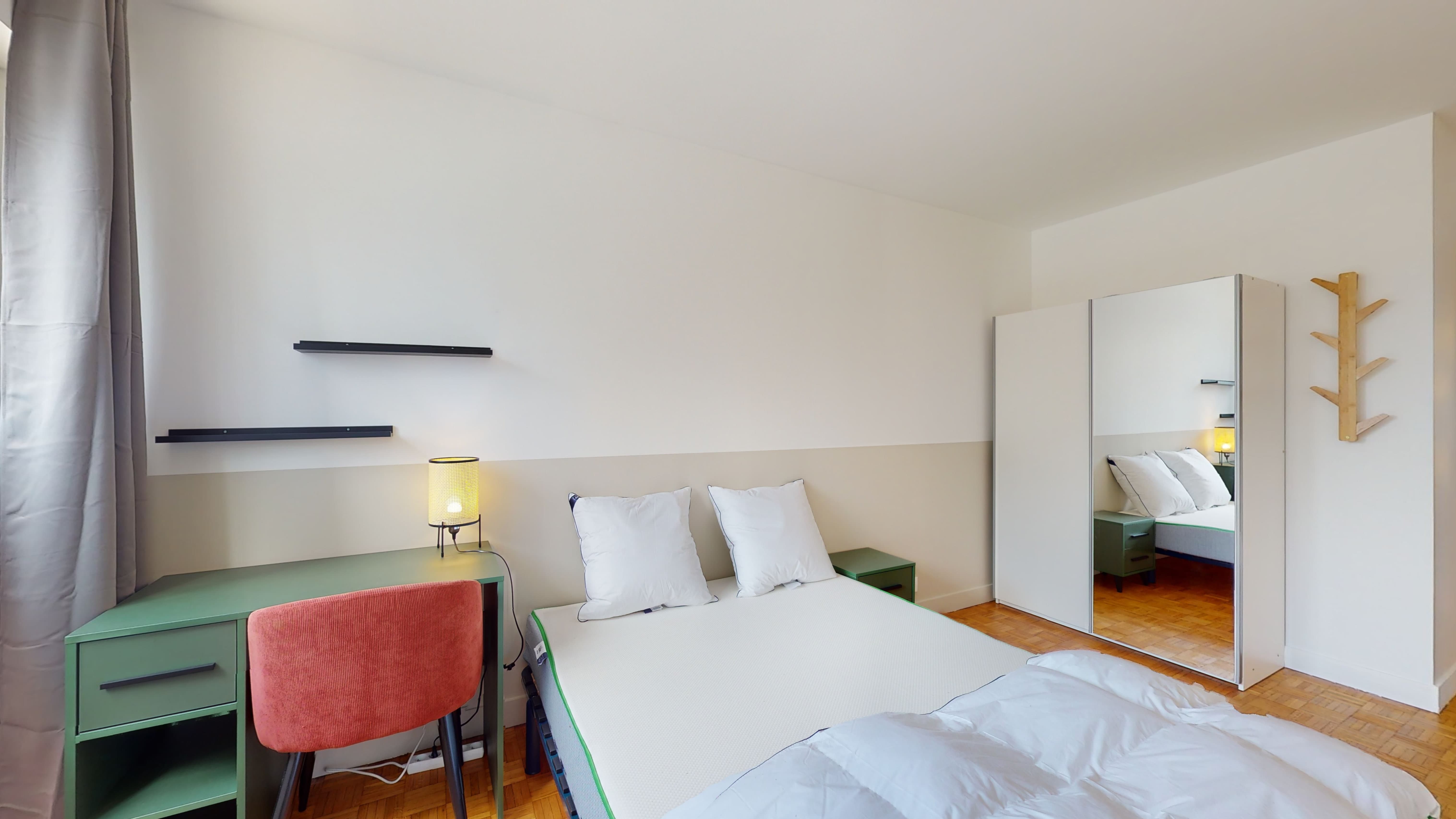 La chambre "Room 3" est pensée spécialement pour une personne. Elle est composée d'un confortable lit double, d'une armoire spacieuse pour vos affaires, d'une chaise et d'un bureau pour étudier ou travailler tranquillement. La chambre partage une salle de bain bien équipée avec d'autres résidents.