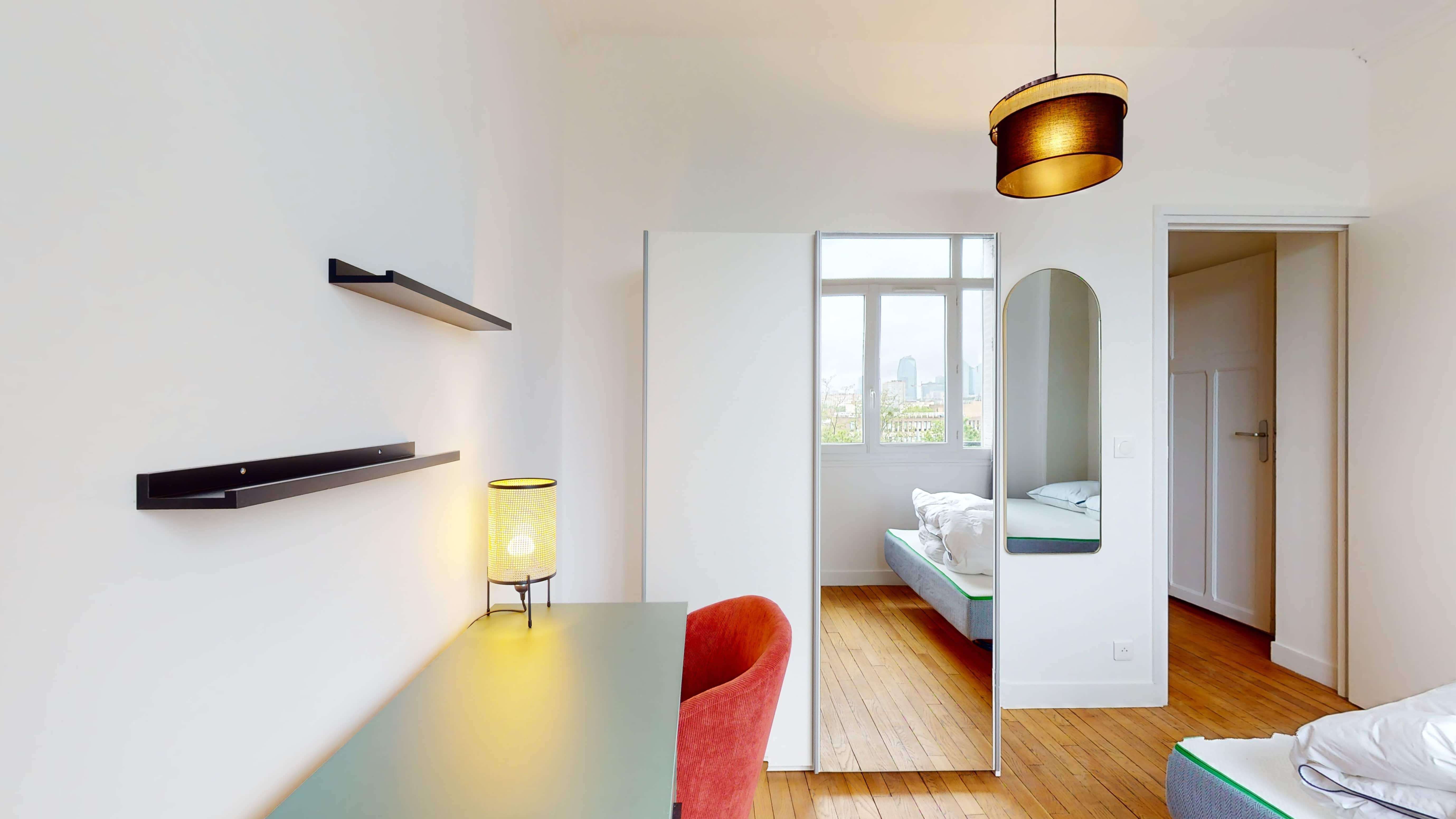 Room 3 vous accueille dans un espace personnel de 10m², juste pour vous. Profitez d'un lit double confortable, d'une armoire pour vos affaires, ainsi que d'un bureau et d'une chaise pour étudier ou travailler en toute tranquillité. La chambre bénéficie d'une salle de bain partagée bien aménagée avec douche.