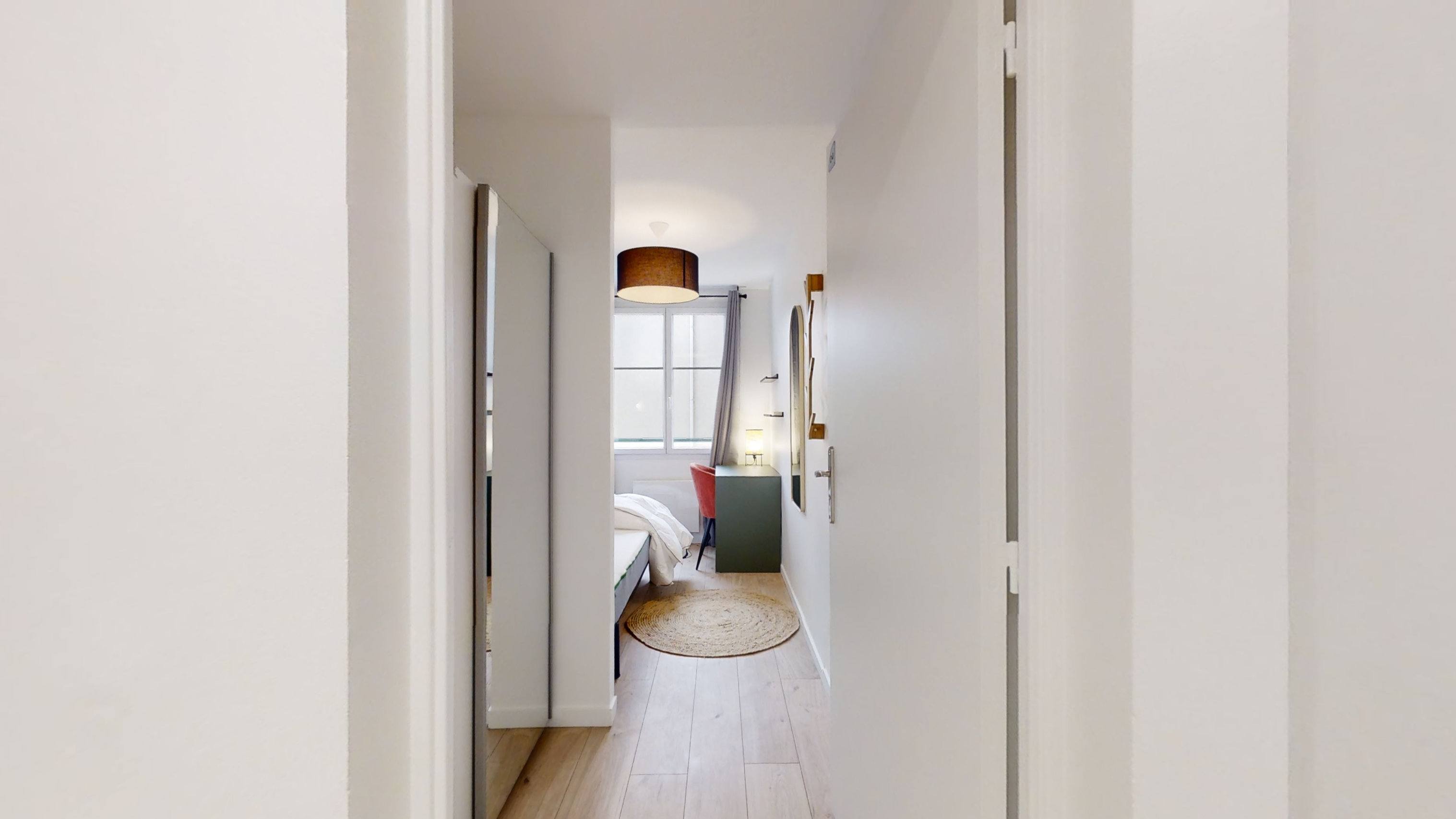 La chambre "Room 4" est un petit cocon de 9 m² conçu spécialement pour une personne. Elle comprend un lit double confortable avec de la literie de qualité, une armoire où vous pouvez ranger vos affaires, ainsi qu'un bureau avec une lampe pour vos heures d'étude ou de travail. La salle de bain est partagée avec les autres locataires et assure confort et intimité.