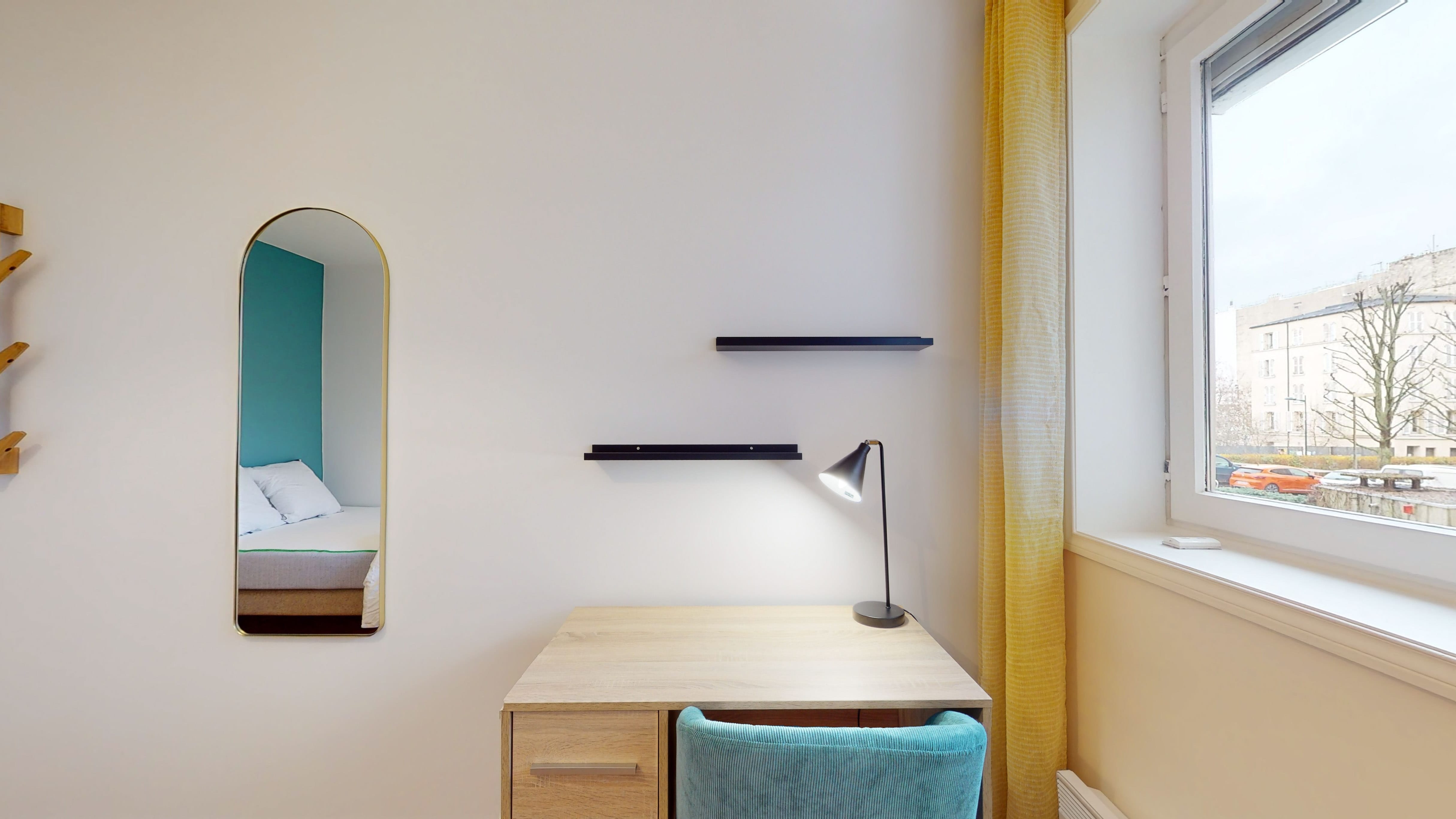 La chambre Room 2, de 12 m², est conçue pour une personne. Avec son confortable lit double, une grande armoire pour toutes vos affaires, un bureau pour travailler et une chaise, c'est un espace à vous où vous pourrez vous reposer et étudier en toute tranquillité. La chambre partage une salle de bain moderne avec douche, lavabo et toilettes.
