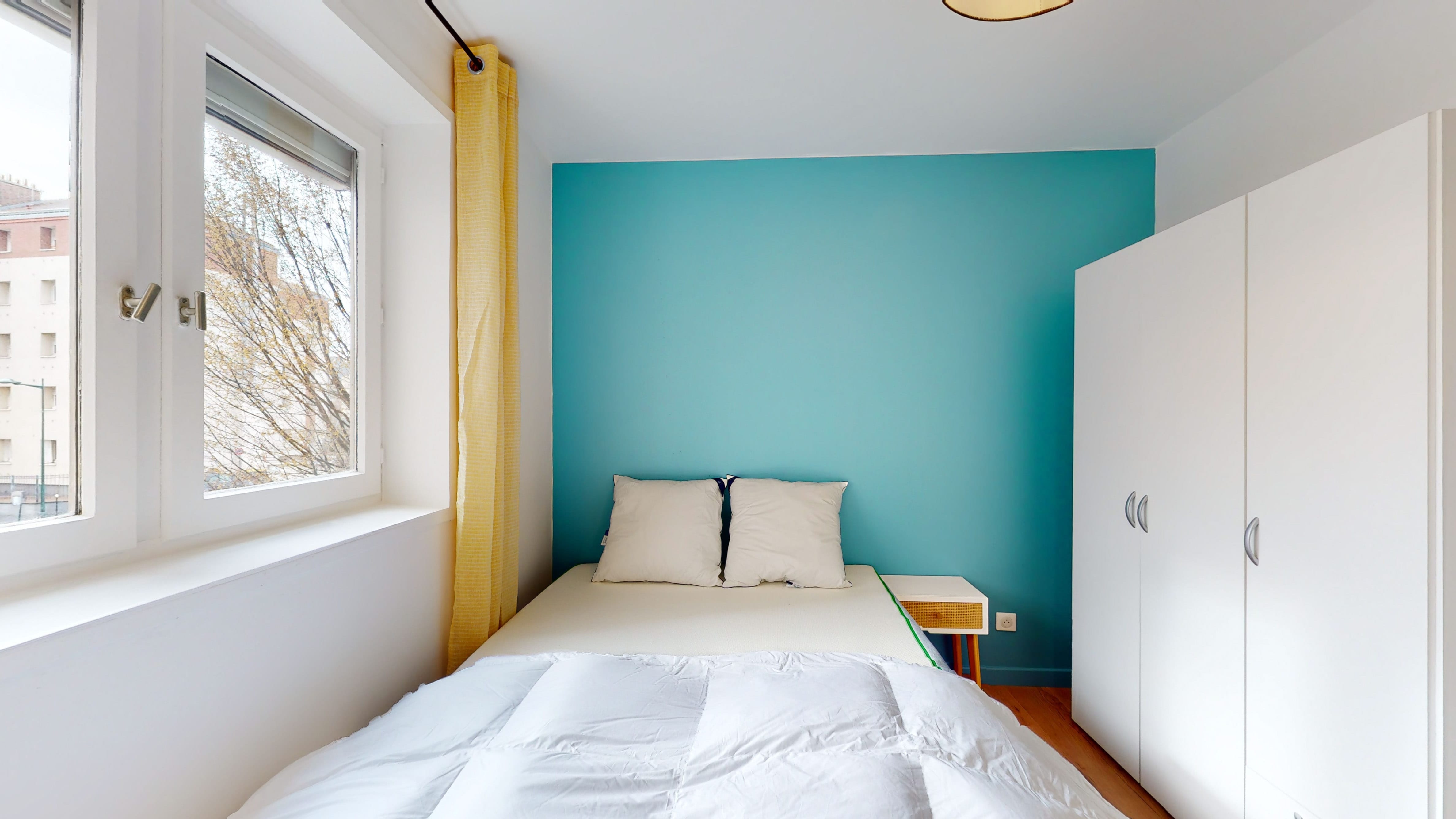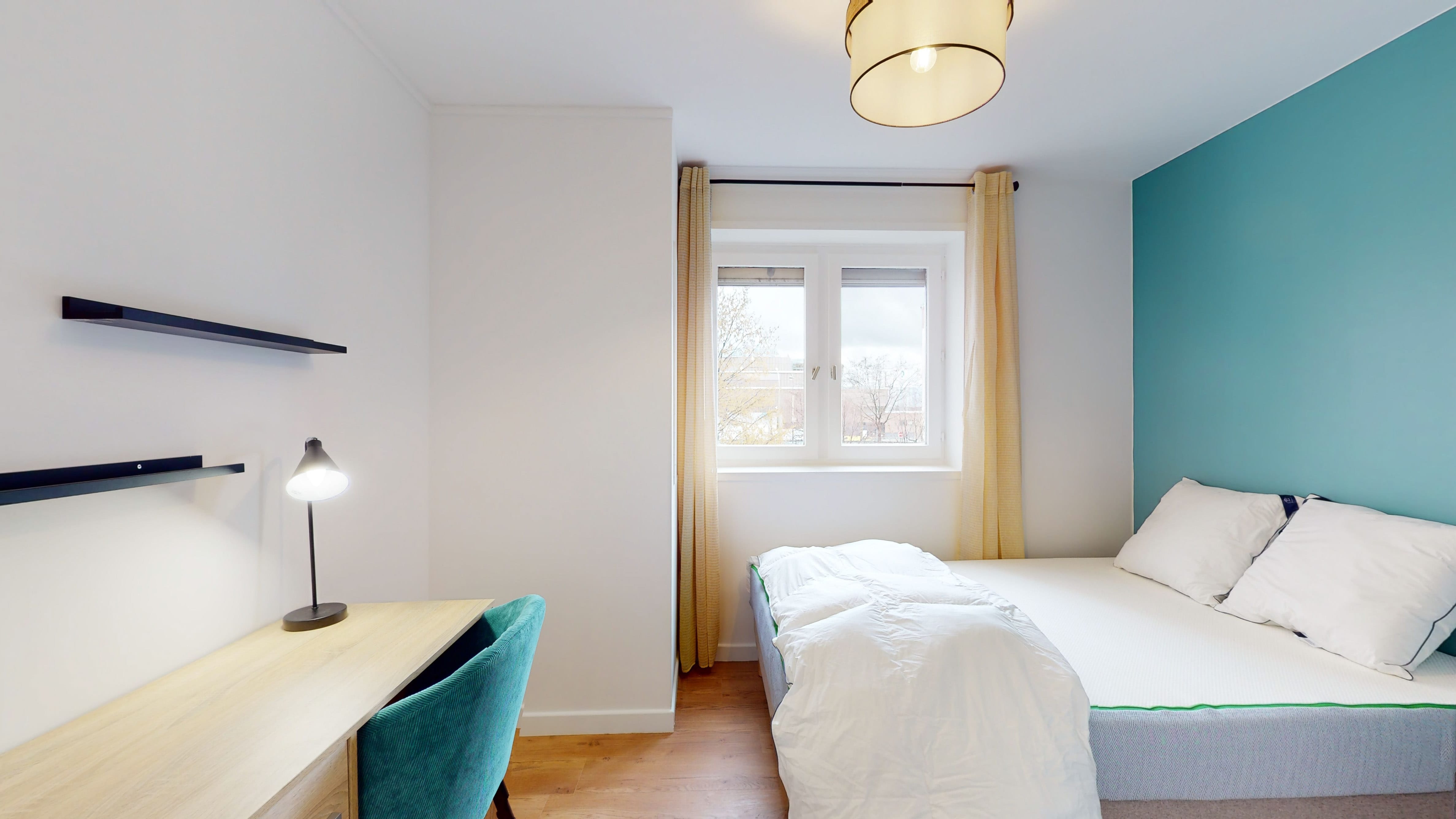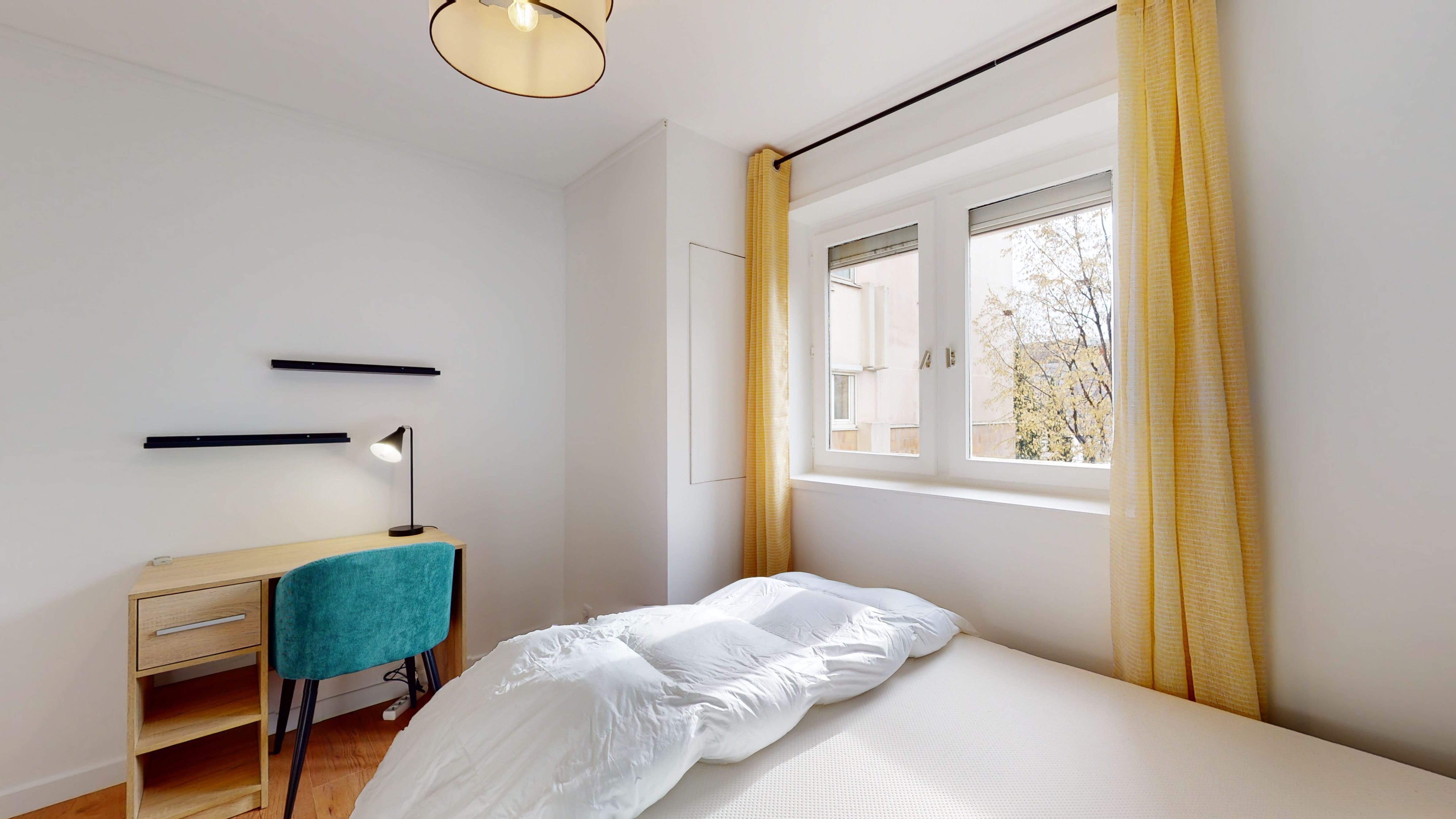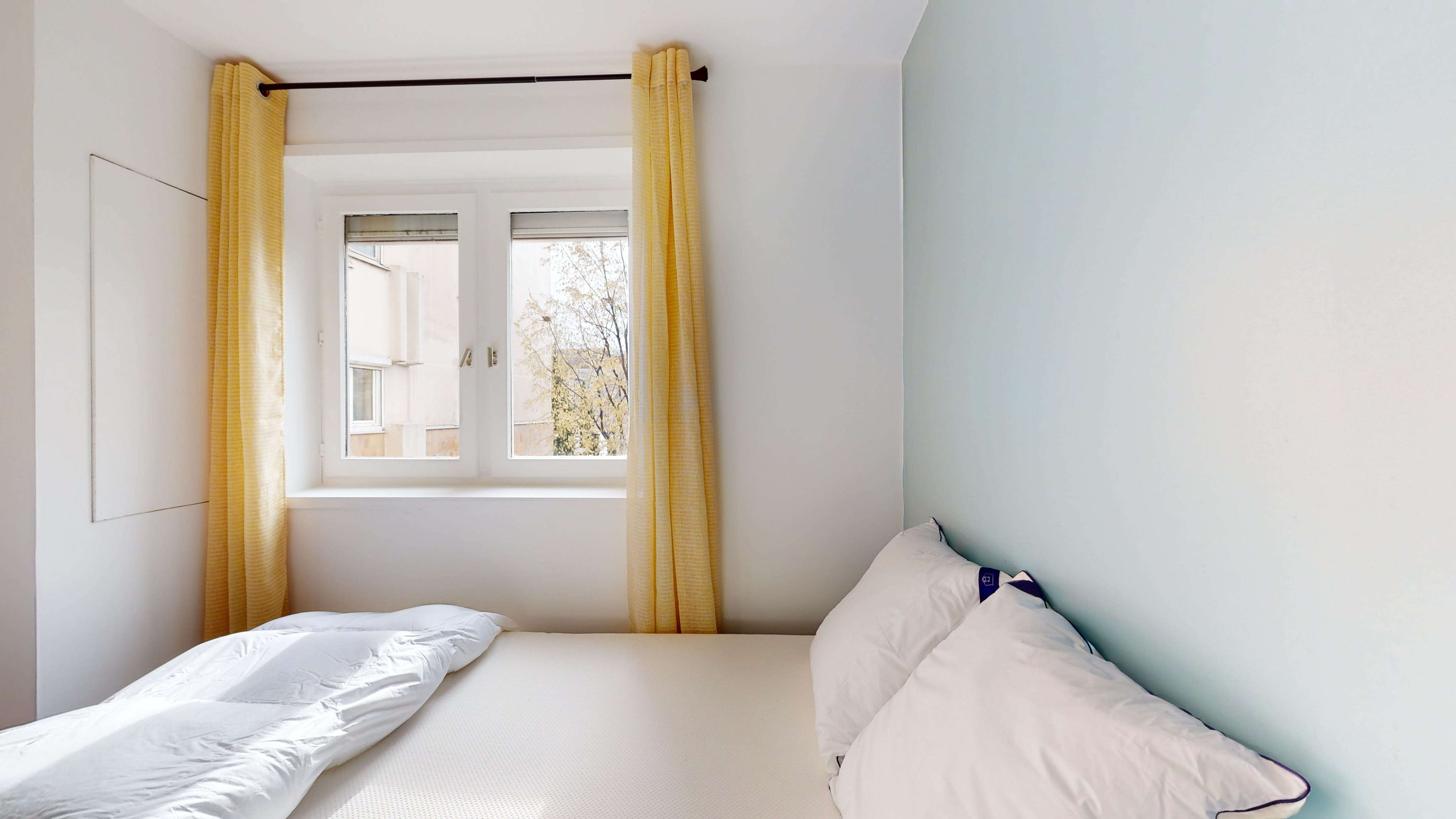La "Room 3" est spécialement conçue pour une personne. D'une superficie de 10 m², elle est meublée avec un lit double confortable, une armoire pour vos vêtements, une chaise et un bureau pour travailler ou étudier en paix. La chambre partage une salle de bain propre et moderne avec d'autres locataires.