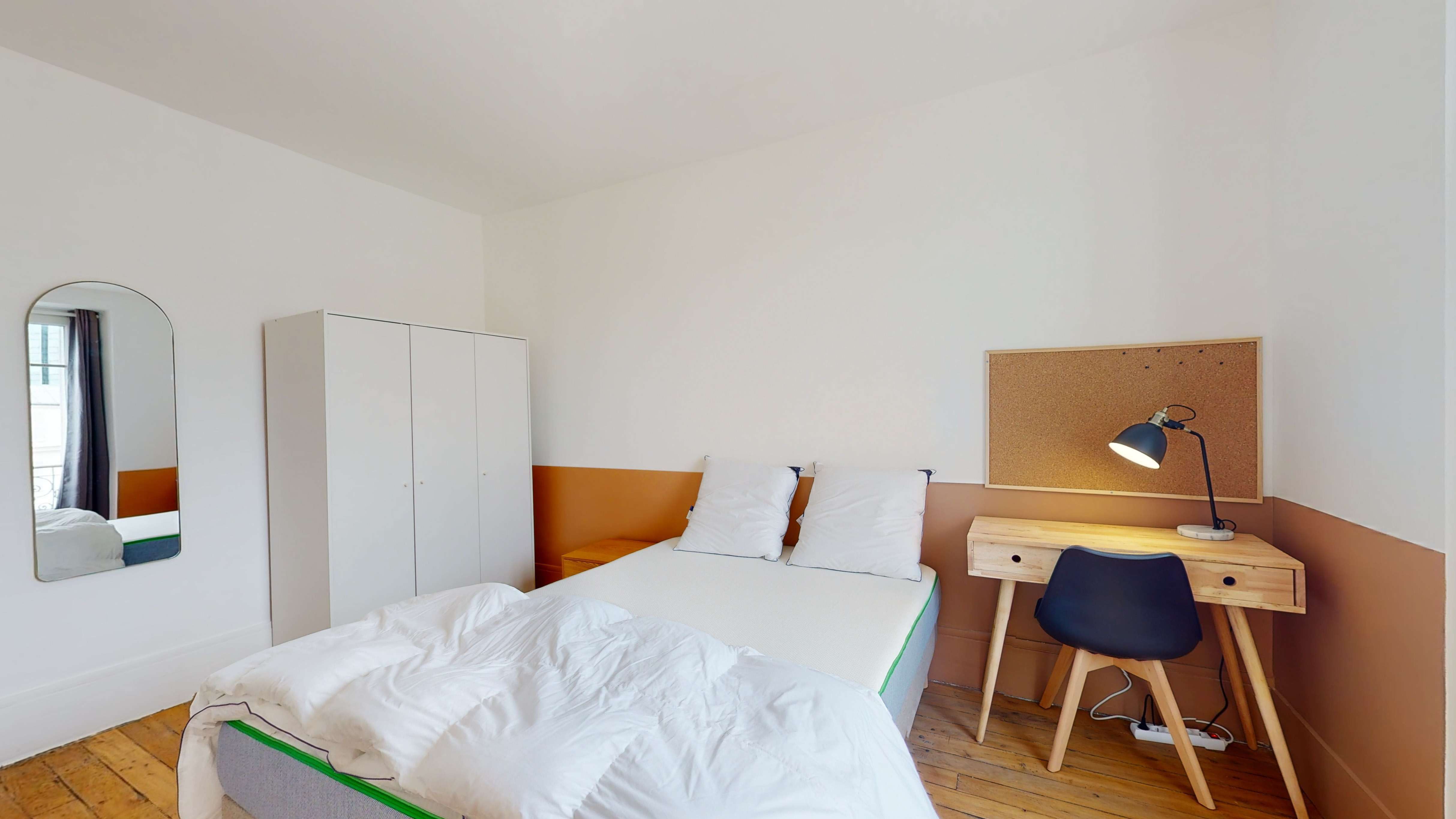 La chambre Room 1 est un petit cocon personnel de 13 m². Elle comprend un lit double confortable, une armoire pour ranger vos affaires, ainsi qu'un bureau et une chaise pour étudier ou travailler en toute tranquillité. La chambre partage une salle de bain moderne avec d'autres locataires, garantissant ainsi votre confort.