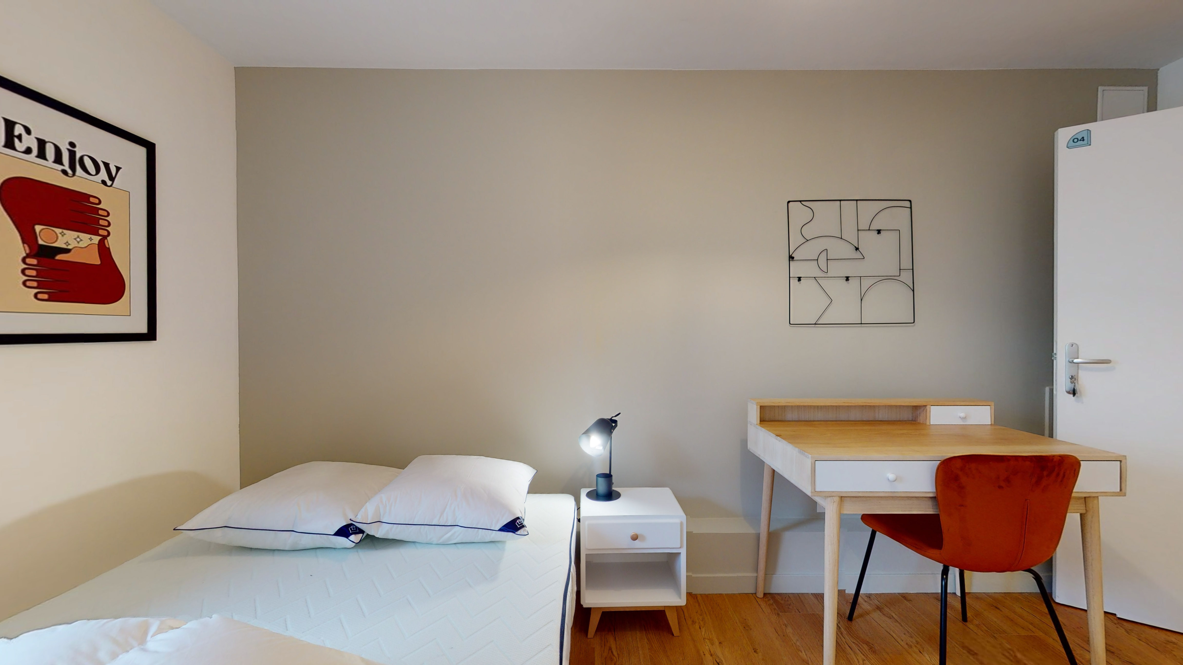 La chambre "Room 4" est pensée pour une personne, avec un espace douillet de 11 m². Elle est aménagée avec un lit double, une armoire pour ranger ses vêtements, ainsi qu'un bureau et une chaise pour travailler ou étudier tranquillement. La chambre bénéficie d'une lumière douce et dispose d'une salle de bain partagée avec d'autres locataires.