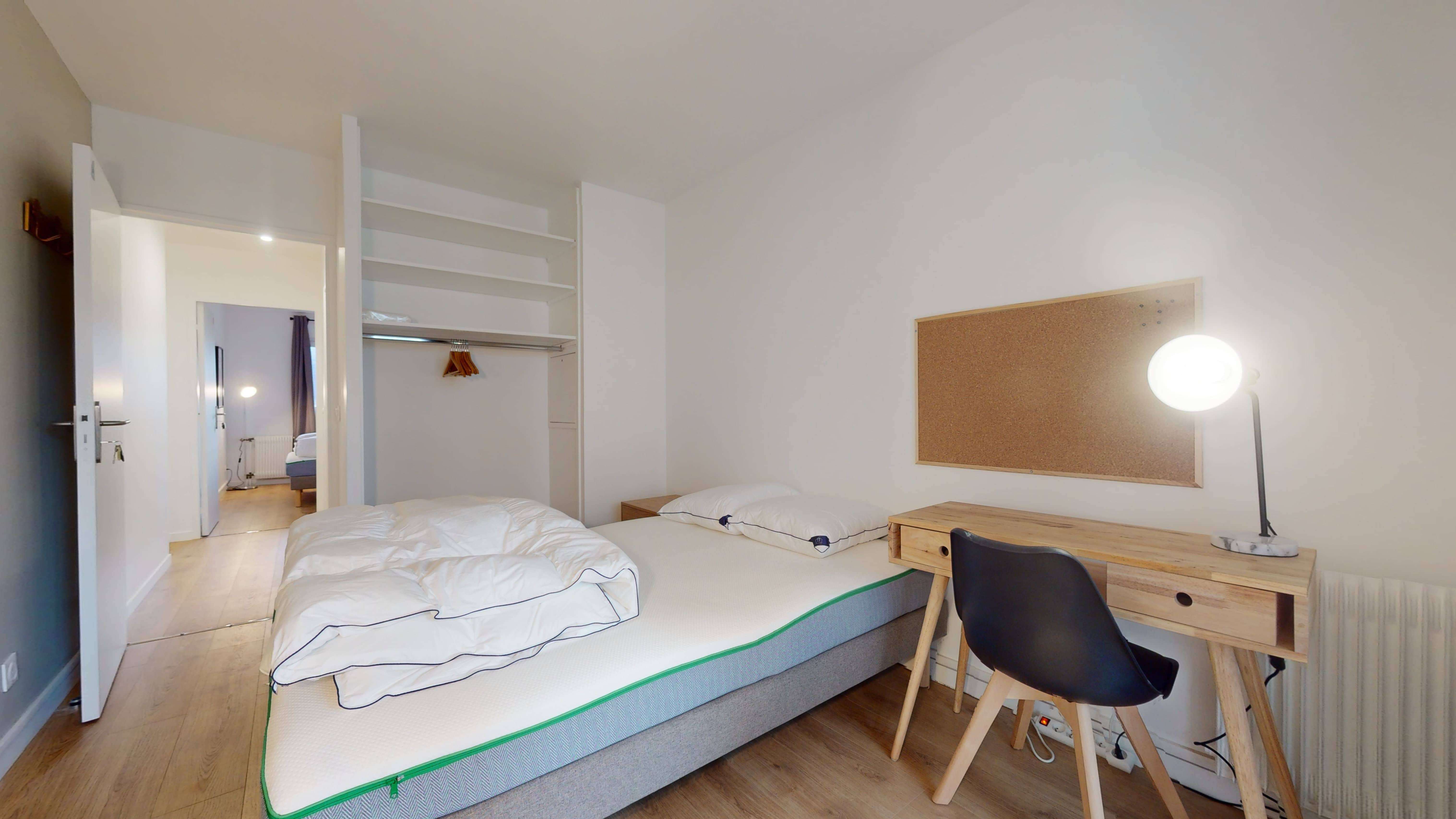La chambre nommée "Room 4" est un studio conçu spécialement pour une personne, offrant un espace privé et confortable. Avec un lit double douillet, une armoire pour vos affaires, un bureau et une chaise pour travailler, cette pièce est le parfait petit cocon. La chambre bénéficie aussi d'une salle de bain partagée bien équipée avec douche, lavabo et toilettes.