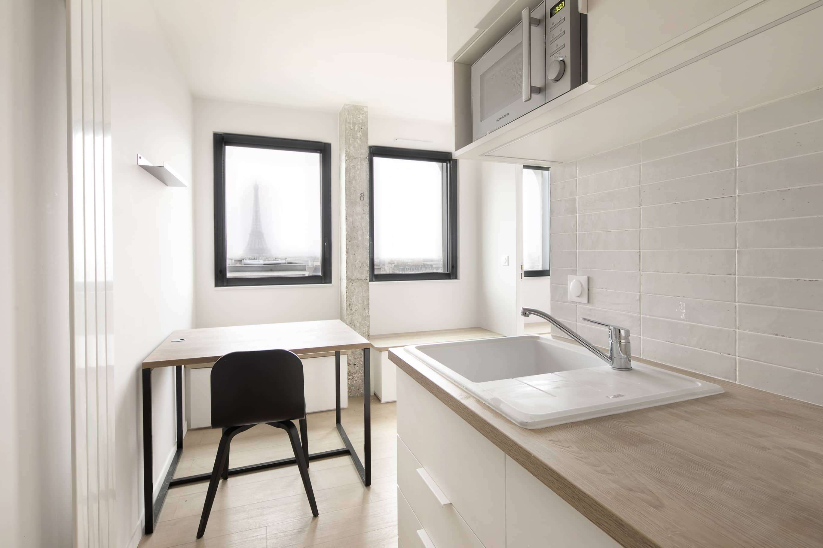 La chambre One-bedroom Flat (T2) 806, située au huitième étage, est un espace privé et bien aménagé conçu pour deux personnes. Elle dispose d'une salle de bain privative avec douche et lavabo, ainsi que d'une kitchenette pratique. L'unité est équipée d'un lit double confortable, d'une armoire spacieuse pour vos affaires, d'un bureau et d'une chaise pour travailler ou étudier, et de tout le nécessaire pour un séjour agréable.