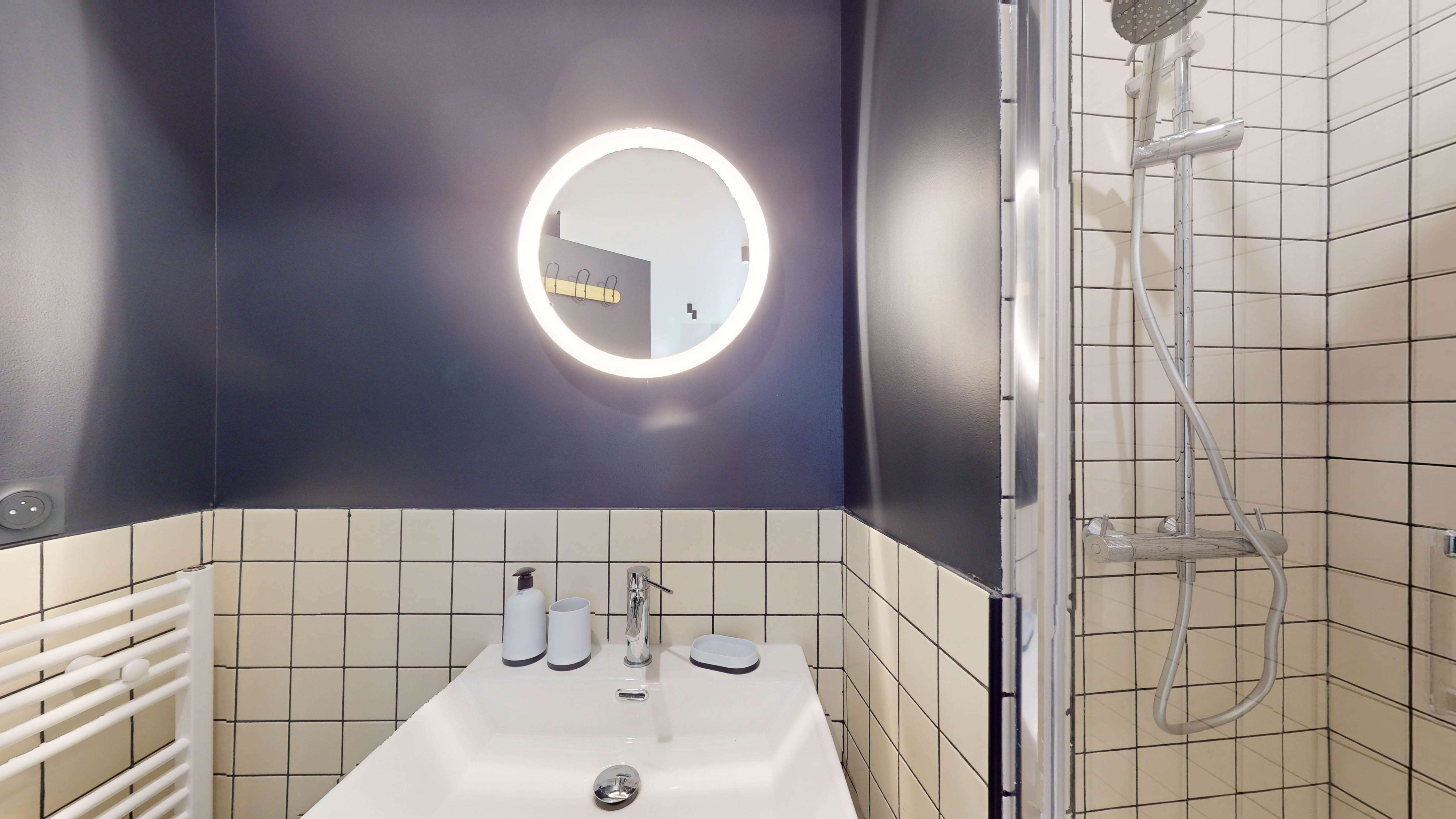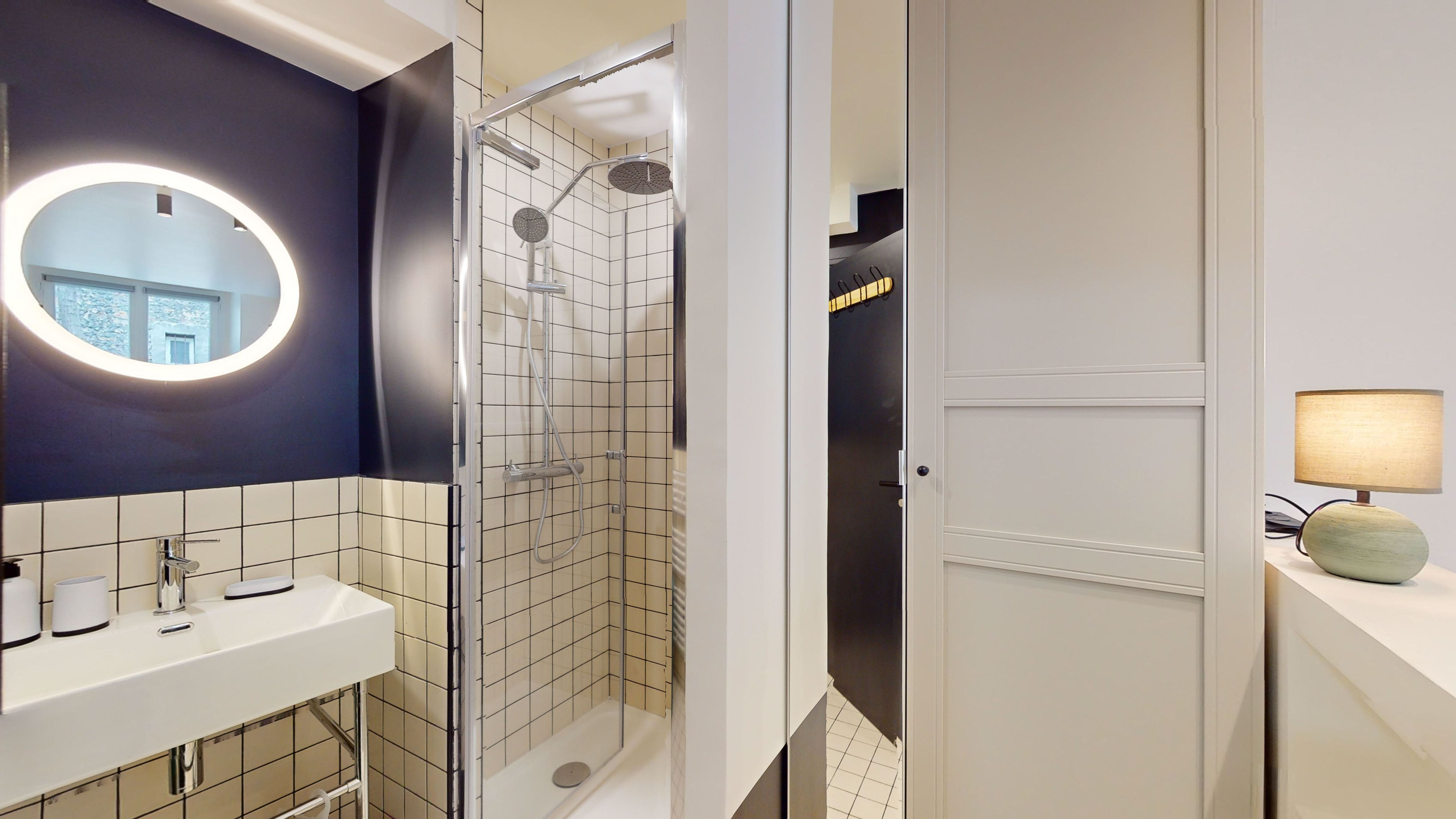 Votre chambre privée, située au premier étage, est un véritable cocon de confort. Elle est meublée d'un lit double avec des rangements intégrés, une armoire pour vos affaires, un bureau et une chaise pour travailler ou étudier. Vous bénéficiez également d'une salle de bain privée avec douche et lavabo. La chambre est conçue pour une personne et offre tout le nécessaire pour un quotidien agréable.