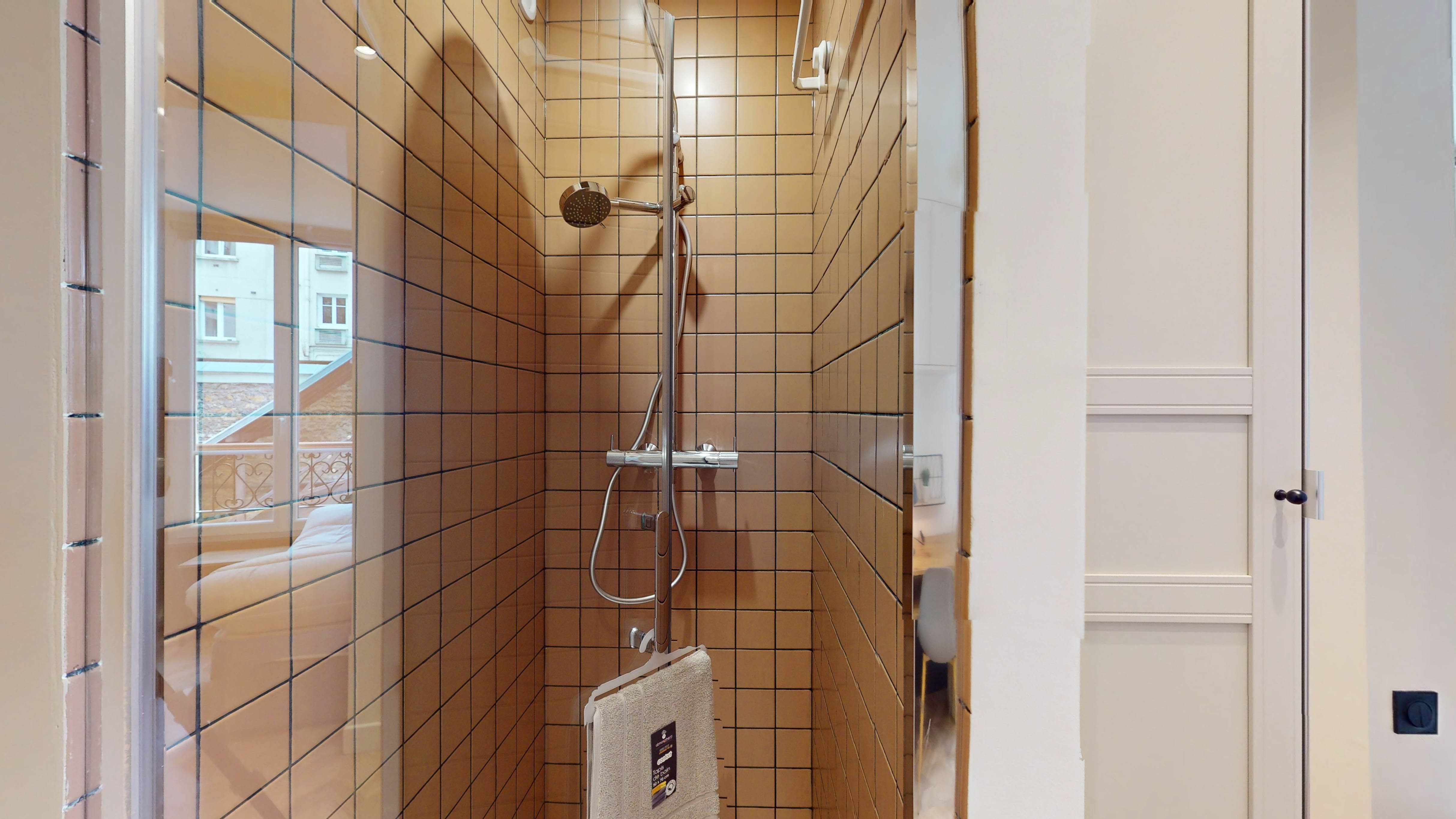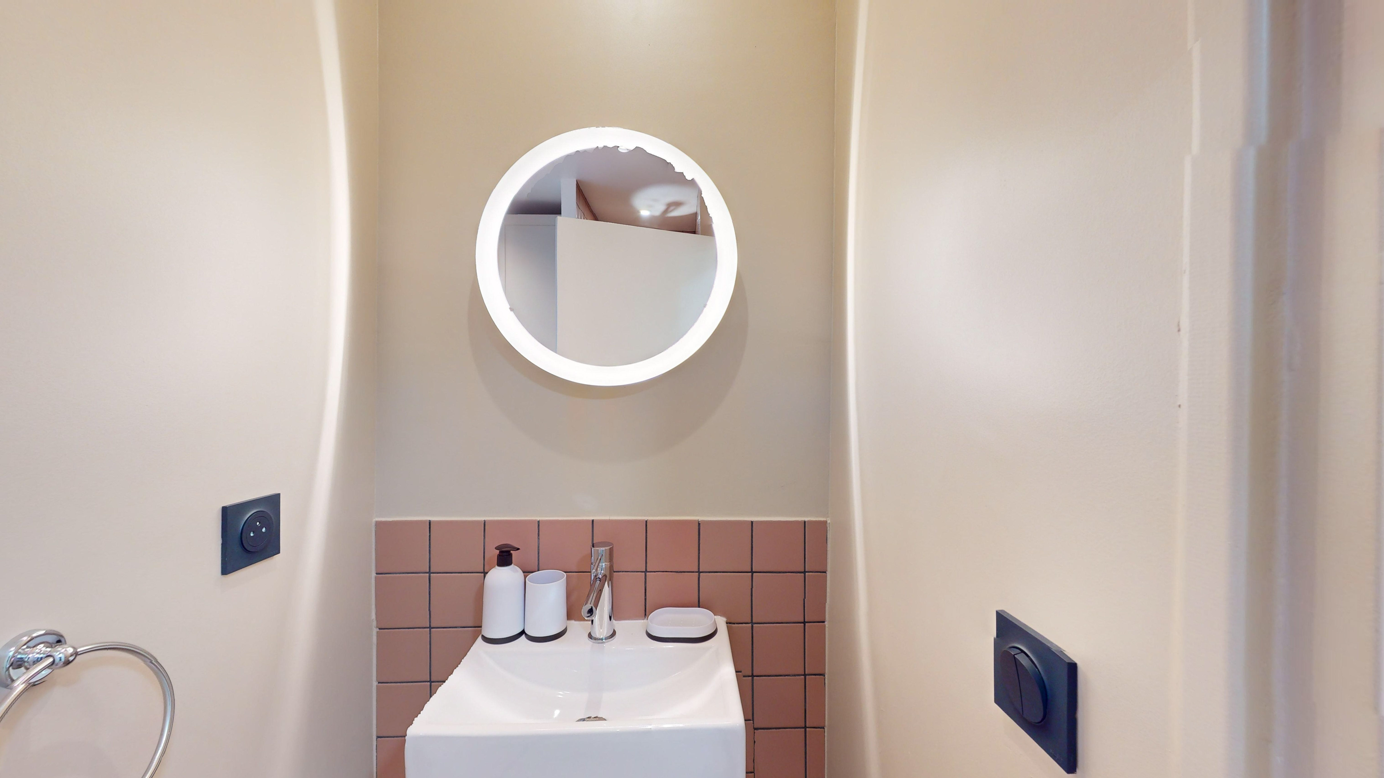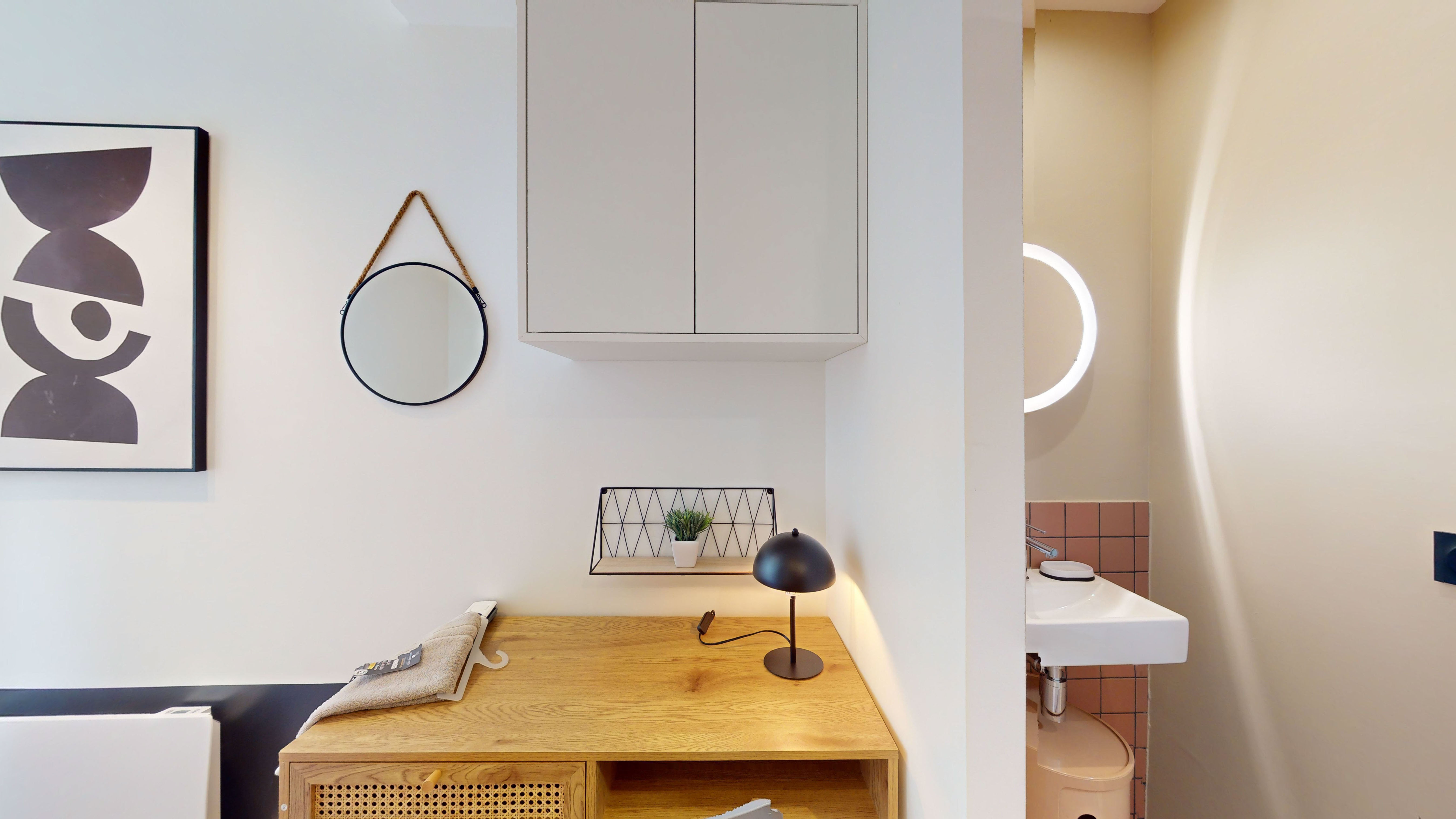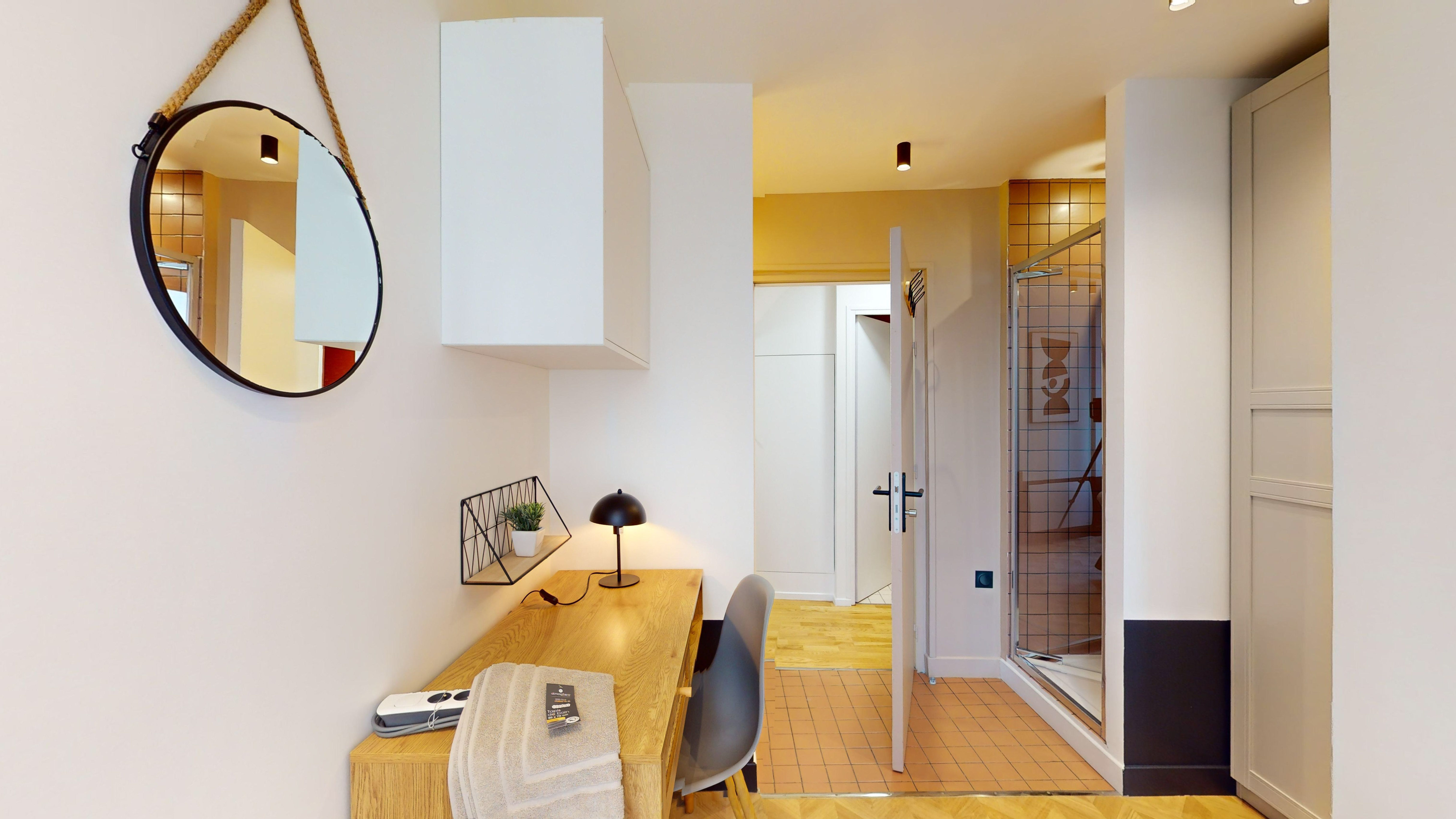 Votre chambre privée, située au premier étage, est un cocon parfait pour une personne. Elle est équipée d'un lit double confortable avec des rangements intégrés, une armoire pour vos affaires, ainsi qu'un bureau et une chaise pour travailler ou étudier en toute tranquillité. La salle de bain privée comprend une douche et un lavabo. La chambre est également pourvue de tous les éléments nécessaires à votre confort : internet haut débit, linge de lit, lampe de bureau et bien plus encore.