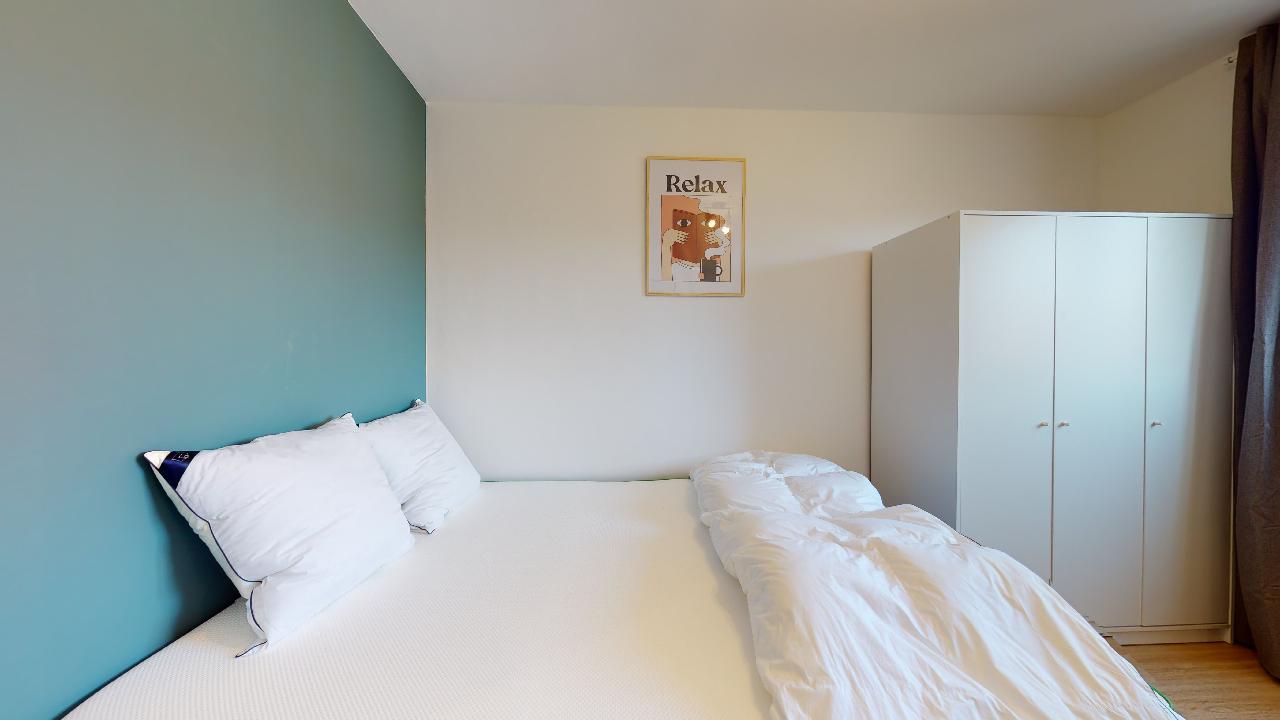 La "Room 2" est un petit cocon privé juste pour vous. Elle est aménagée d'un lit double confortable, d'une armoire où ranger vos affaires, d'un bureau et d'une chaise pour travailler ou étudier en toute tranquillité. La chambre partage une salle de bain moderne avec douche et toilettes avec d'autres locataires.