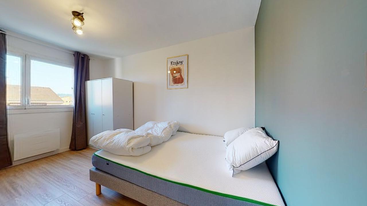 La chambre 3, prévue pour une personne, est un espace douillet de 12 m². Elle est meublée avec un lit double confortable, une armoire pour vos affaires, ainsi qu'une chaise et un bureau pour étudier ou travailler. Cette chambre partage une salle de bain bien équipée avec d'autres locataires.