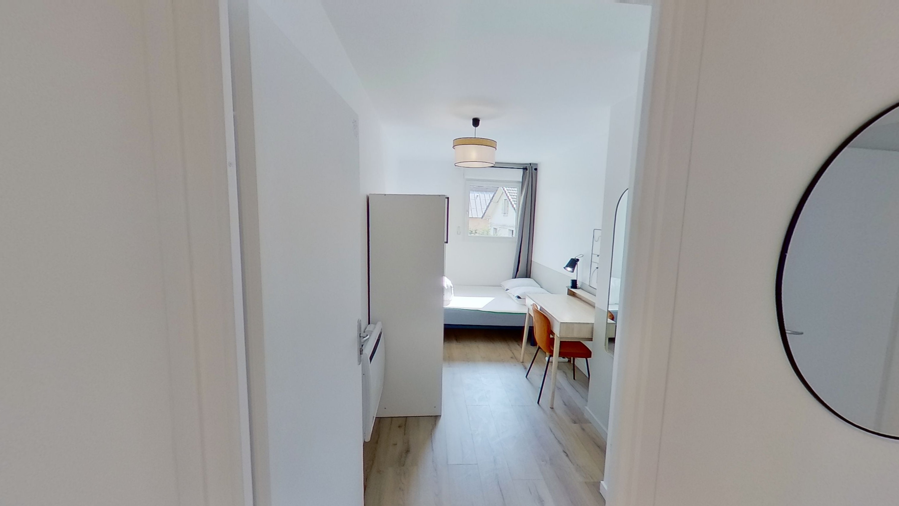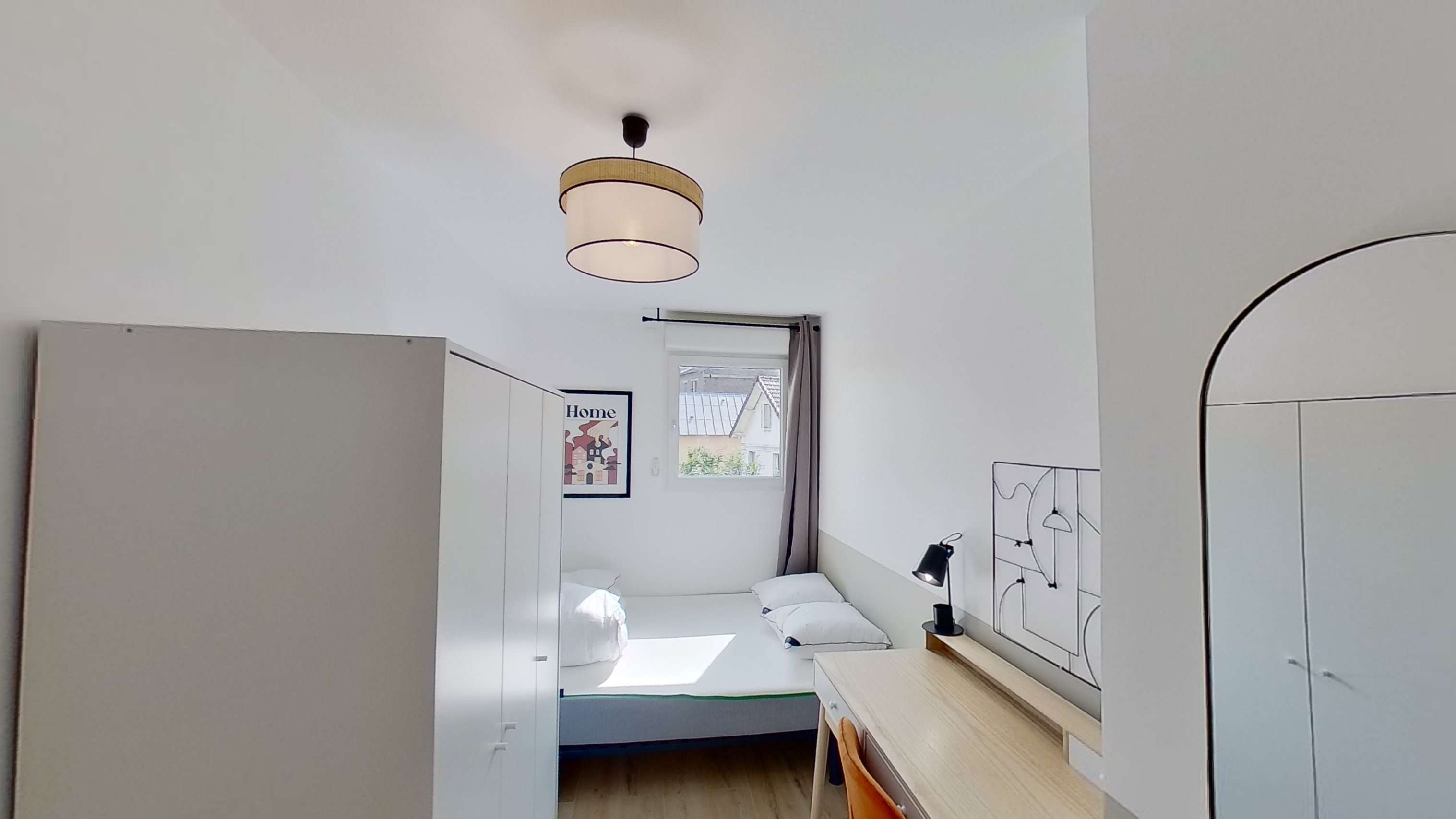 La chambre Room 1 est conçue pour une personne. Elle fait 10 m² et comprend un lit double avec de la literie de qualité, une armoire spacieuse pour ranger vos affaires, ainsi qu'un bureau et une chaise pour vos moments de travail ou de lecture. La chambre partage une salle de bain avec douche et toilettes avec d'autres locataires.