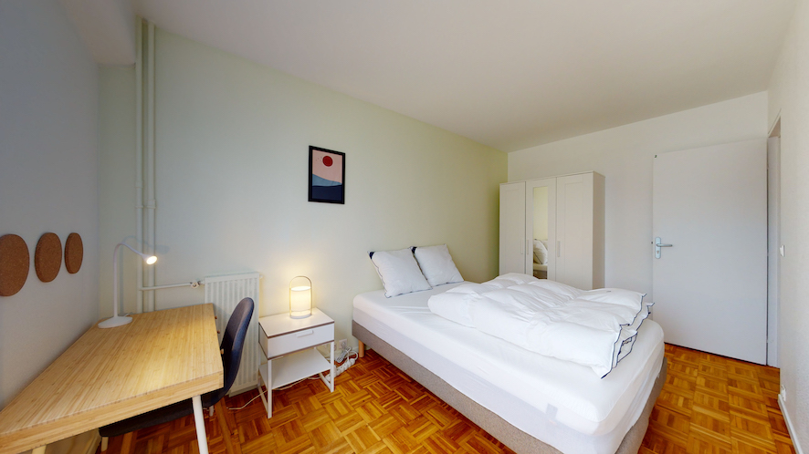 La chambre Room 2 est un cocon douillet de 12 m², pensée spécialement pour une personne. Vous y trouverez tout le confort nécessaire : un lit double pour des nuits reposantes, une armoire pour ranger vos affaires, une chaise et un bureau pour étudier ou travailler. Elle partage une salle de bain moderne avec d'autres colocataires.