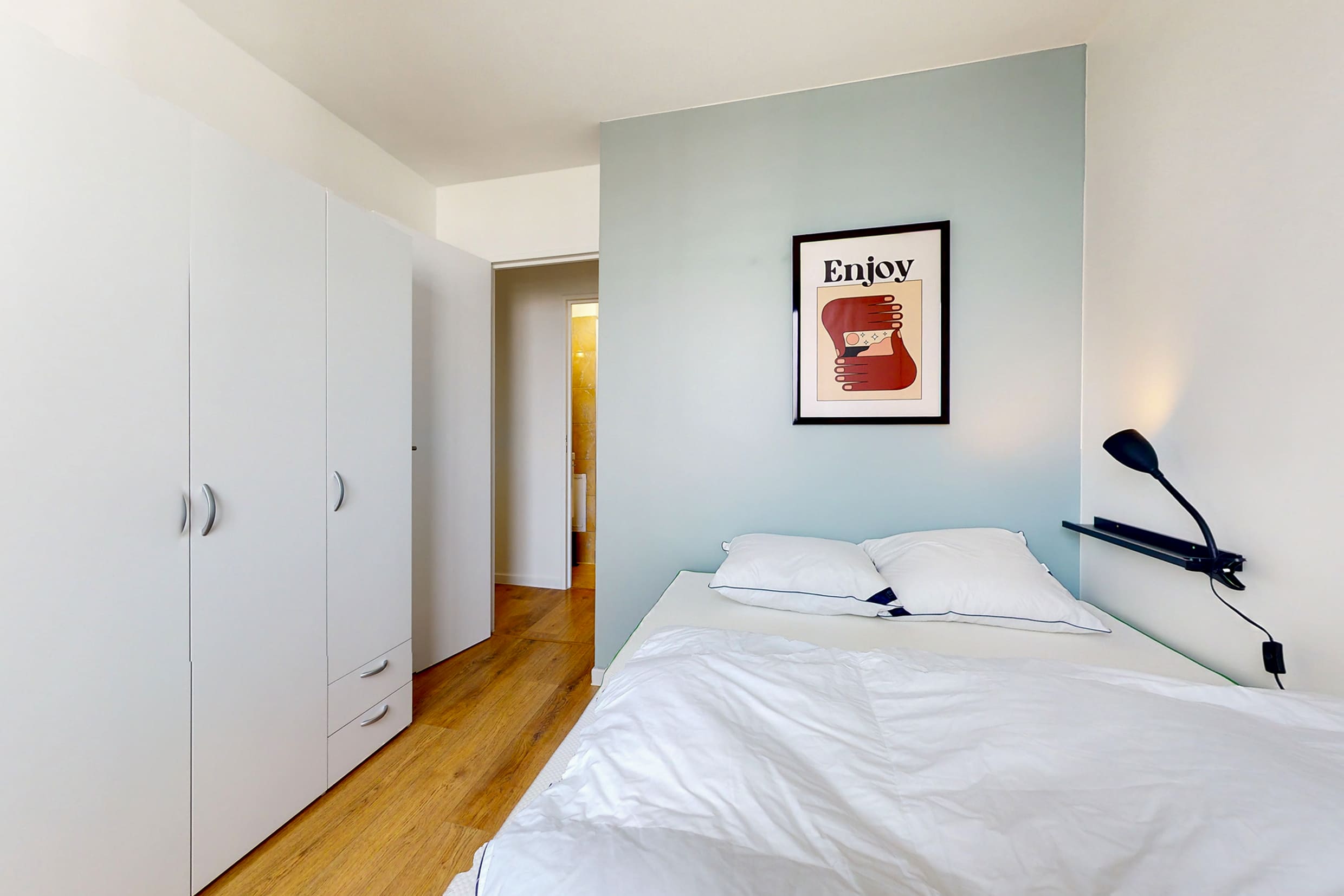 La chambre Room 1 est conçue spécialement pour une personne. Elle comprend un lit double confortable, une armoire pour ranger vos affaires, ainsi qu'une chaise et un bureau pratiques pour travailler ou étudier. La chambre est également équipée du nécessaire de literie et partage une salle de bain avec douche et toilettes avec les autres locataires.