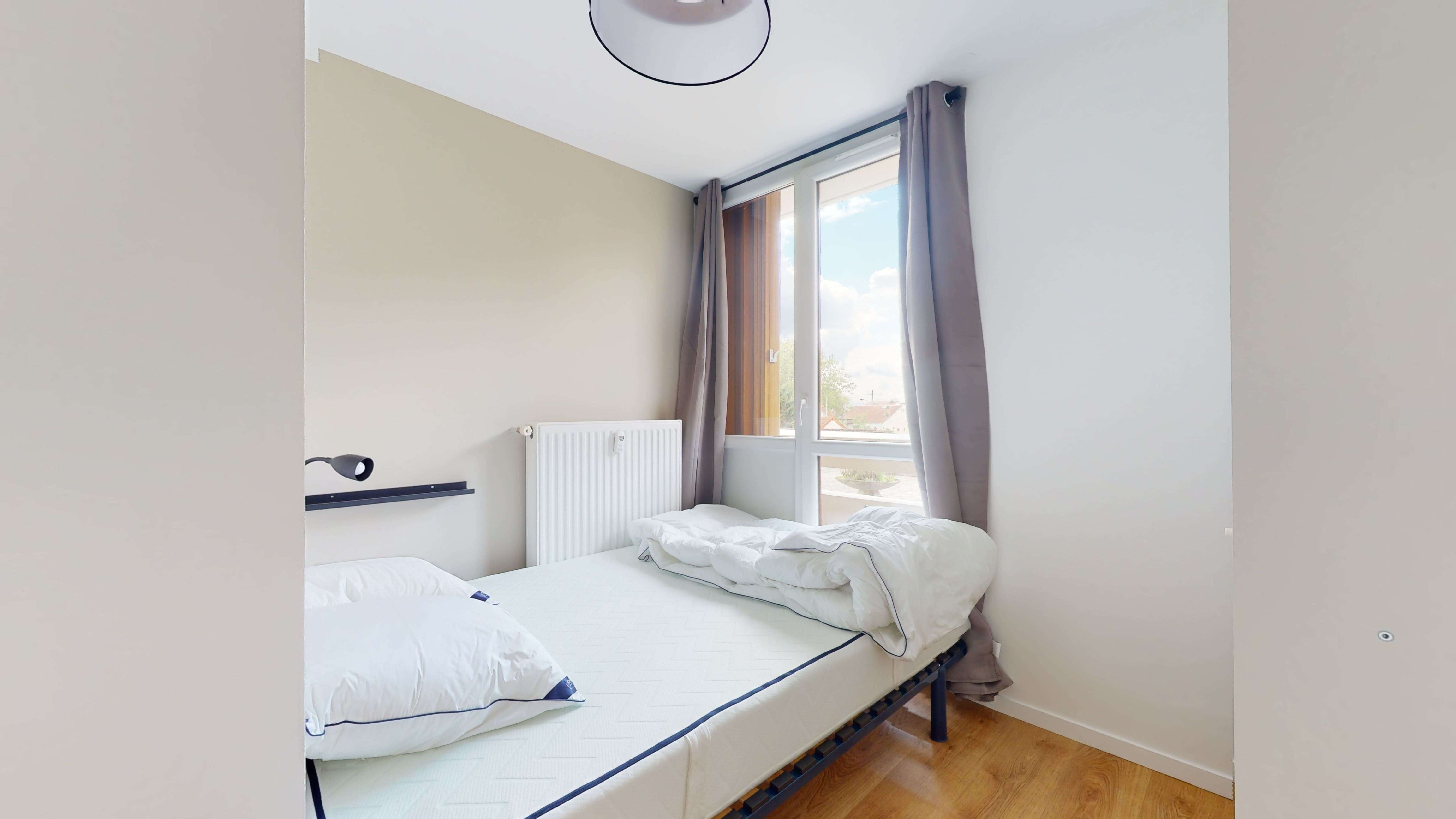 La chambre Room 5, d'une superficie de 9 m², est spécialement conçue pour une personne. Elle offre un doux lit double avec une literie de qualité, une armoire pour vos affaires et un bureau pour étudier ou travailler. Avec son internet haut débit et ses autres commodités, cette pièce est un cocon personnel au sein de la colocation.