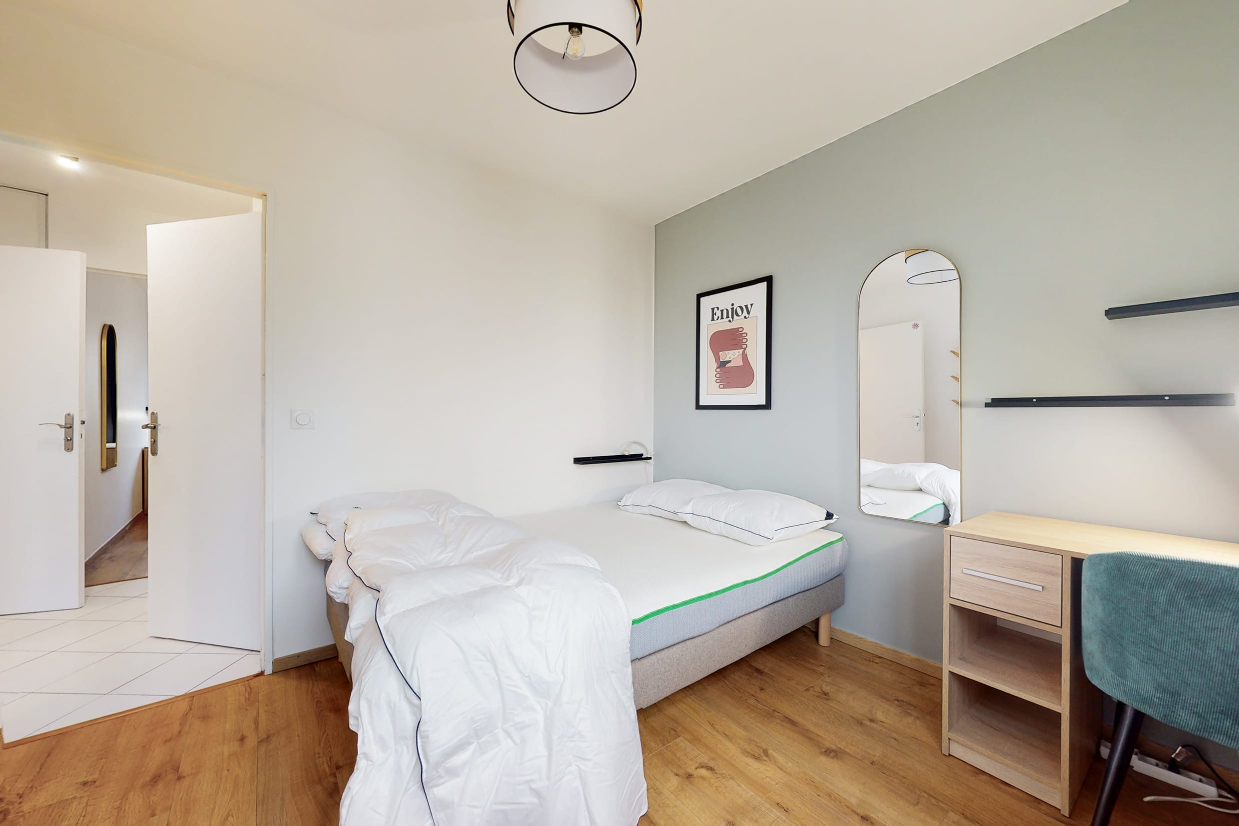 Room 1 est conçue spécialement pour vous offrir un espace personnel confortable. Elle mesure 9 m² et est meublée d'un lit double avec une literie de qualité, une armoire pour ranger vos vêtements, ainsi qu'un bureau et une chaise parfaits pour étudier ou travailler. Cette chambre partage une salle de bain complète avec une douche avec les autres locataires.