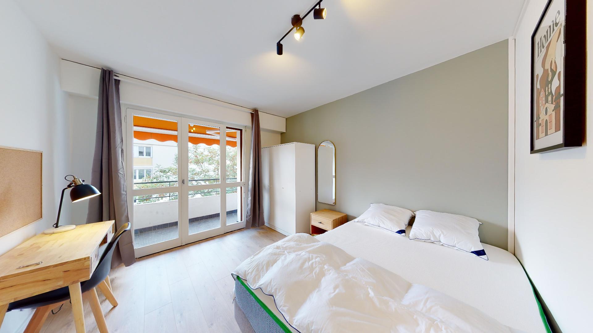 La chambre Room 4 est spécialement aménagée pour une personne et offre tout le confort nécessaire. Vous disposerez d'un lit double avec une literie de qualité, une armoire pour ranger vos affaires, une chaise, un bureau pour travailler et une lampe de bureau. La salle de bain est à partager avec vos colocataires et vous aurez aussi accès à un balcon partagé où vous pourrez prendre l'air.