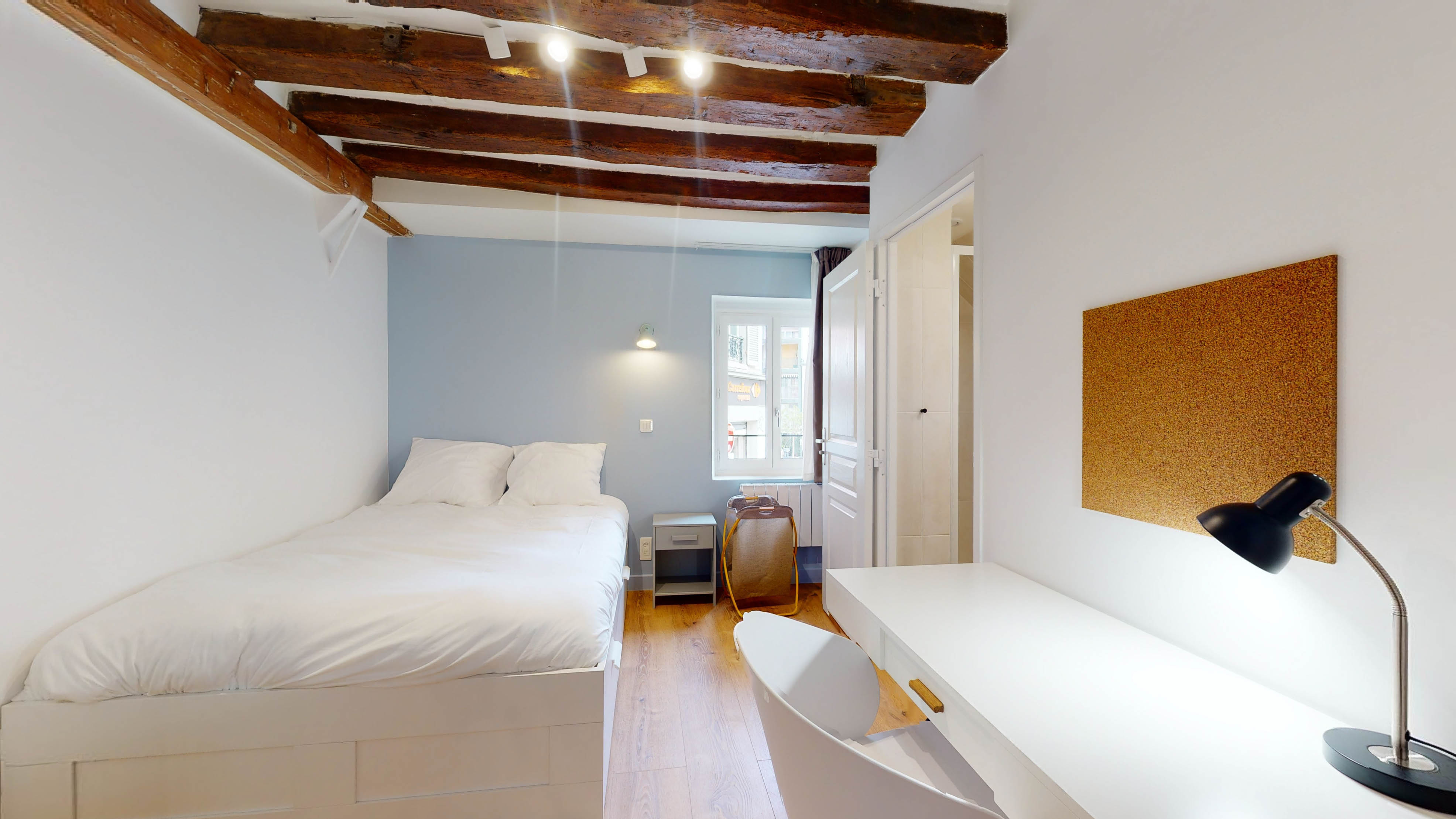La chambre "Room for one person - 5" est un cocon douillet de 14m2 situé au premier étage. Elle est parfaitement équipée pour une personne avec un lit double doté d'un rangement intégré, une armoire spacieuse pour vos affaires, une chaise confortable, un bureau pour travailler ou étudier, et une lampe de chevet pour vos lectures nocturnes. La salle de bain privée comprend une douche rafraîchissante et un lavabo. Le chauffage par radiateur assure votre confort tout au long de l'année.