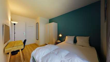 La chambre, nommée "Room 4", est parfaite pour une personne. Avec ses 12 m², elle dispose d'un lit double confortable, d'une armoire pour ranger vos affaires, d'une chaise et d'un bureau pour travailler. La chambre partage une salle de bain moderne avec douche et toilettes avec les autres locataires.