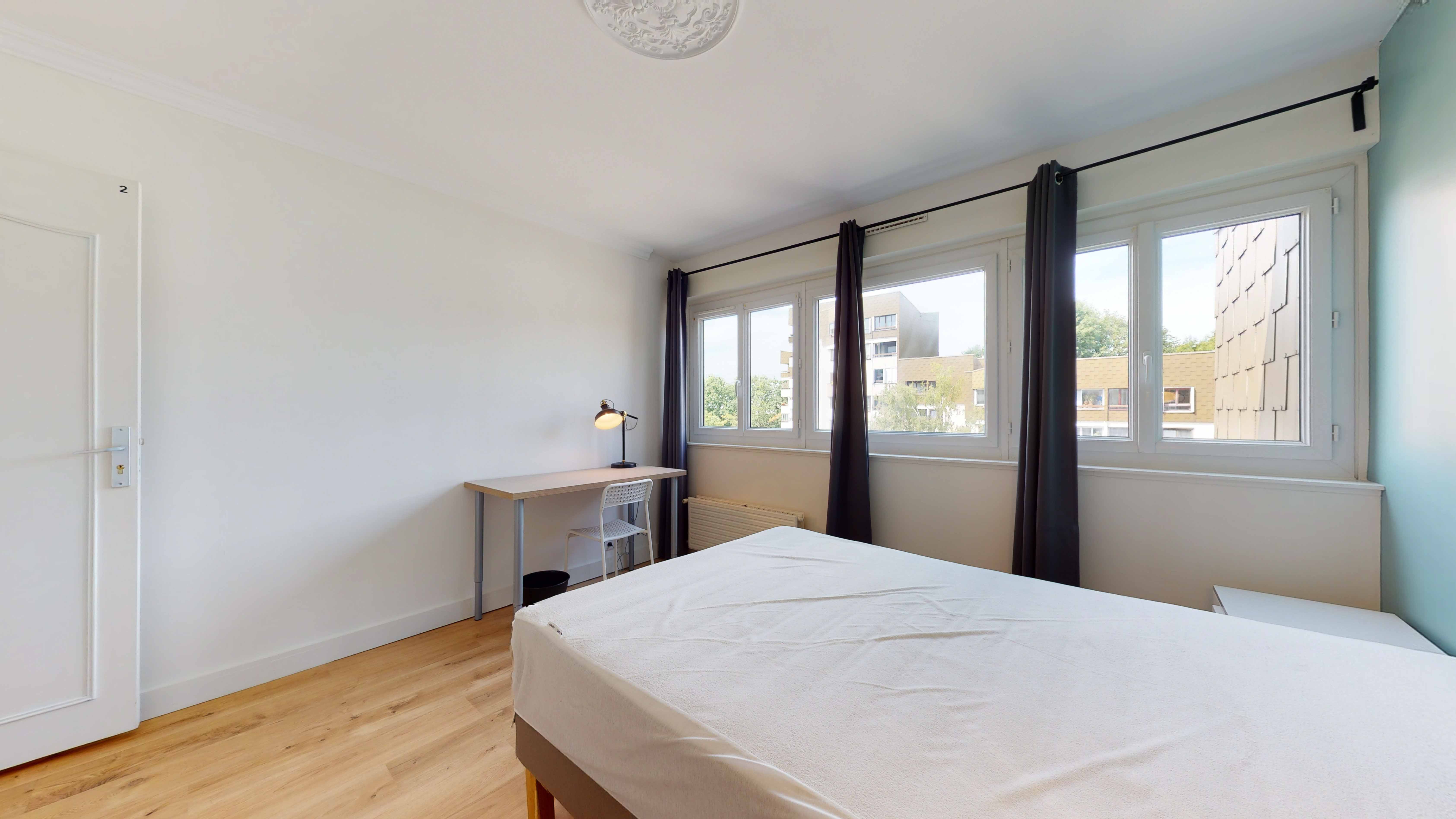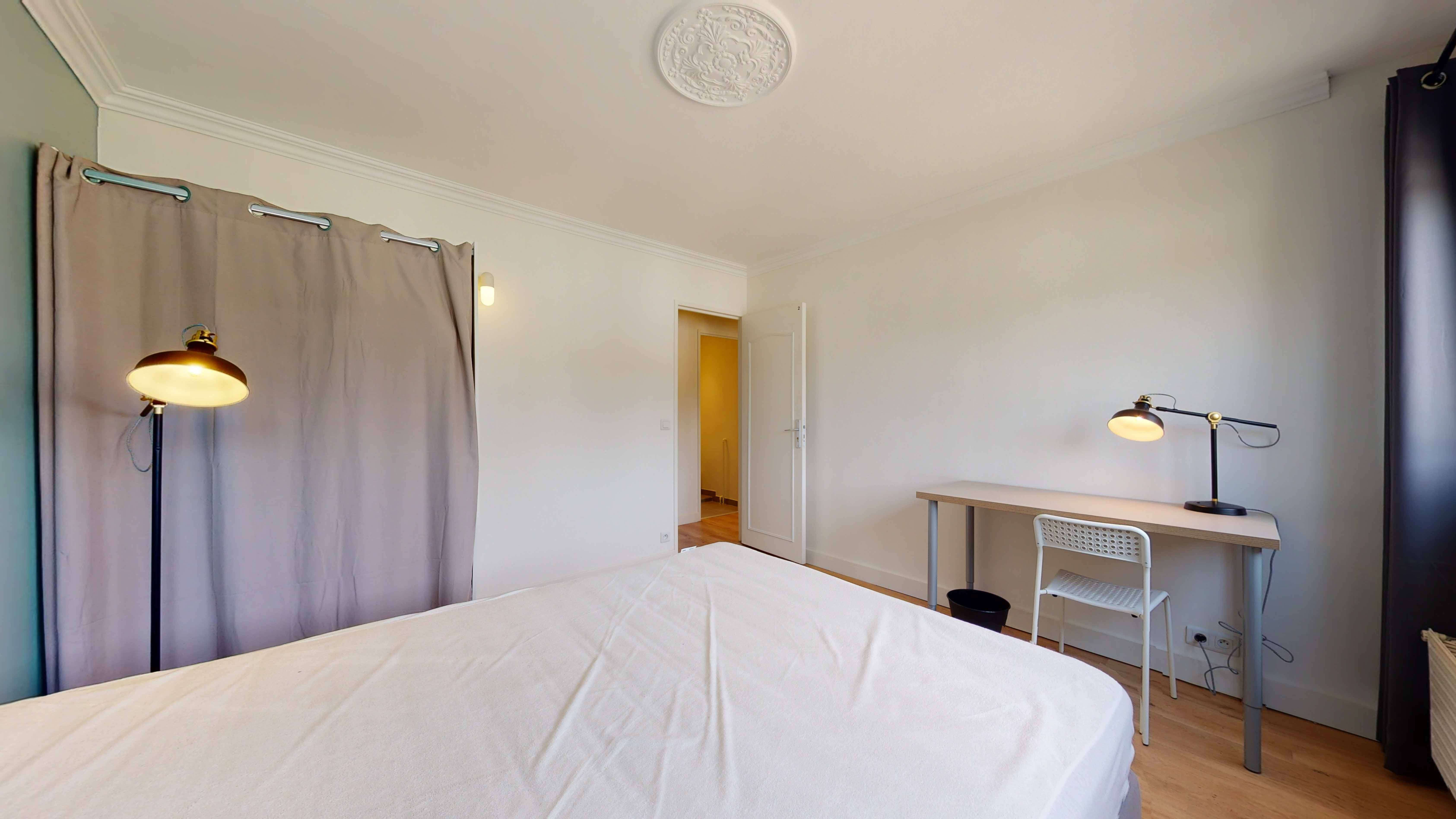 La chambre Room 2, d'une superficie de 8 m², est parfaite pour une personne. Elle dispose d'un confortable lit double et d'un espace de travail avec un bureau et une lampe, ainsi qu'une armoire pour vos vêtements. Cette chambre partage une salle de bain propre et fonctionnelle avec d'autres locataires.
