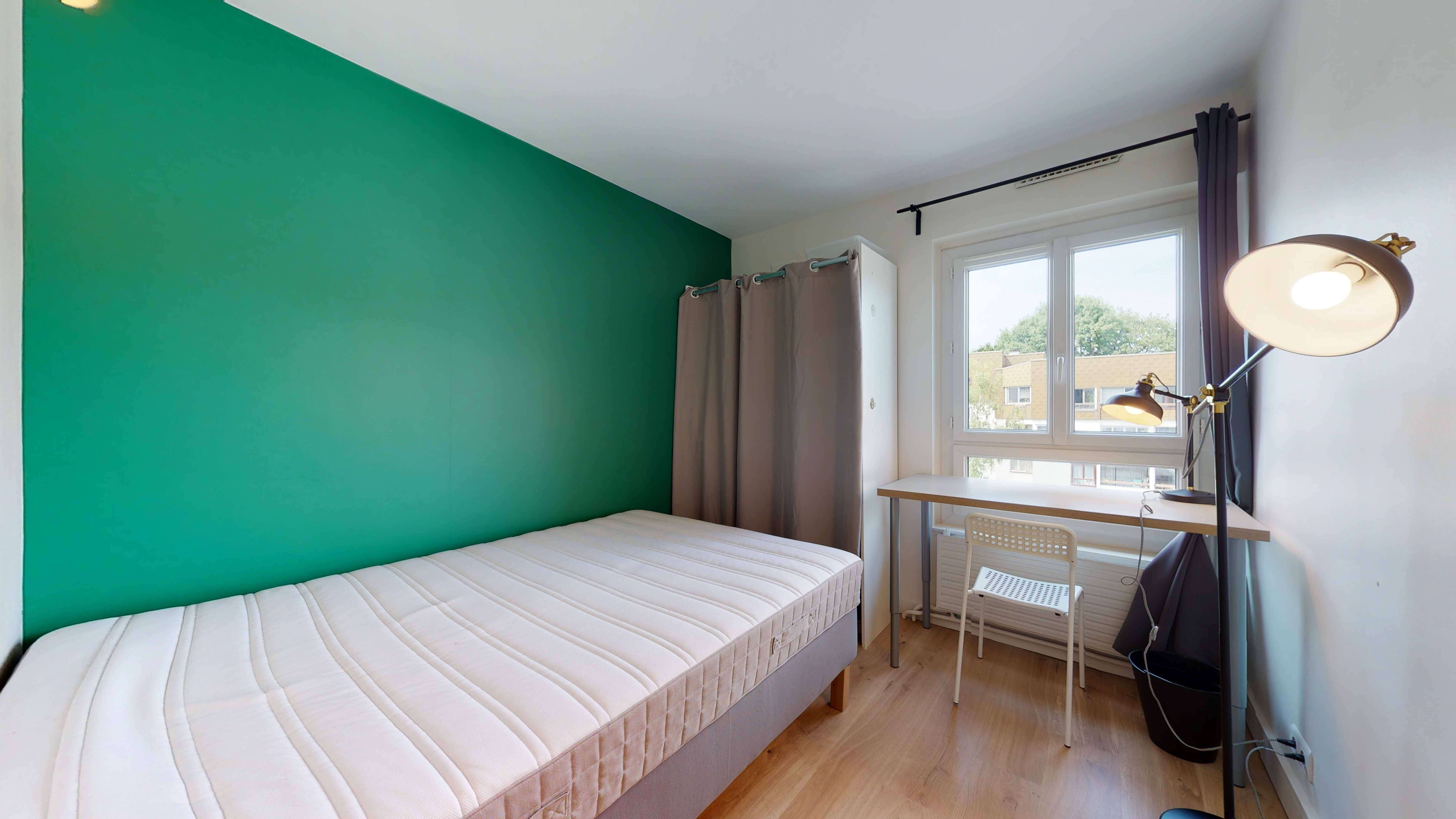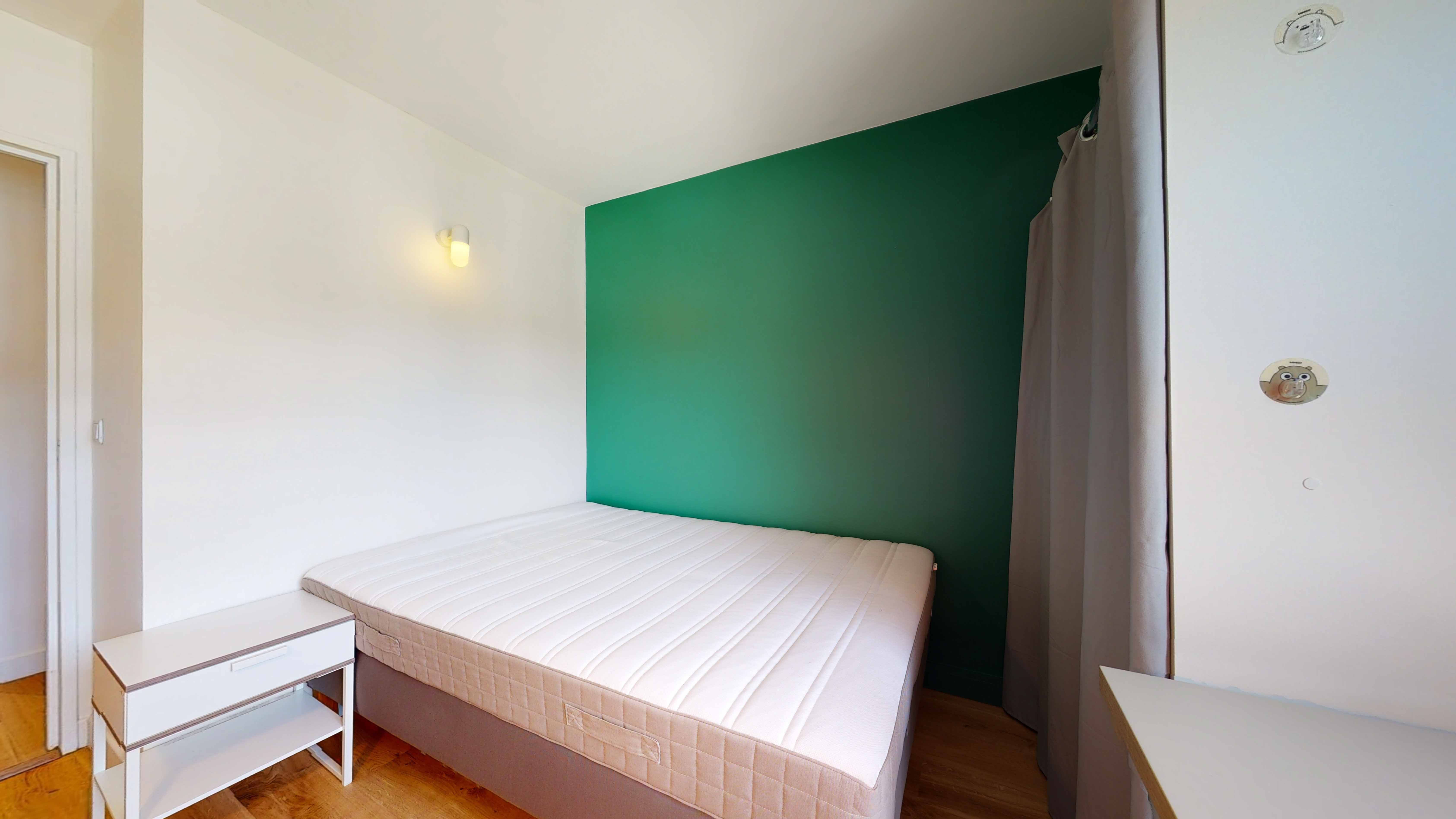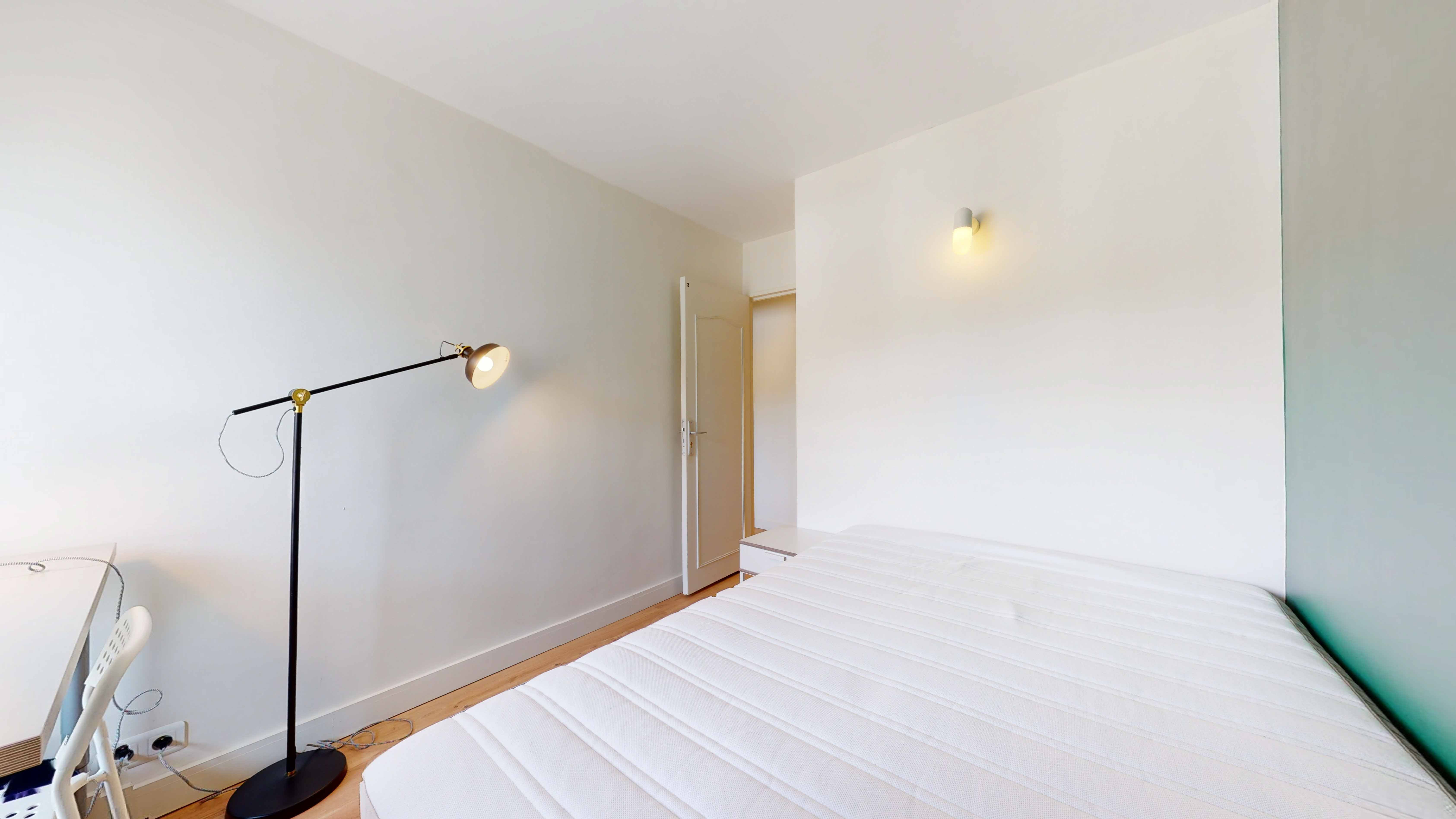 La chambre 3, conçue pour une personne, est un véritable cocon de confort. Elle dispose d'un lit double avec literie de qualité, d'une armoire pour vos affaires, d'une chaise et d'un bureau pour vos moments d'étude ou de travail. La superficie est de 12 m², et la chambre partage une salle d'eau avec douche, lavabo et toilettes.