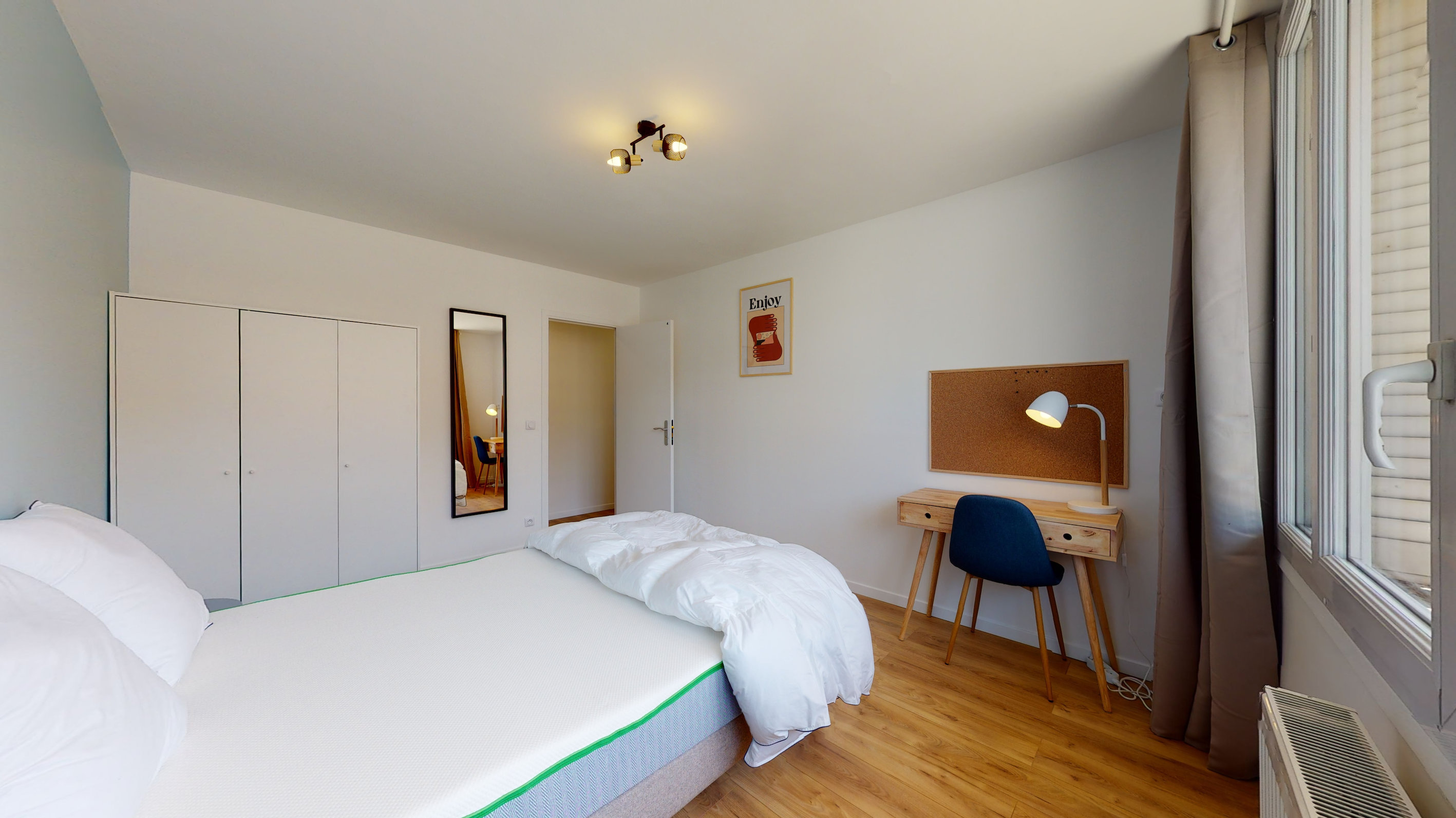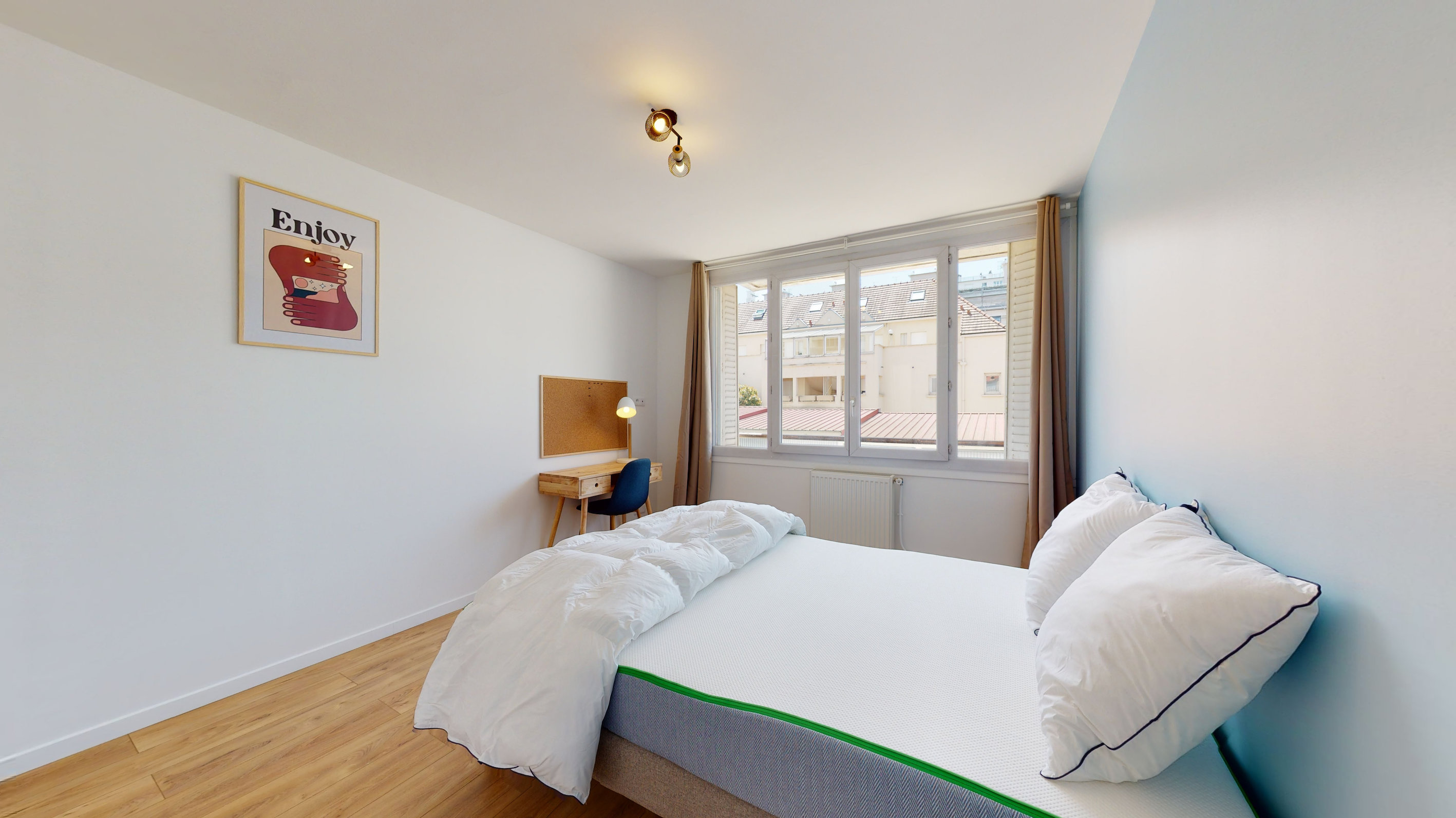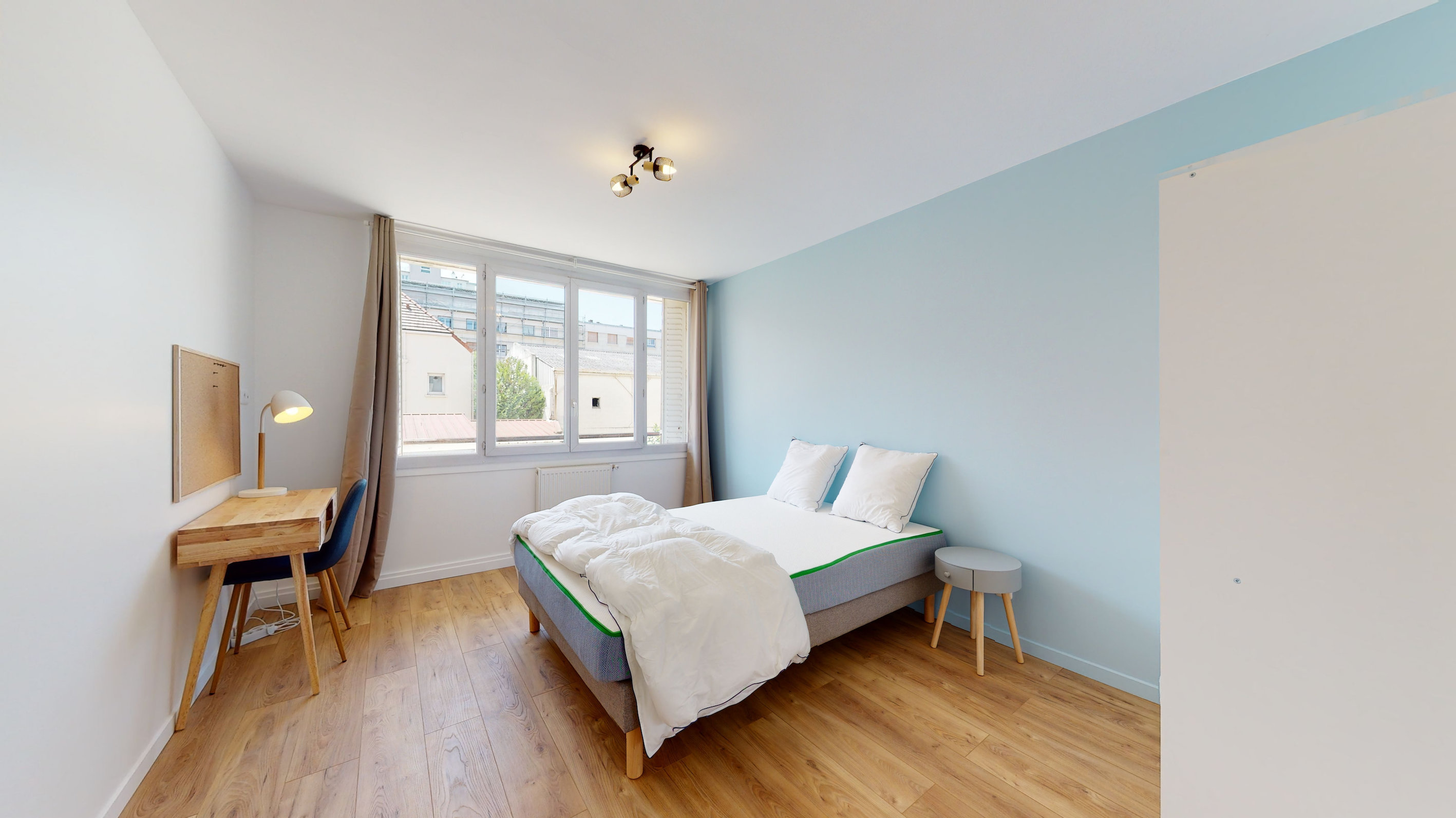 La chambre Room 4, pensée pour une personne, est un véritable cocon de 14m². Elle est meublée d'un lit double confortable, d'une armoire pour vos vêtements, ainsi que d'un bureau et d'une chaise pour étudier ou travailler. La chambre bénéficie aussi d'une salle de bain partagée bien équipée avec douche et toilettes.