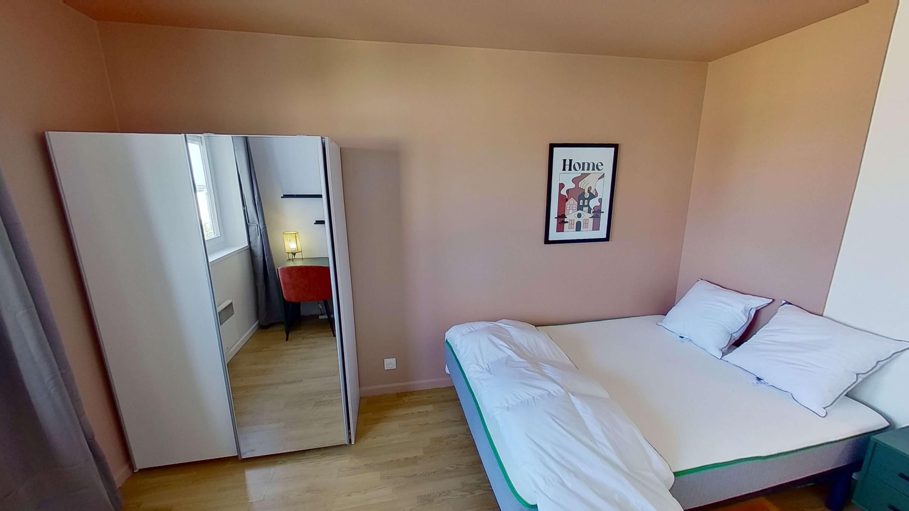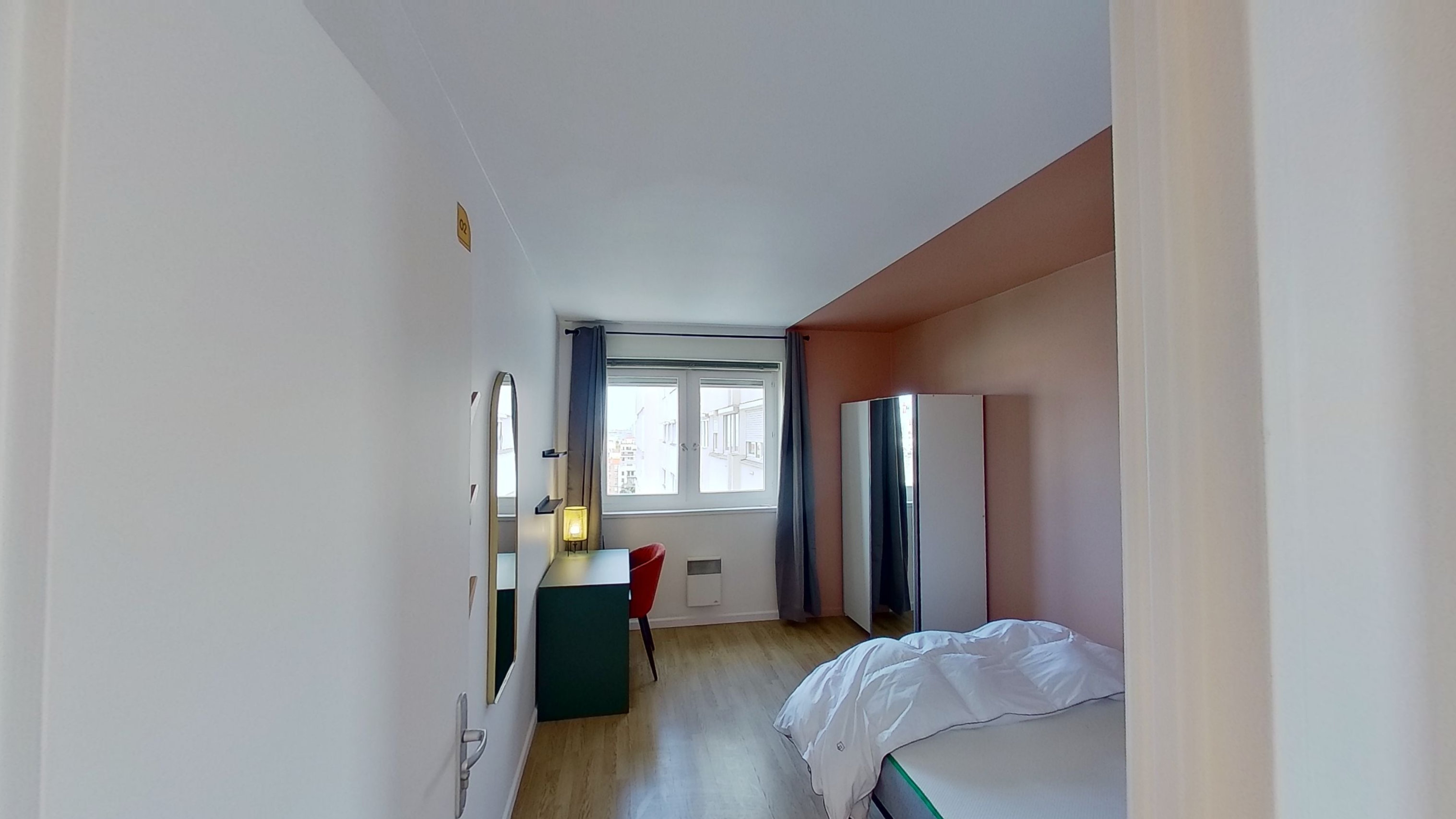 La chambre disponible, Room 2, est idéale pour une personne. Elle comprend un confortable lit double, une grande armoire pour ranger vos affaires, ainsi qu'un bureau et une chaise pour travailler ou étudier en toute tranquillité. Vous y trouverez aussi des étagères murales et tous les accessoires nécessaires à un quotidien pratique.