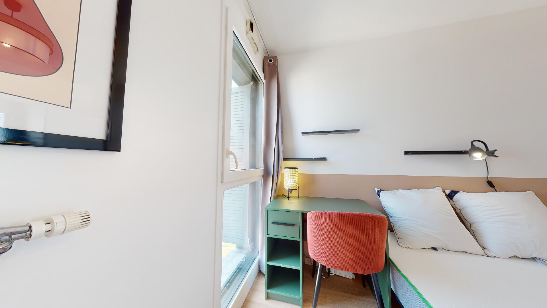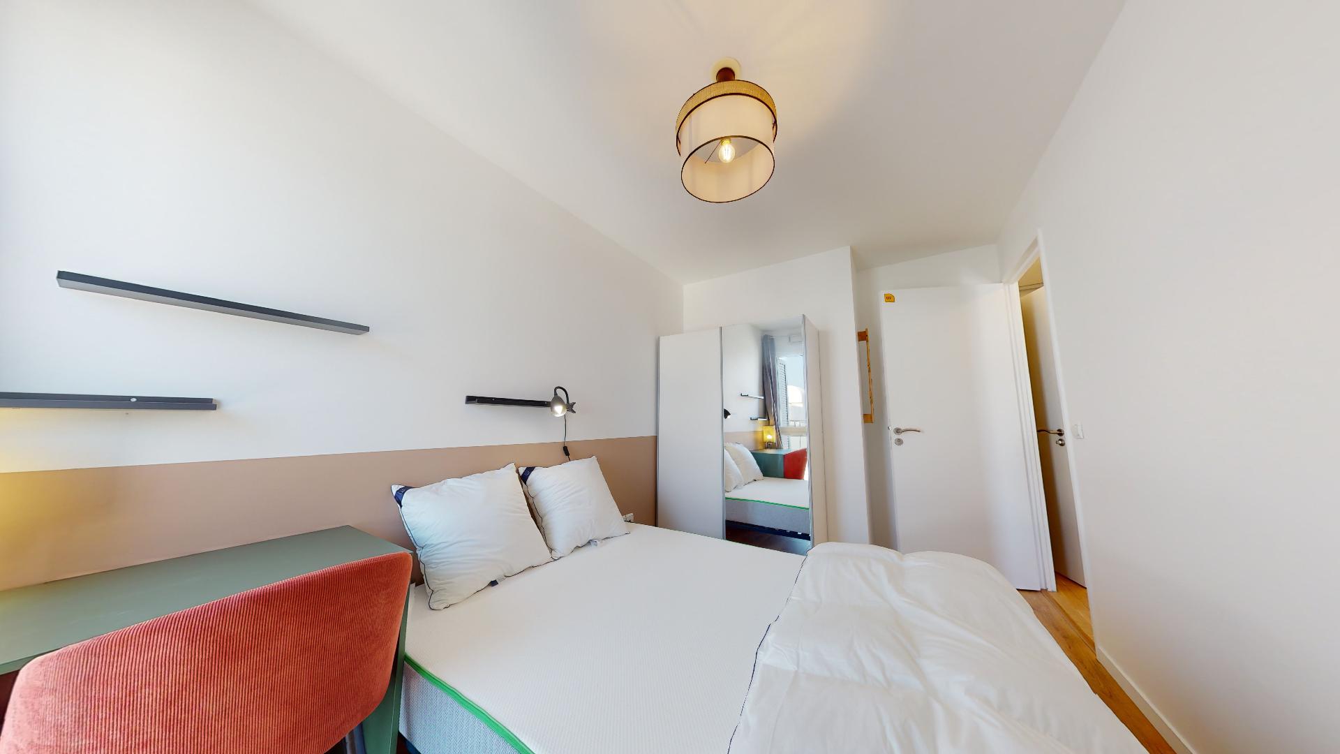 La chambre Room 2 est parfaite pour une personne. Elle est meublée avec un lit double confortable, une armoire pour vos affaires, un bureau et une chaise pour travailler ou étudier, et tout ce qu'il faut pour se sentir à l'aise. Elle partage une salle de bain propre et pratique avec les autres locataires.